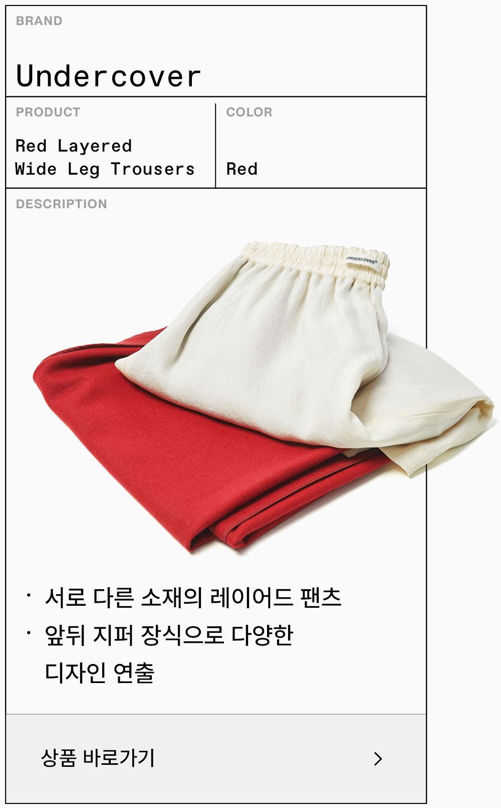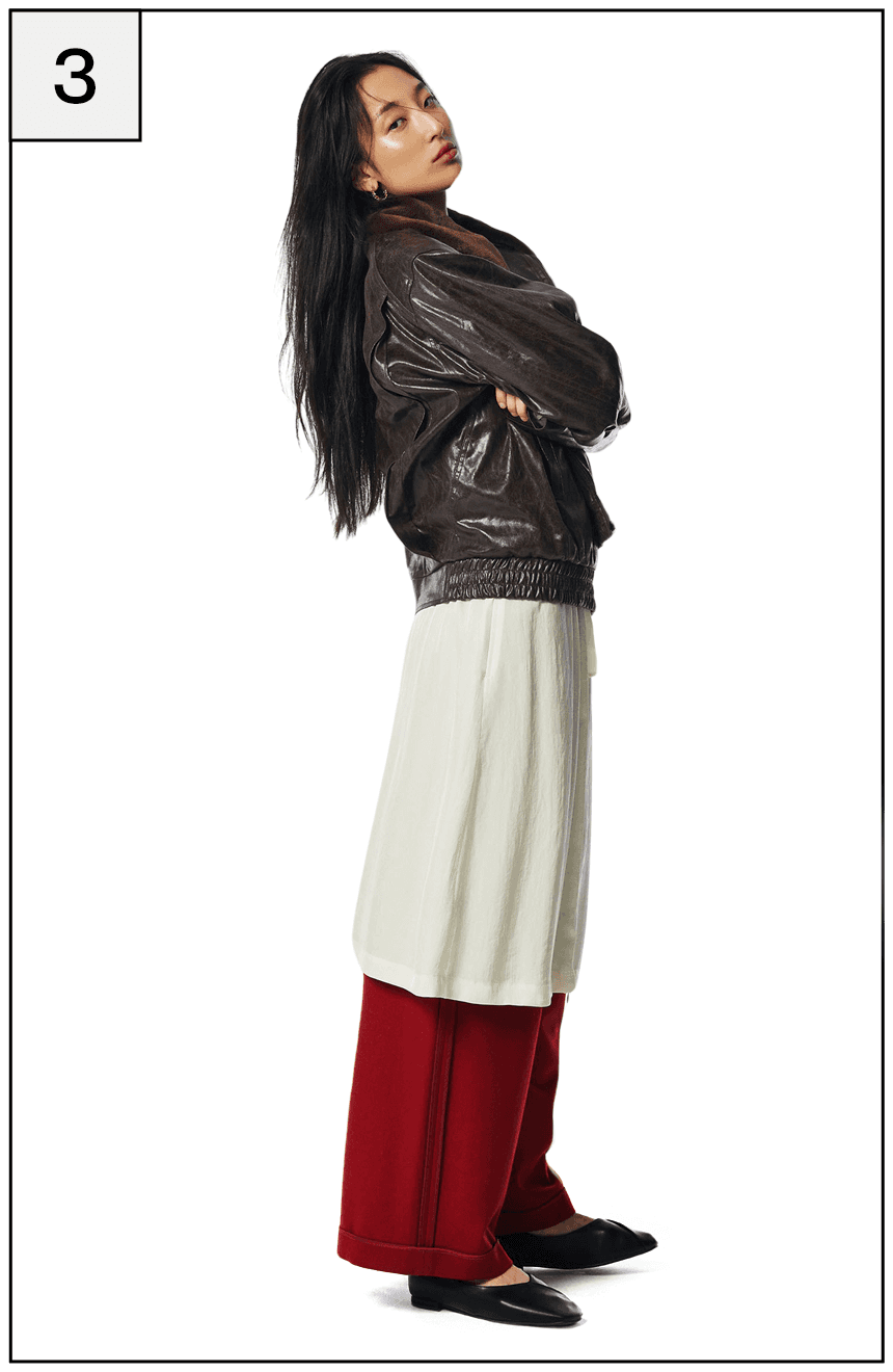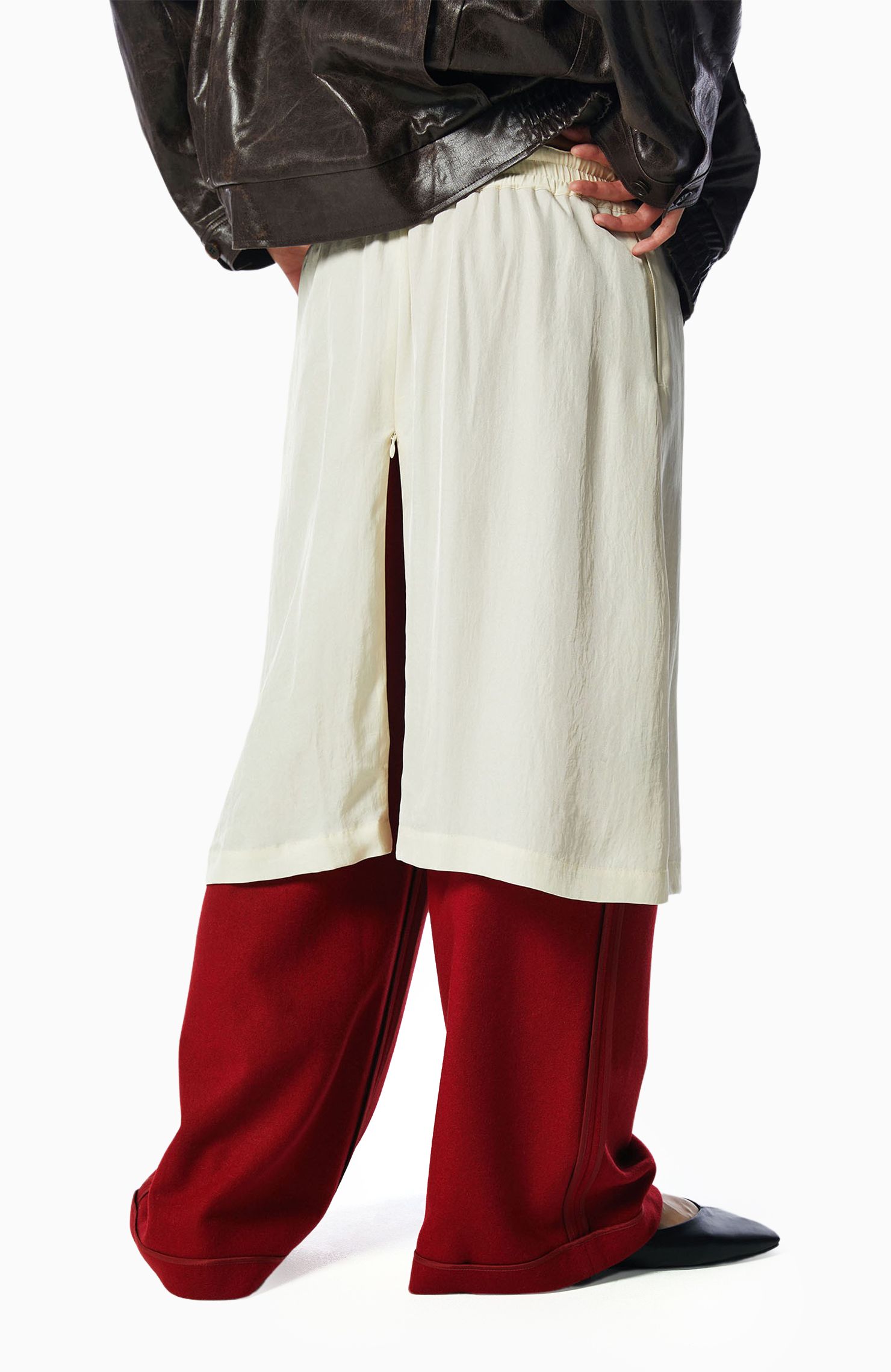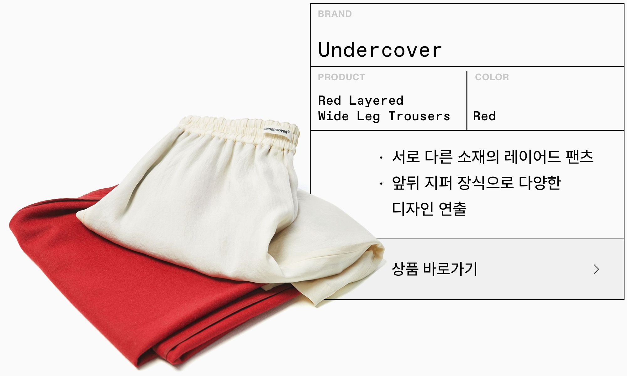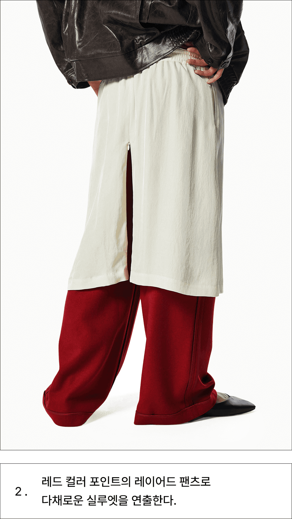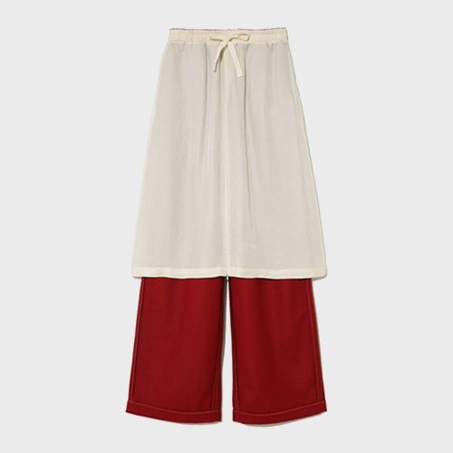 레드 컬러 포인트의 레이어드 팬츠로 다채로운 실루엣을 연출한다.