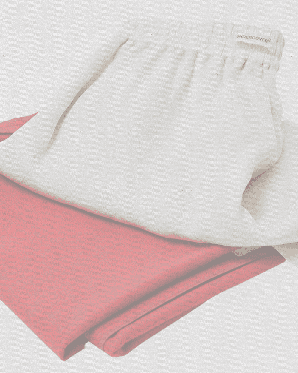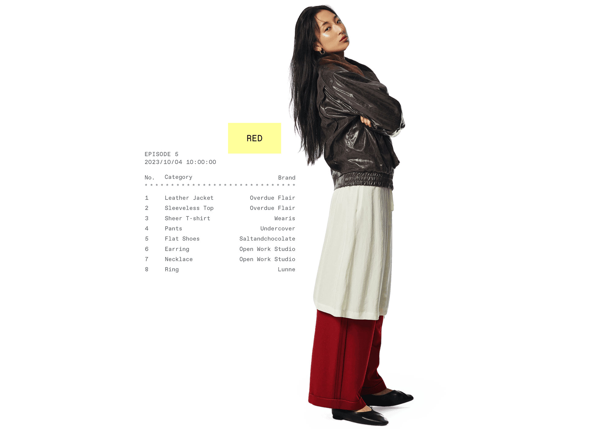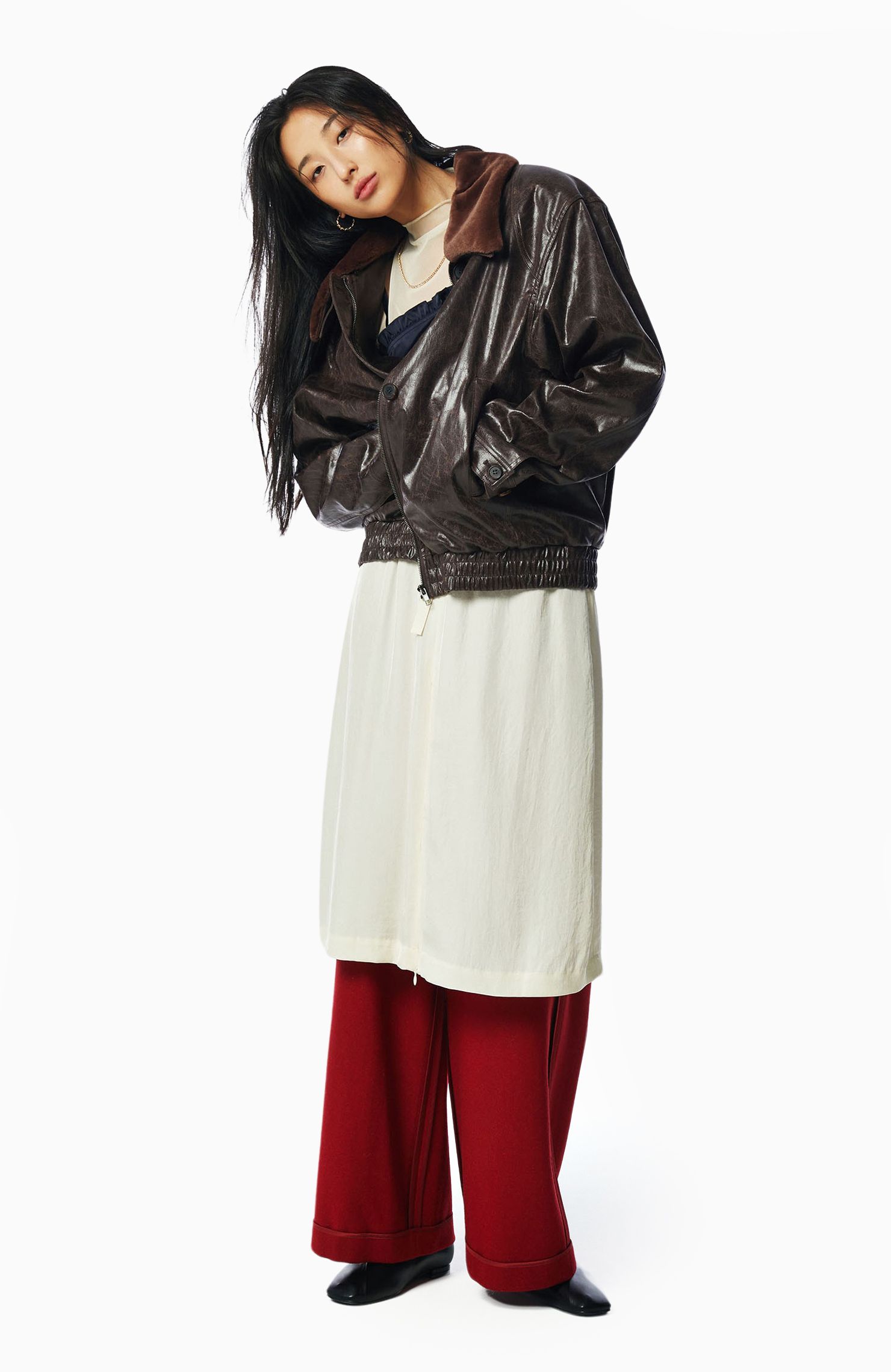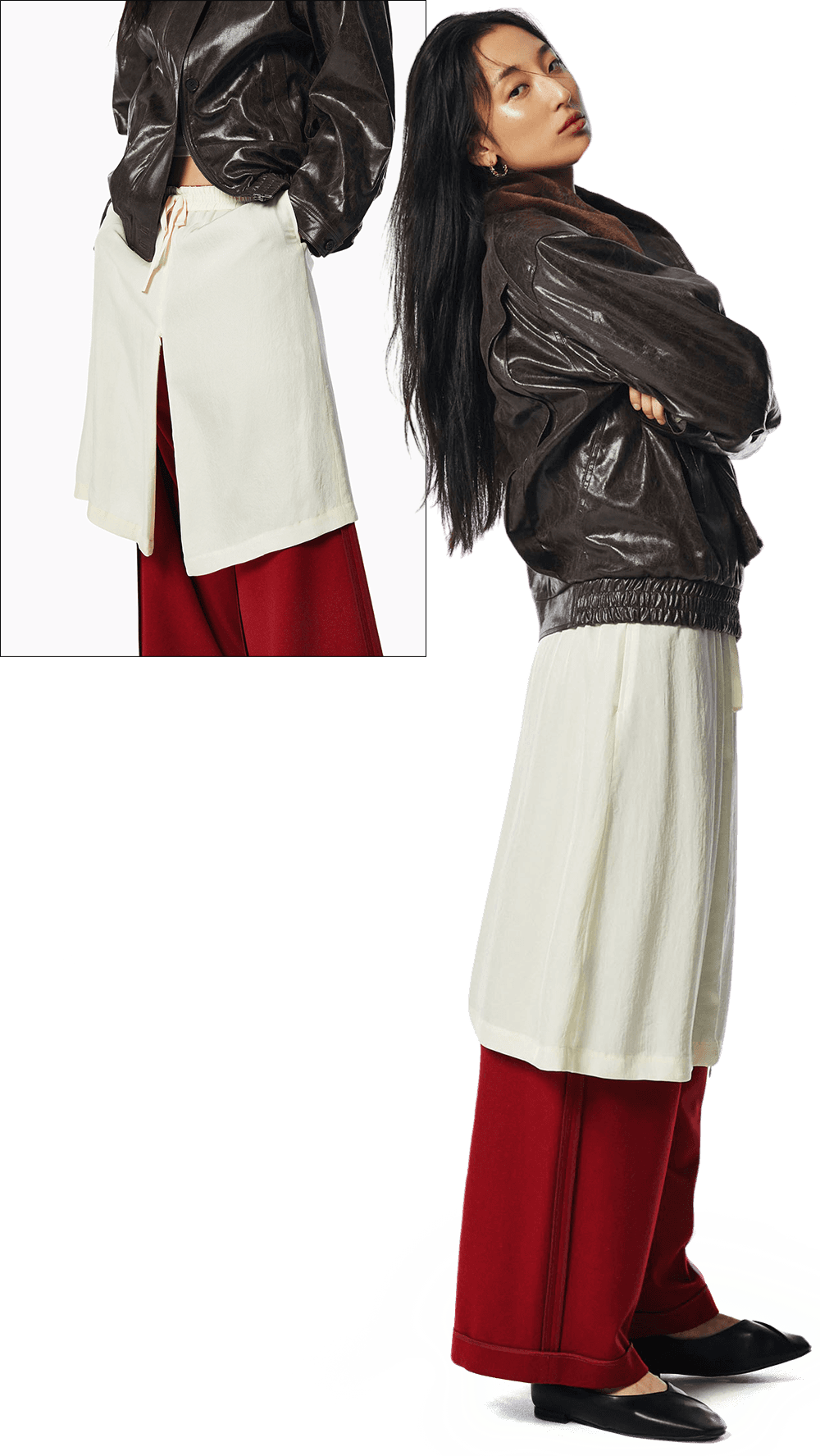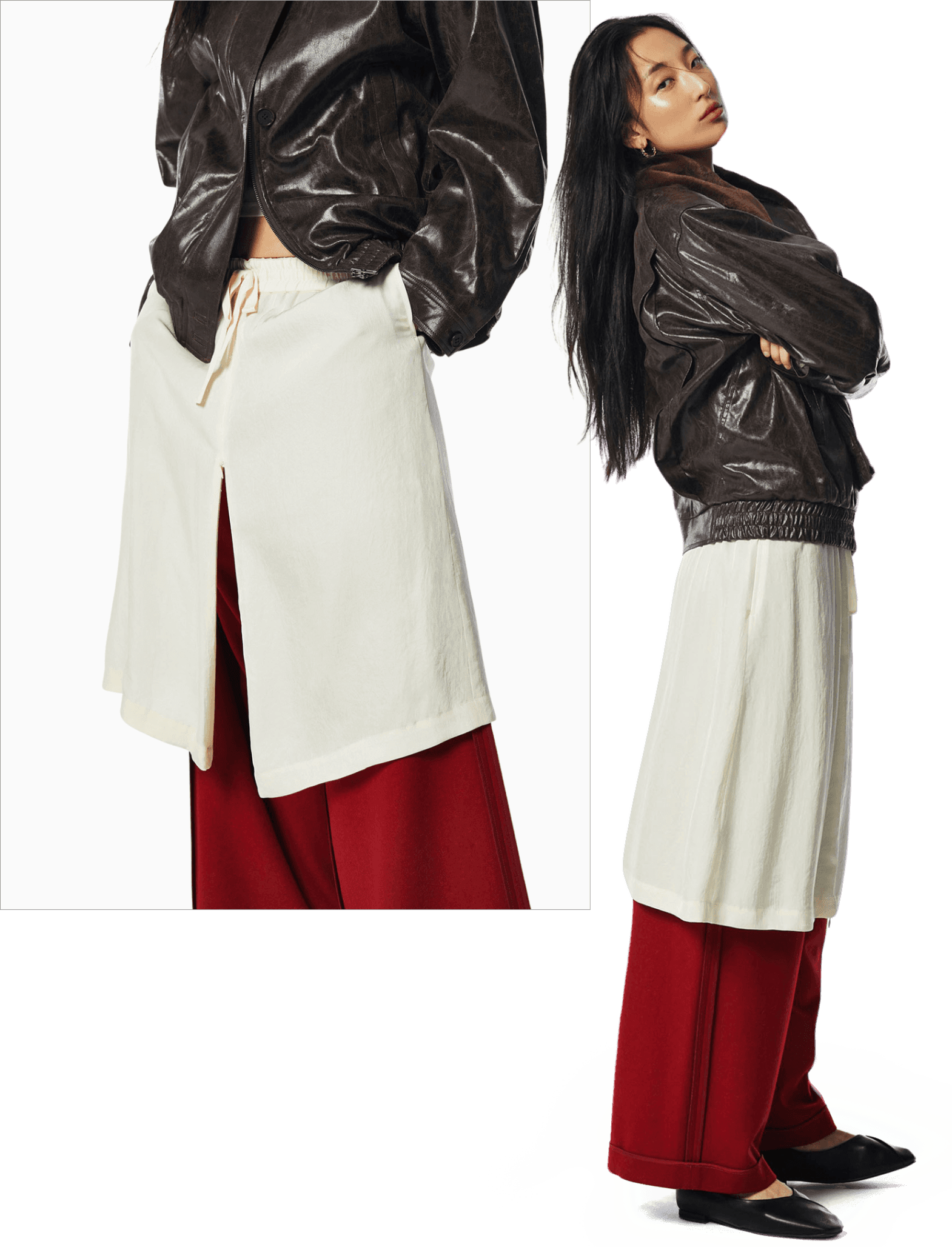 레드 컬러 포인트의 레이어드 팬츠로 다채로운 실루엣을 연출한다.