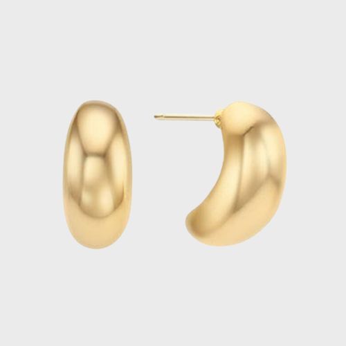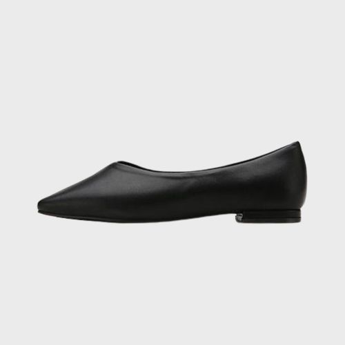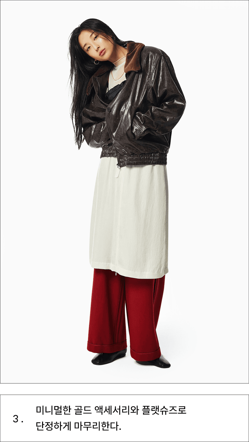 미니멀한 골드 액세서리와 플랫슈즈로 단정하게 마무리한다.