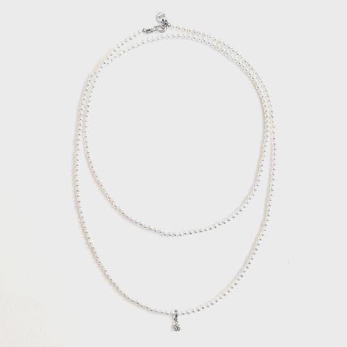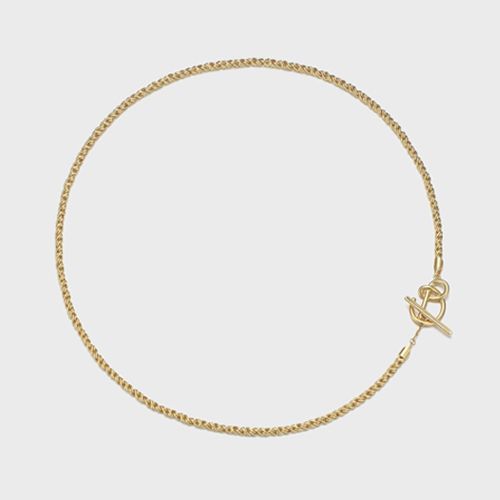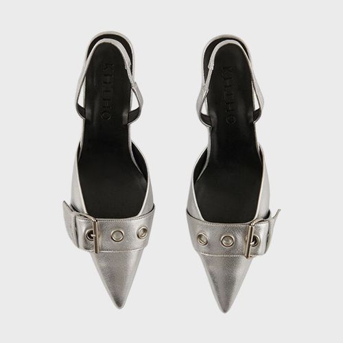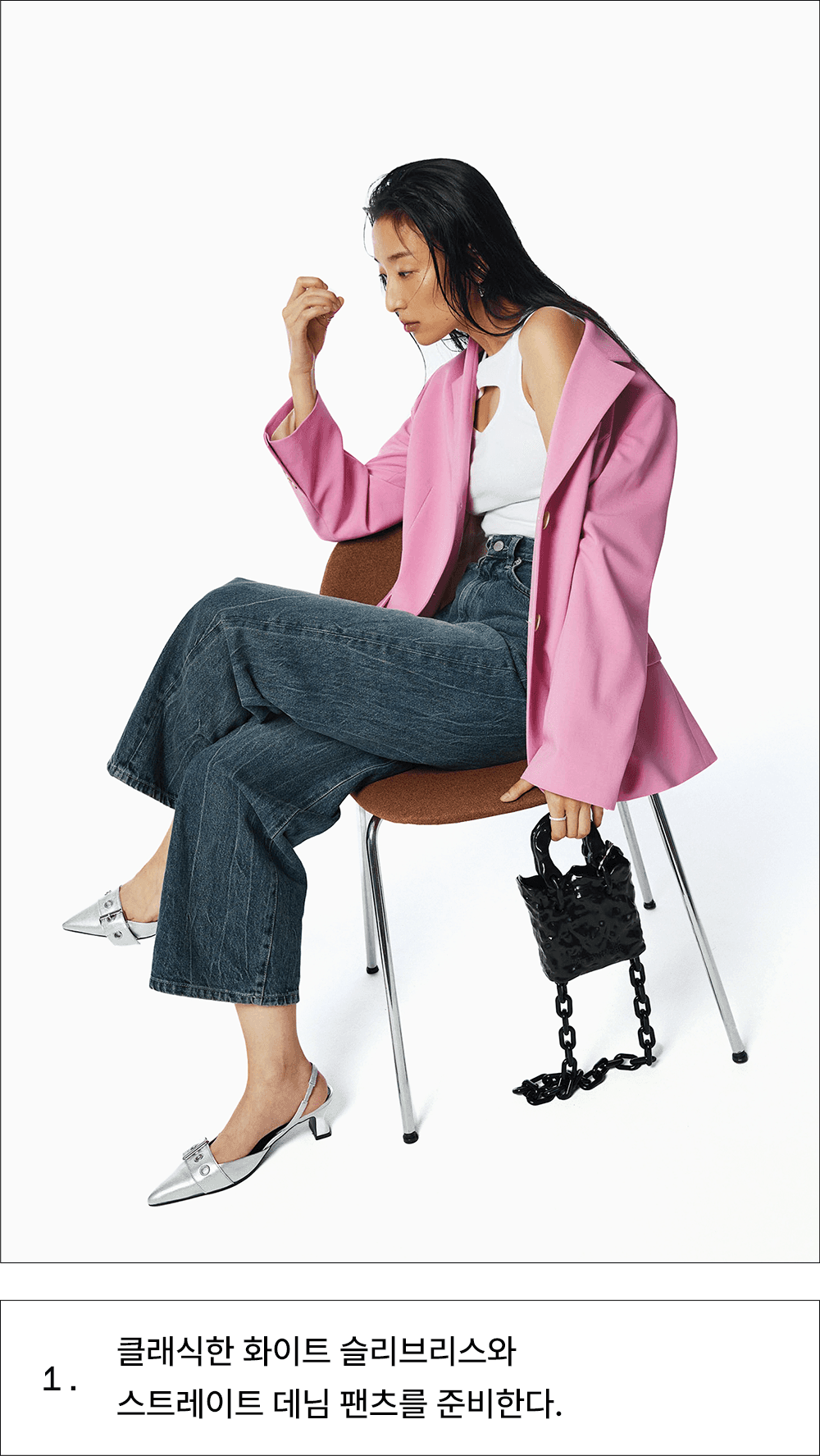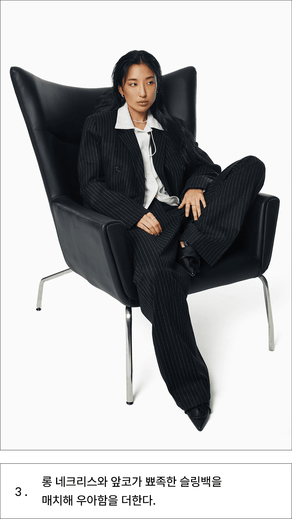롱 네크리스와 앞코가 뾰족한 슬링백을 매치해 우아함을 더한다.