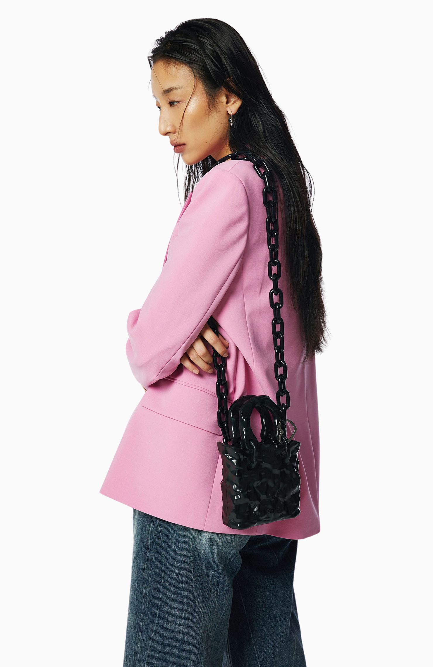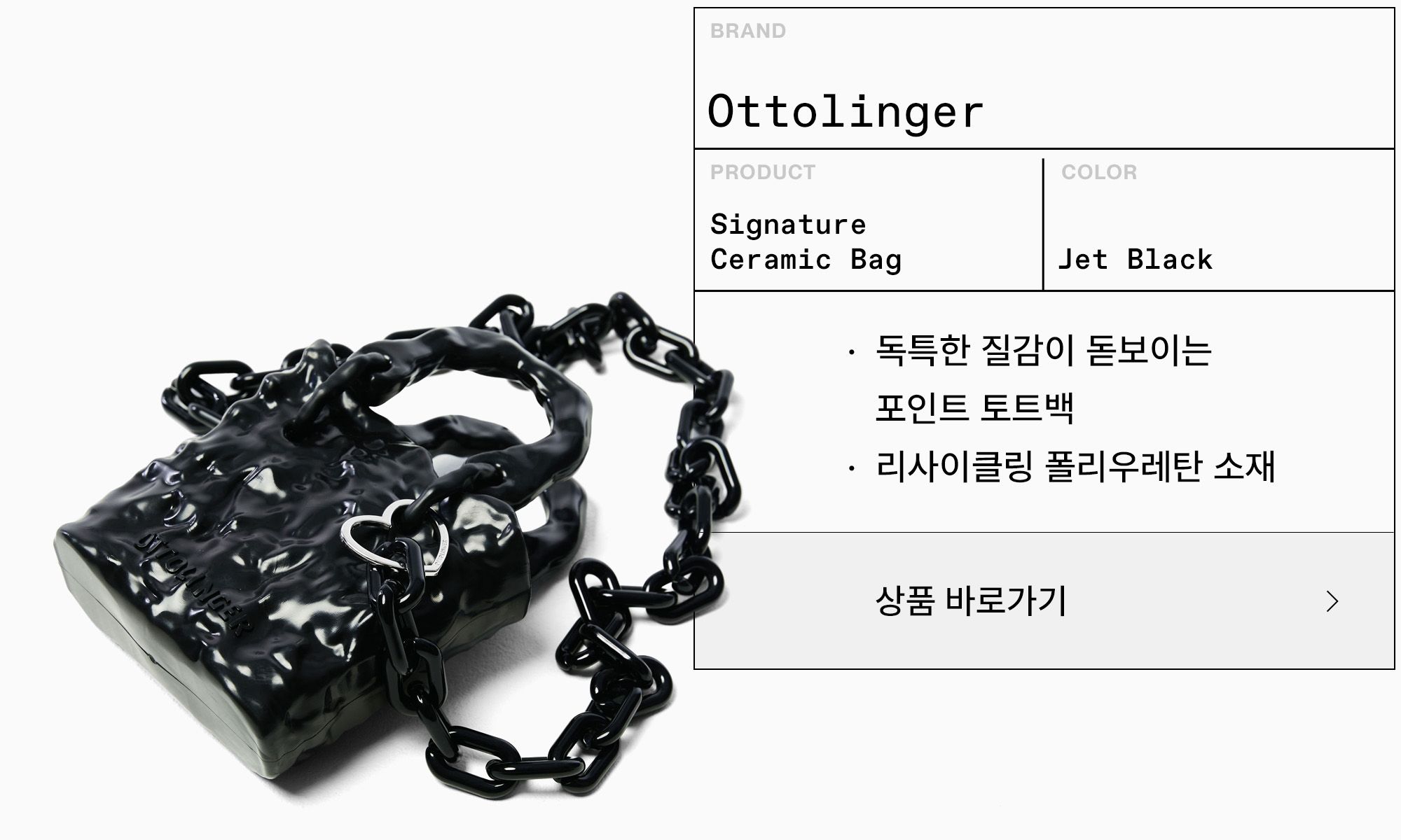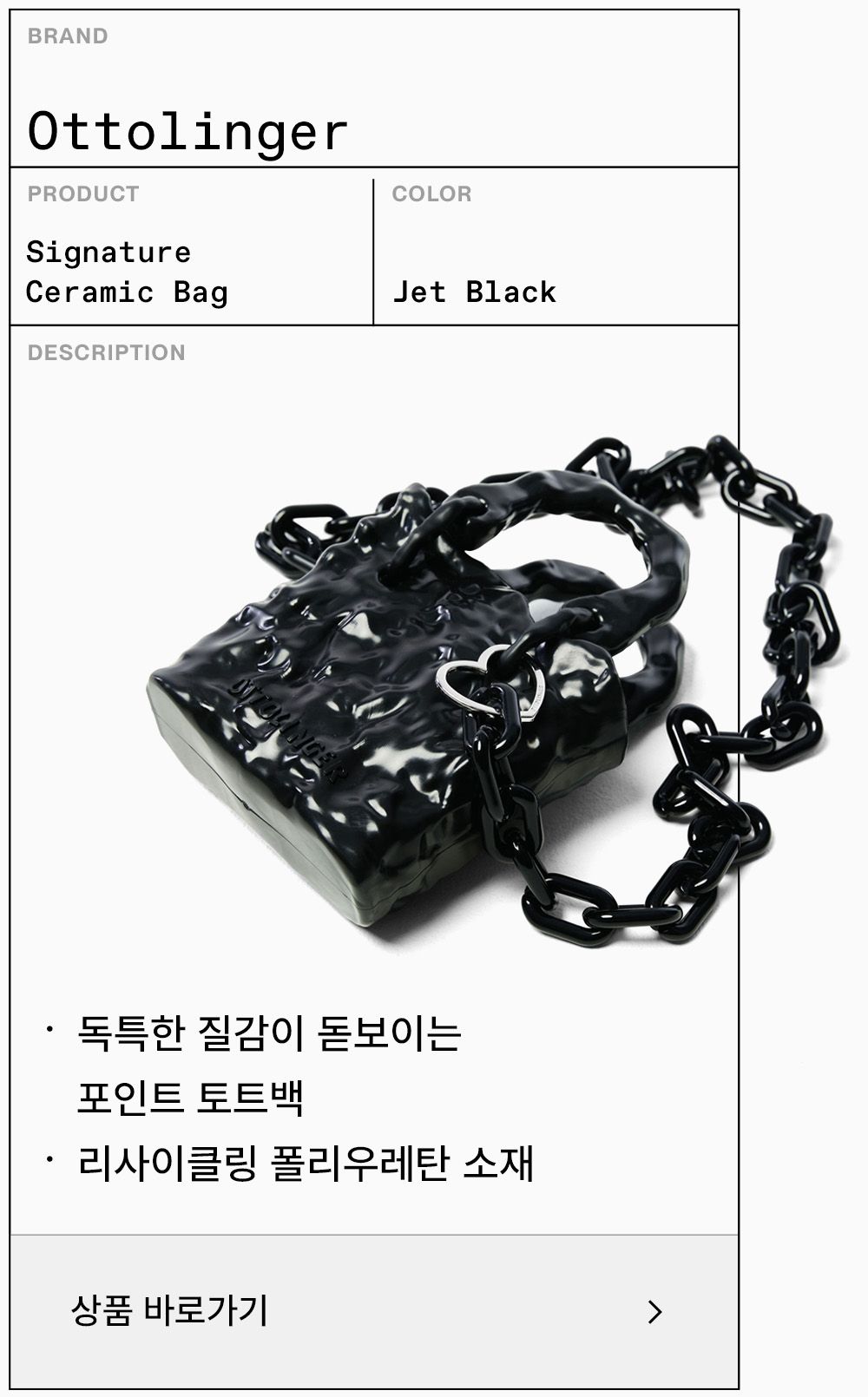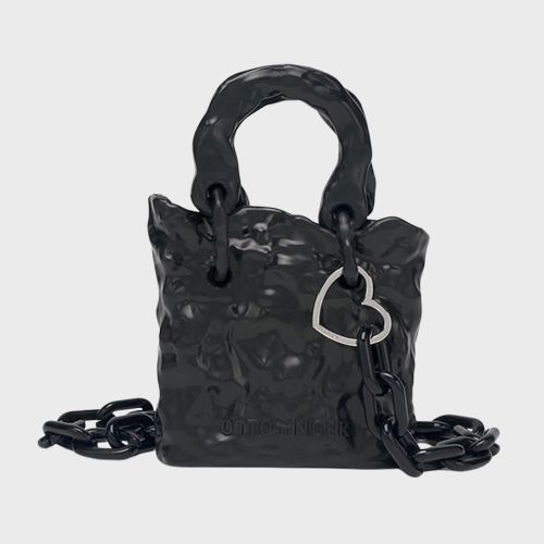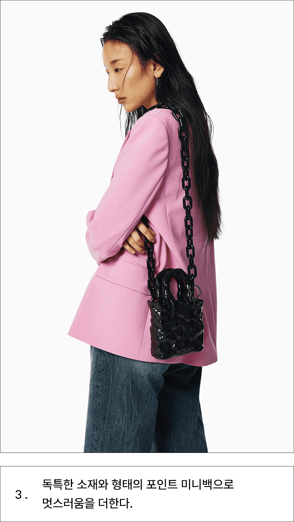 독특한 소재와 형태의 포인트 미니백으로 멋스러움을 더한다.