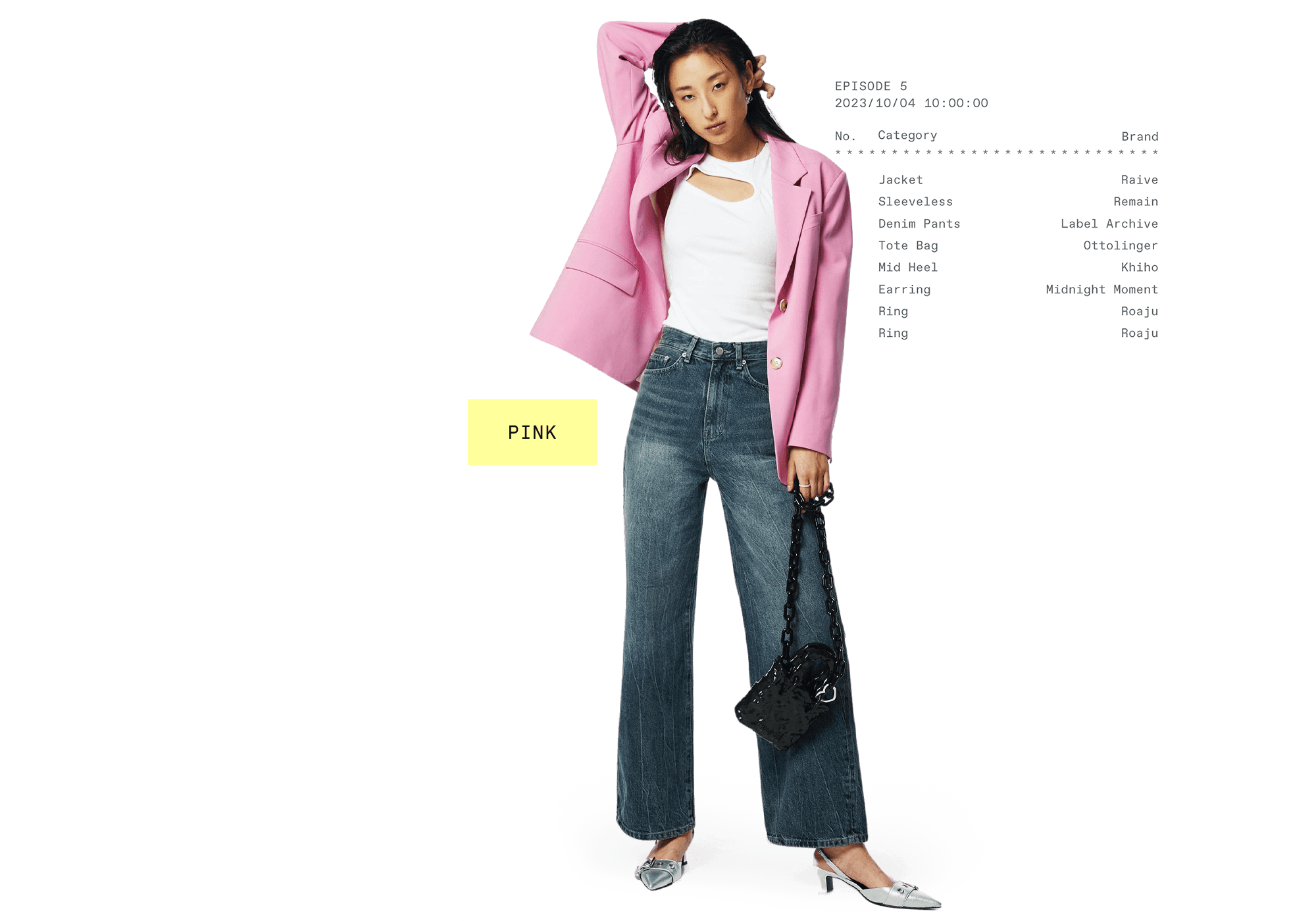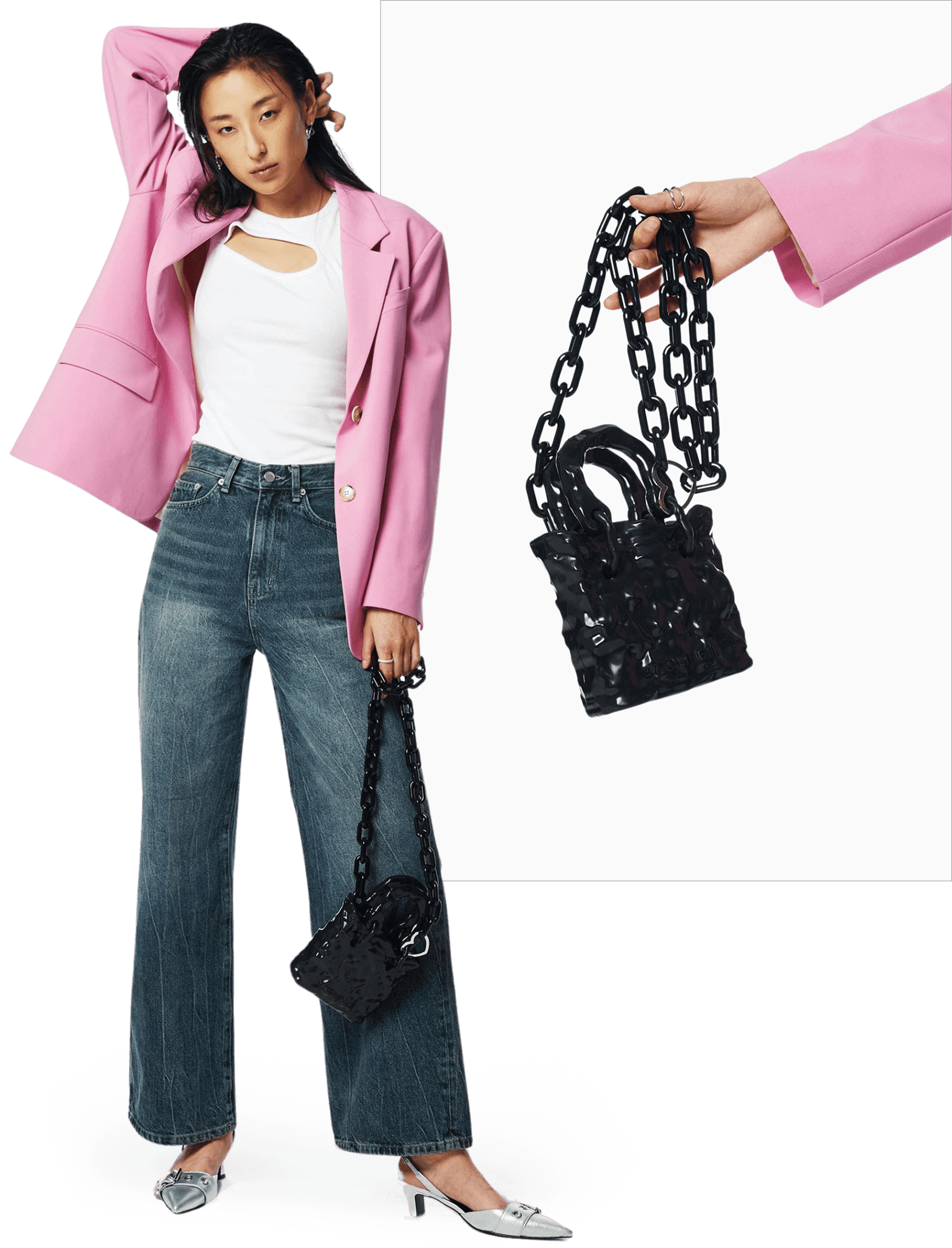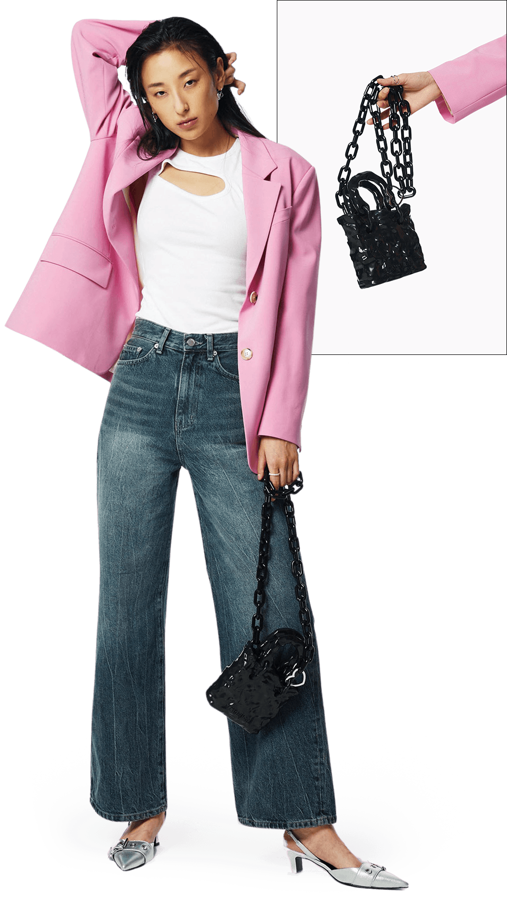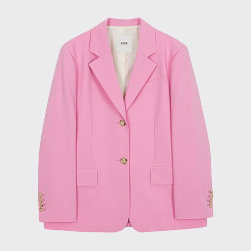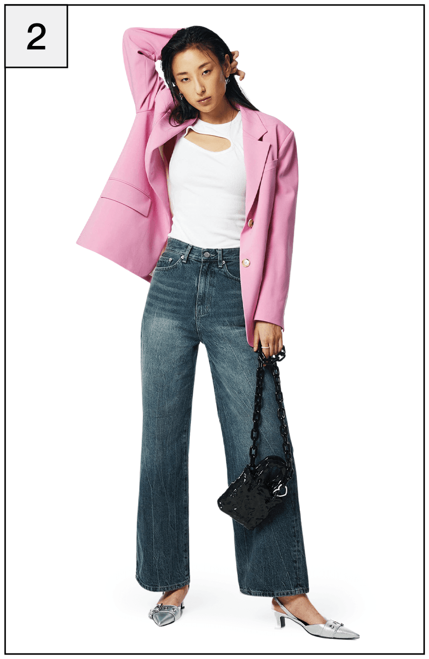 핑크 톤의 테일러드 재킷을 매치해 룩 전체에 생기를 불어넣는다.