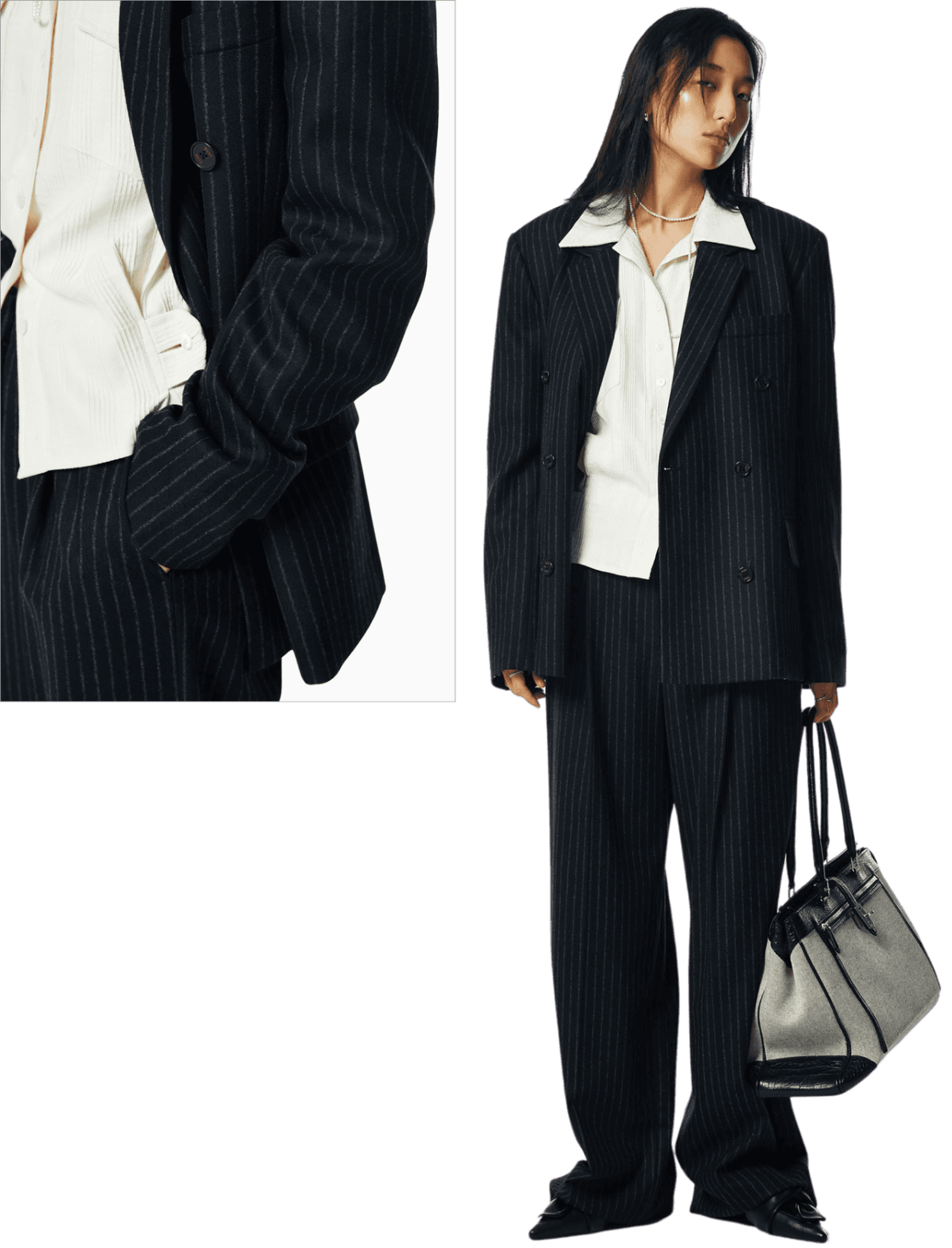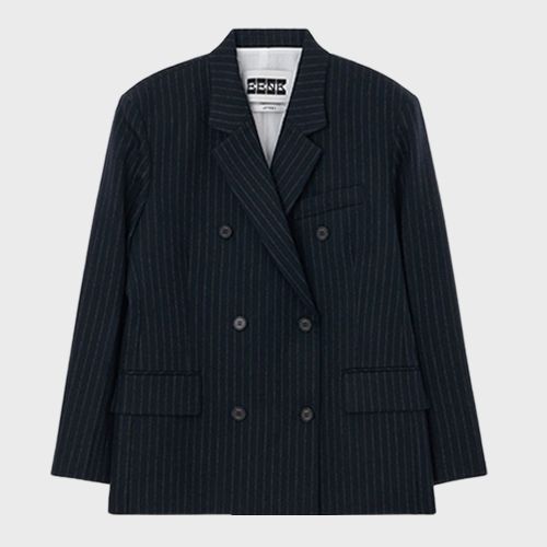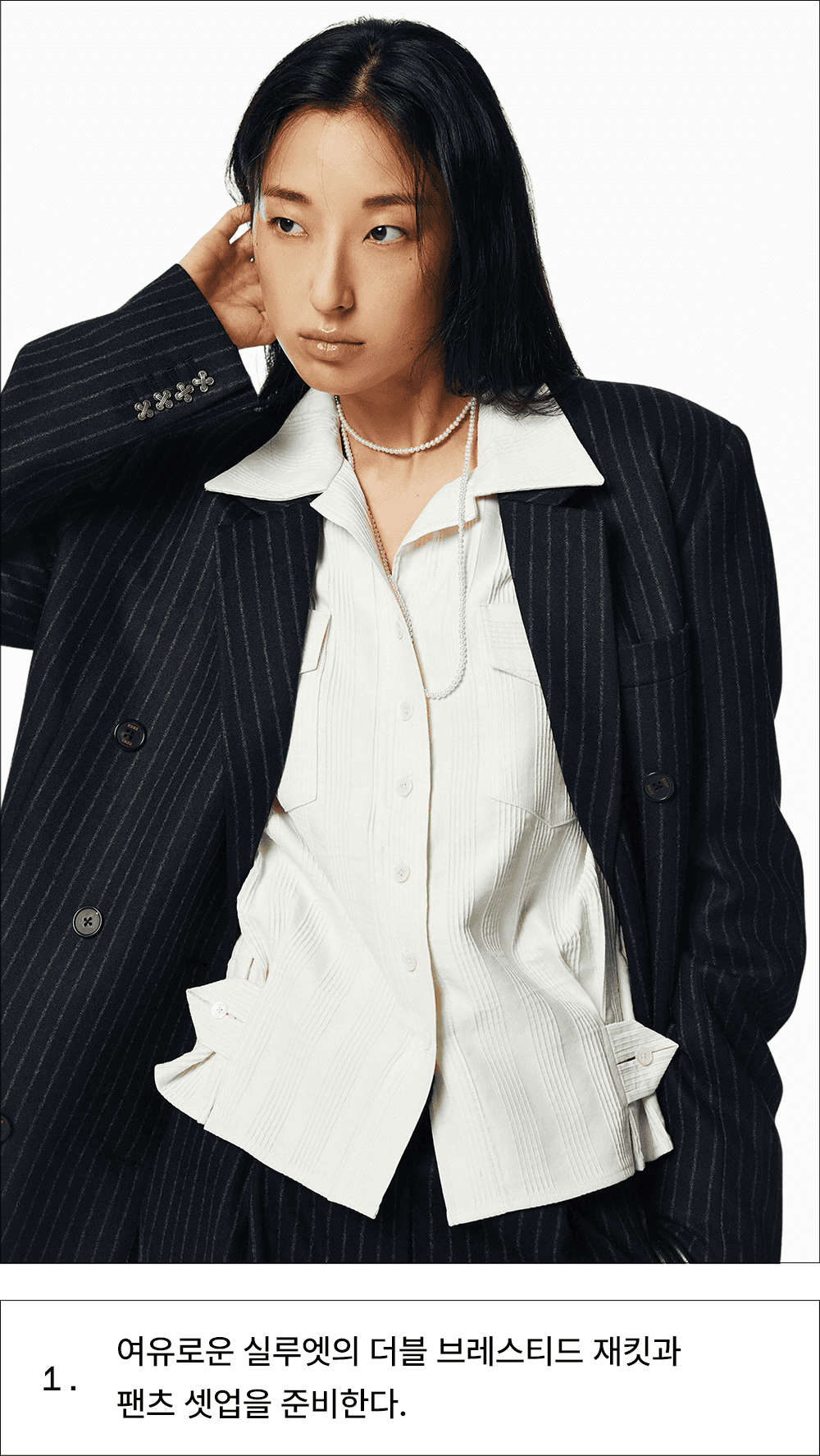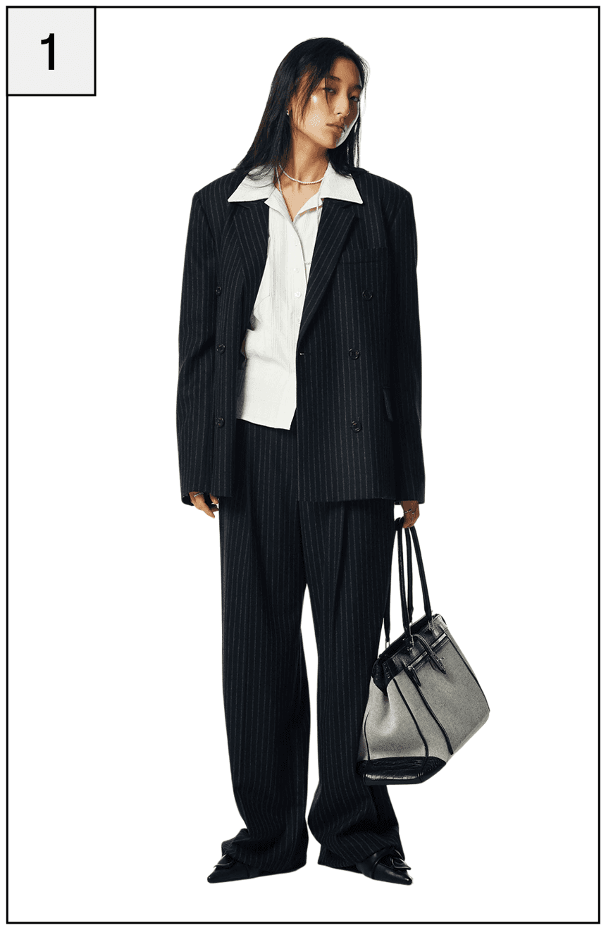 여유로운 실루엣의 더블 브레스티드 재킷과 팬츠 셋업을 준비한다.
