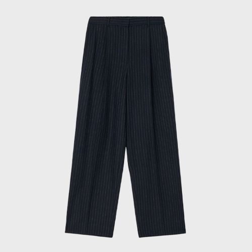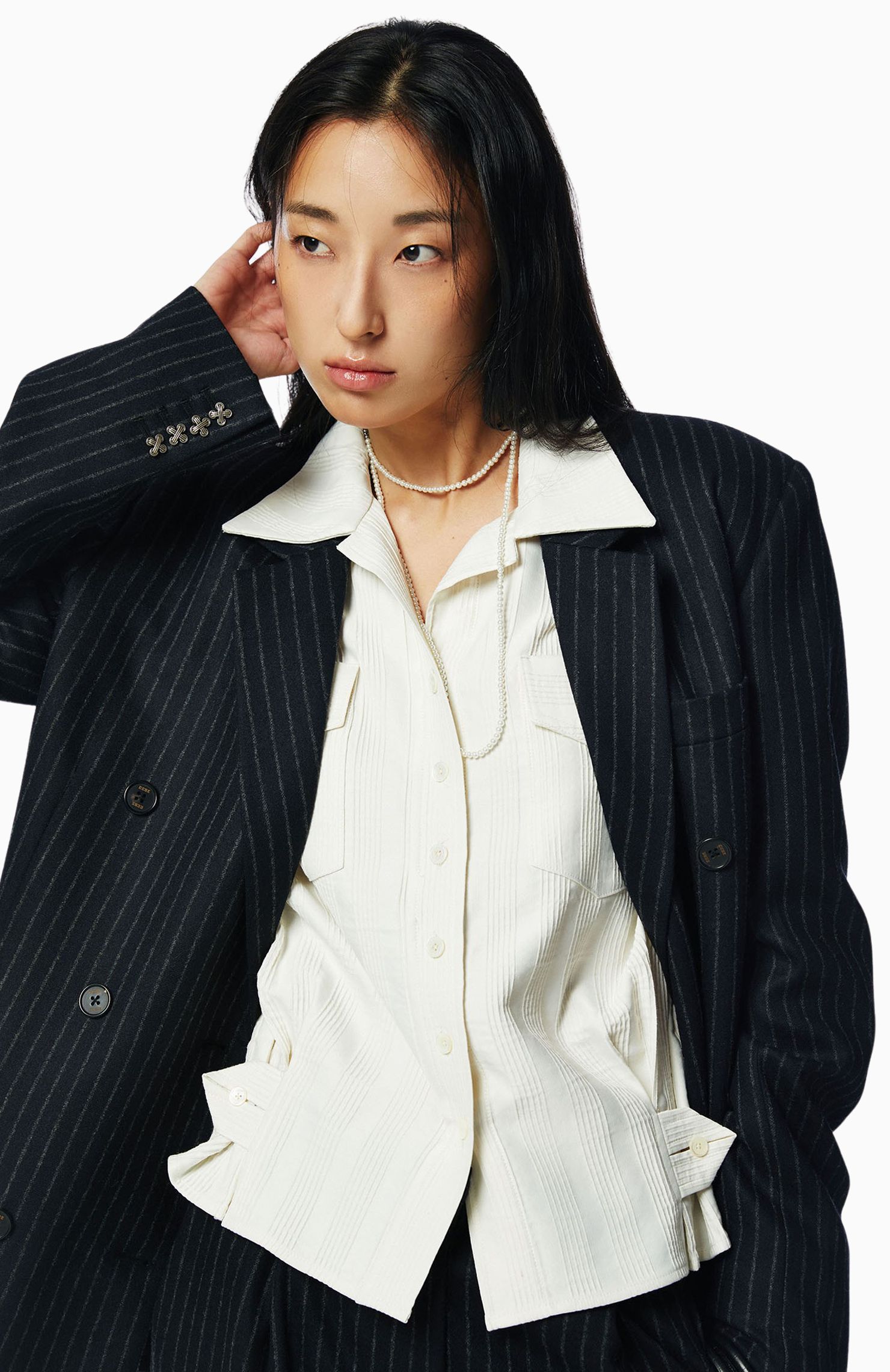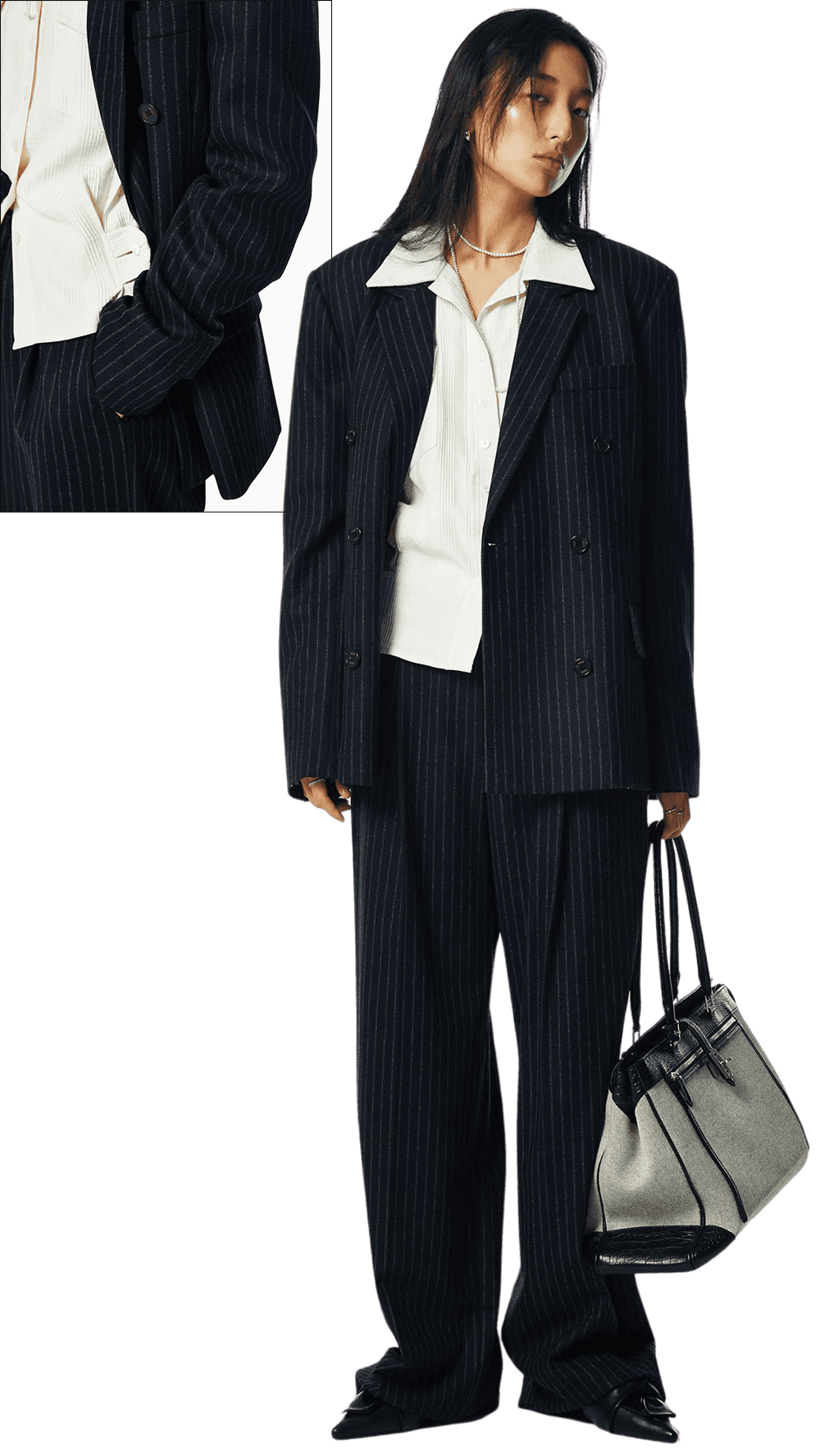 여유로운 실루엣의 더블 브레스티드 재킷과 팬츠 셋업을 준비한다.