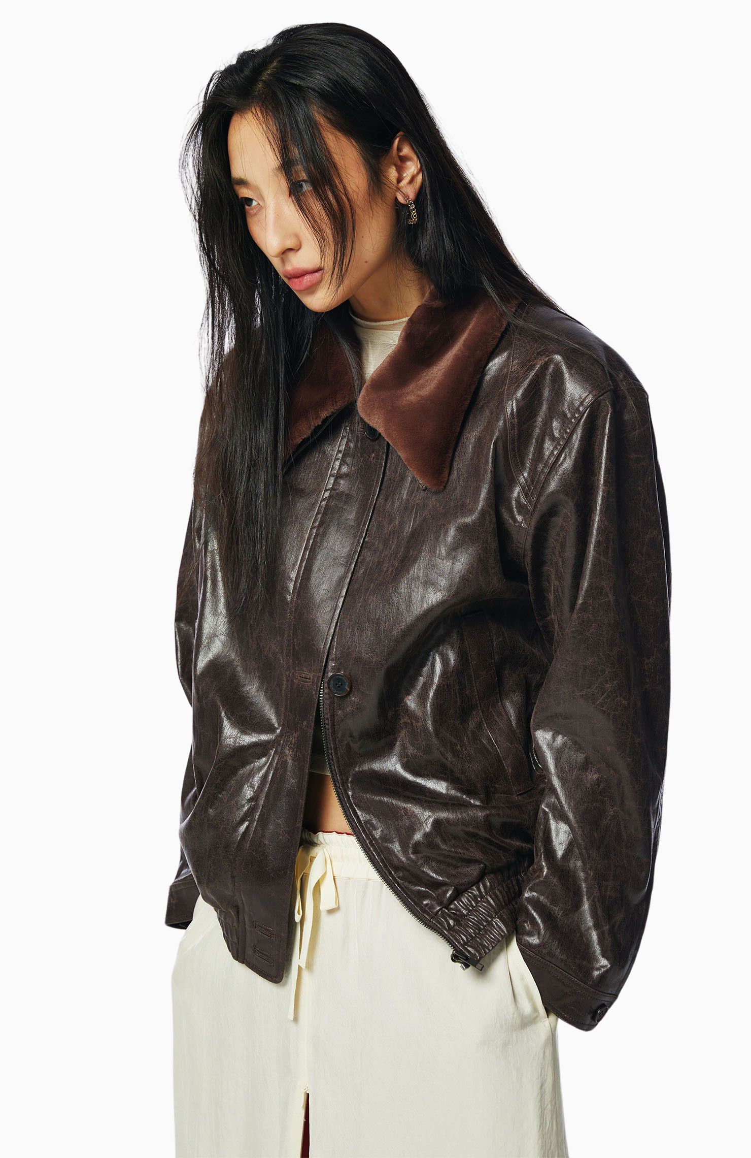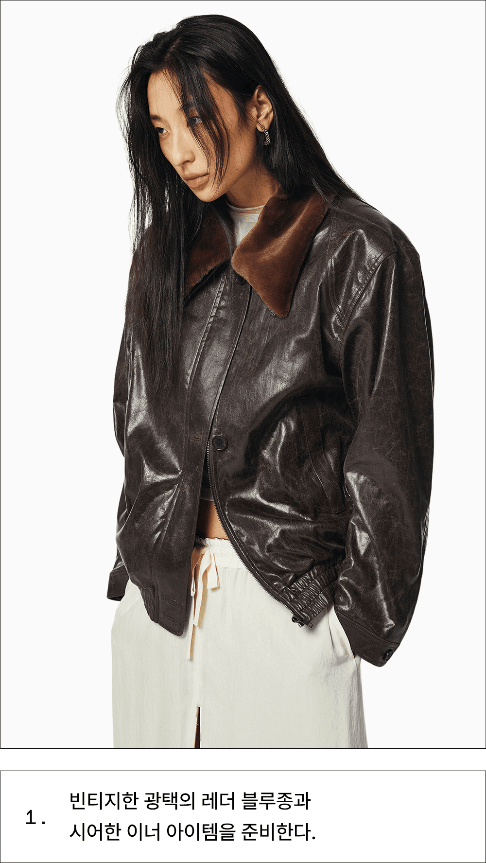 빈티지한 광택의 레더 블루종과 시어한 이너 아이템을 준비한다.