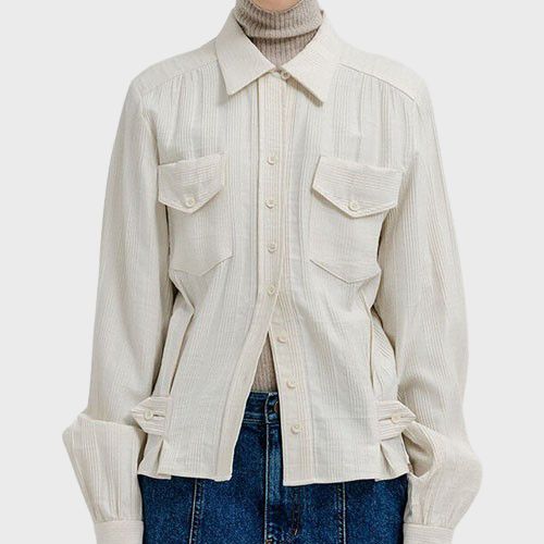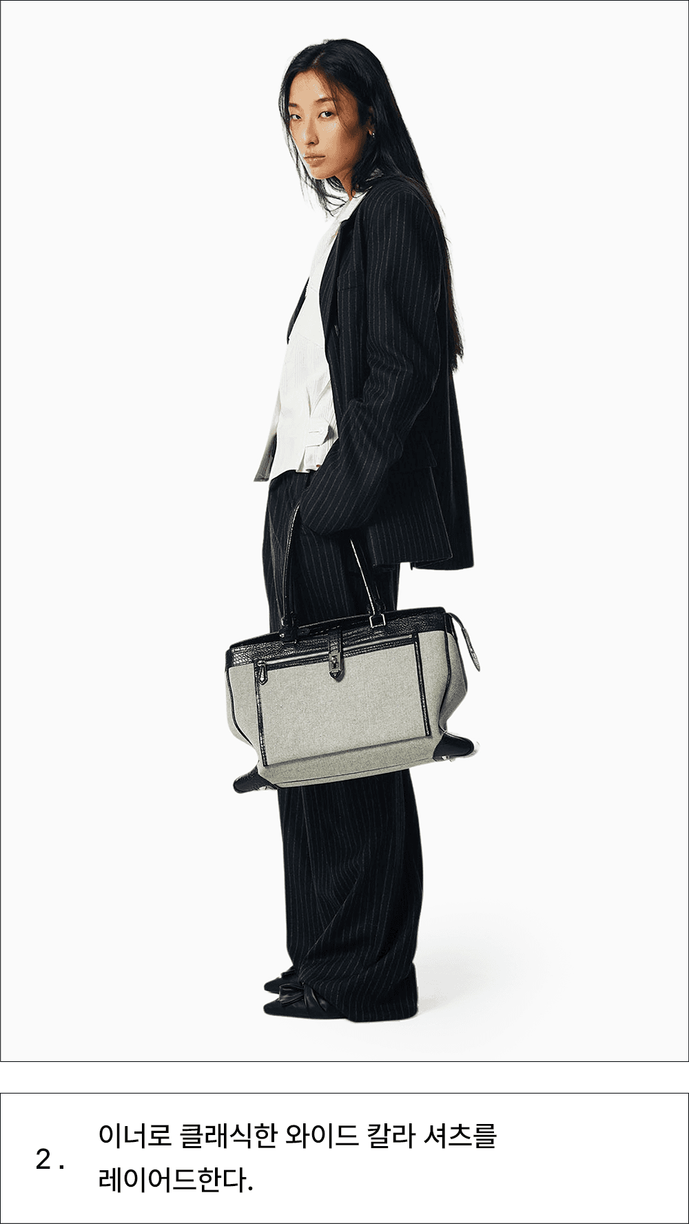 이너로 클래식한 와이드 칼라 셔츠를 레이어드한다.