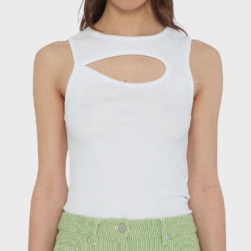 클래식한 화이트 슬리브리스와 스트레이트 데님 팬츠를 준비한다.