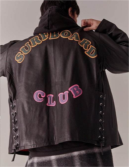 스케이트보드 문화는 지금까지도 하이패션의 영감의 대상이 되고 있습니다. 패션과 문화의 경계를 흐리고 자연스레 융합되어 하나의 새로운 스타일이 탄생되죠. 펑크 요소가 돋보이는 그래픽, 자유분방한 빈티지한 무드는 젊음 안에서 유영하는 스케이트 보더의 초상이기도 합니다. 스톡홀름서핑보드클럽의 그래픽 레터링이 돋보이는 레더 재킷과 반스 스니커즈만 있다면 개성 가득한 스케이트 보더 룩을 완성할 수 있어요.