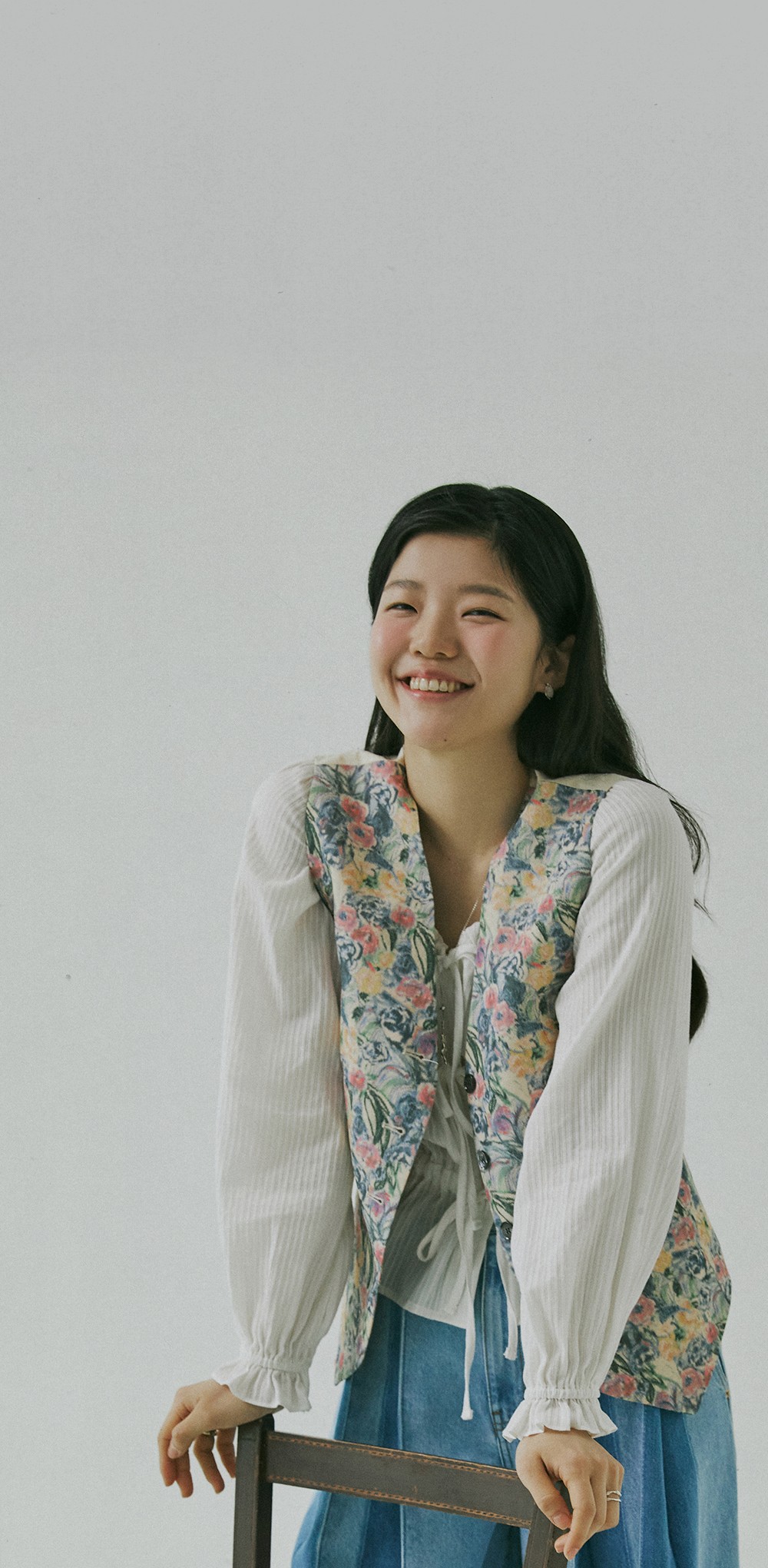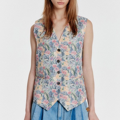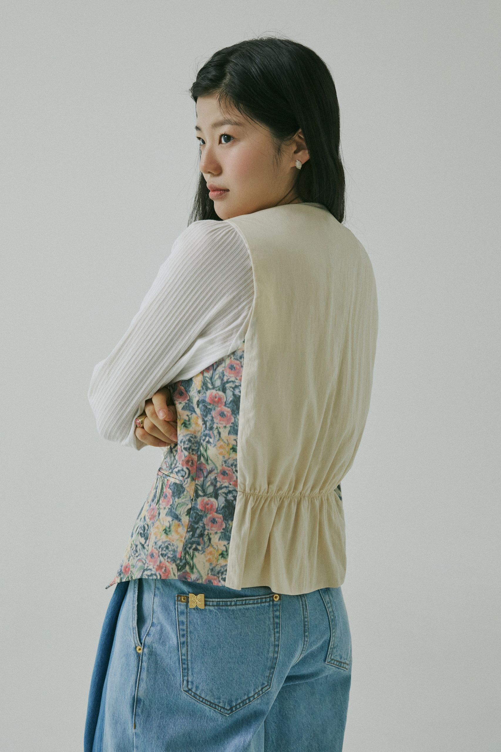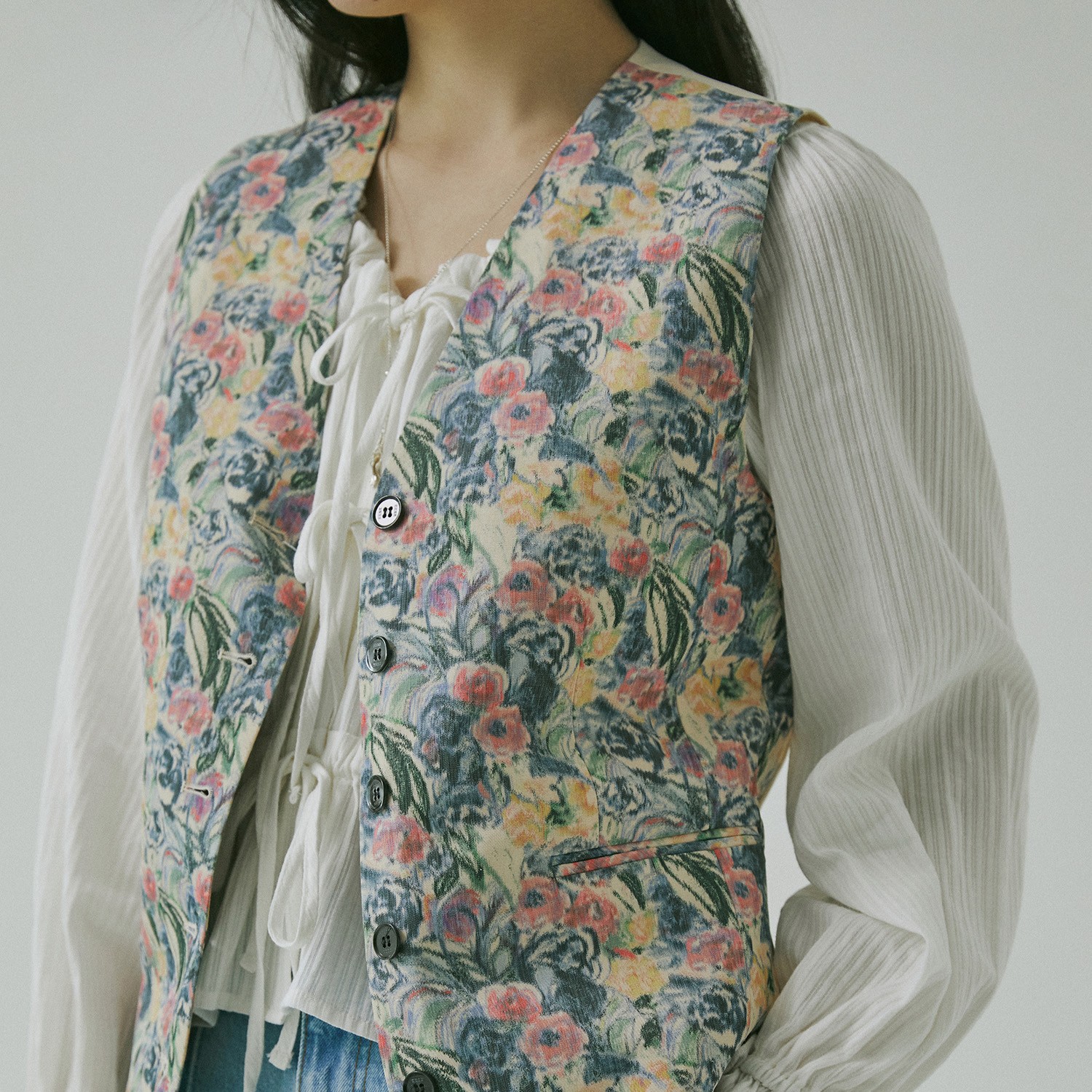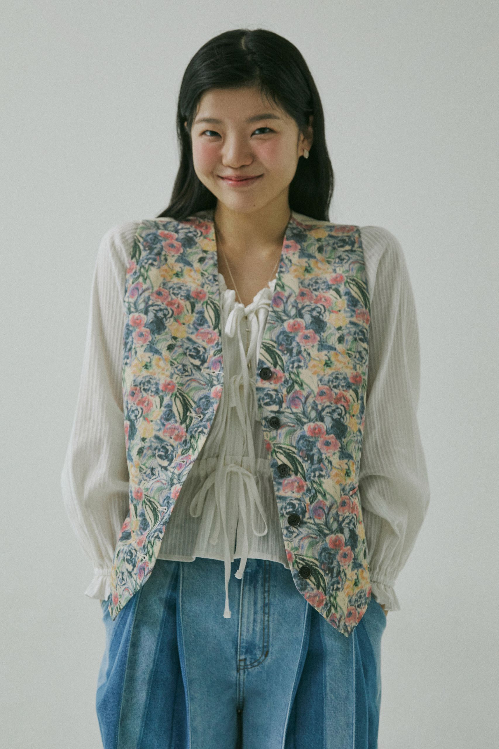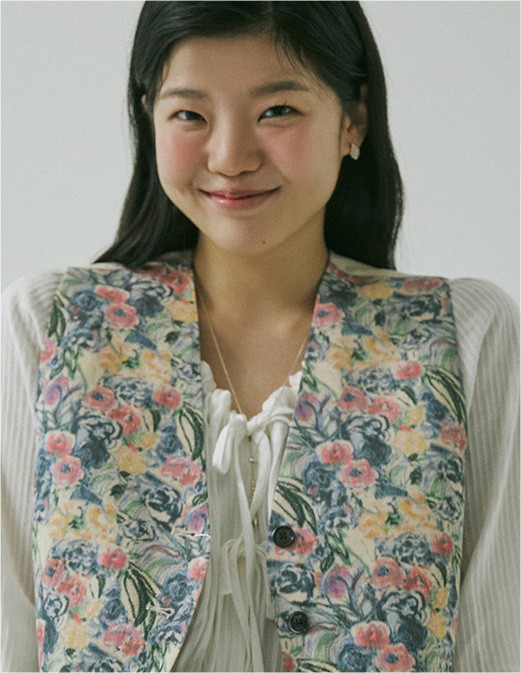 리본 매듭이 나풀거리는 넓은 소맷자락의 블라우스와 그 위에 걸친 수트 베스트는 마치 19세기 빅토리아 시대의 남성을 주인공으로 한 고전 영화에서 볼법한 클래식 아이템이죠. 영화 <작은아씨들>처럼 오래된 영화 속에 등장하는 스타일을 동경해 본 적이 있다면, 소재와 디자인을 자유롭게 선택해 나만의 코티지 스타일로 색다르게 연출해 보세요. 빈티지한 색감의 플로럴 패턴을 입은 수트 베스트와 데님 팬츠의 조화는 우아하고 온화한 숙녀의 모습을 떠올리게 해요.