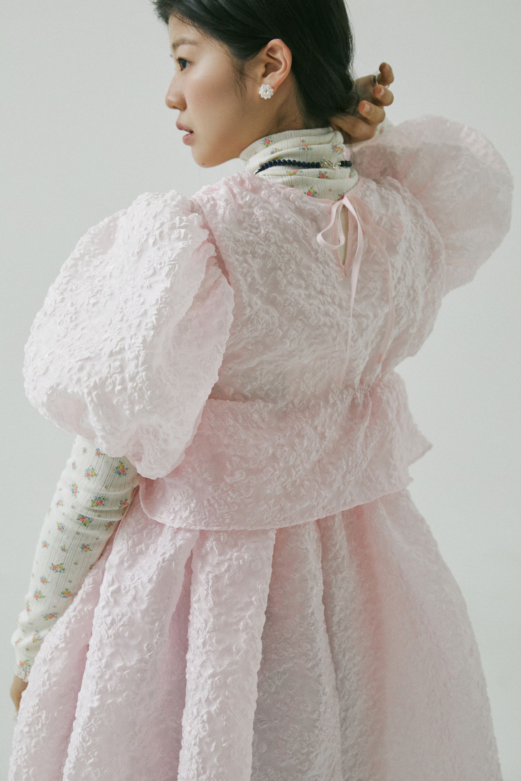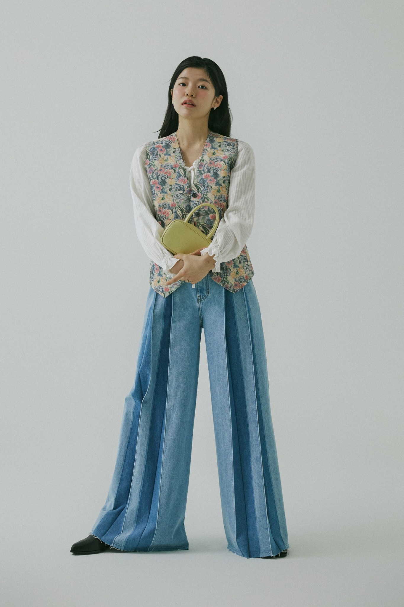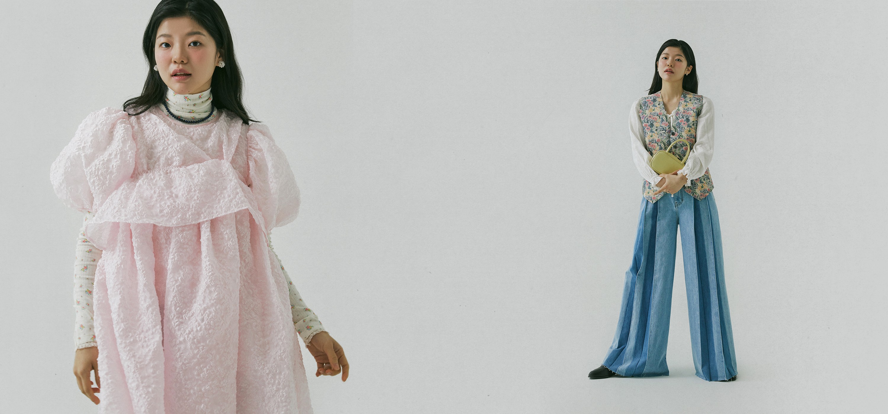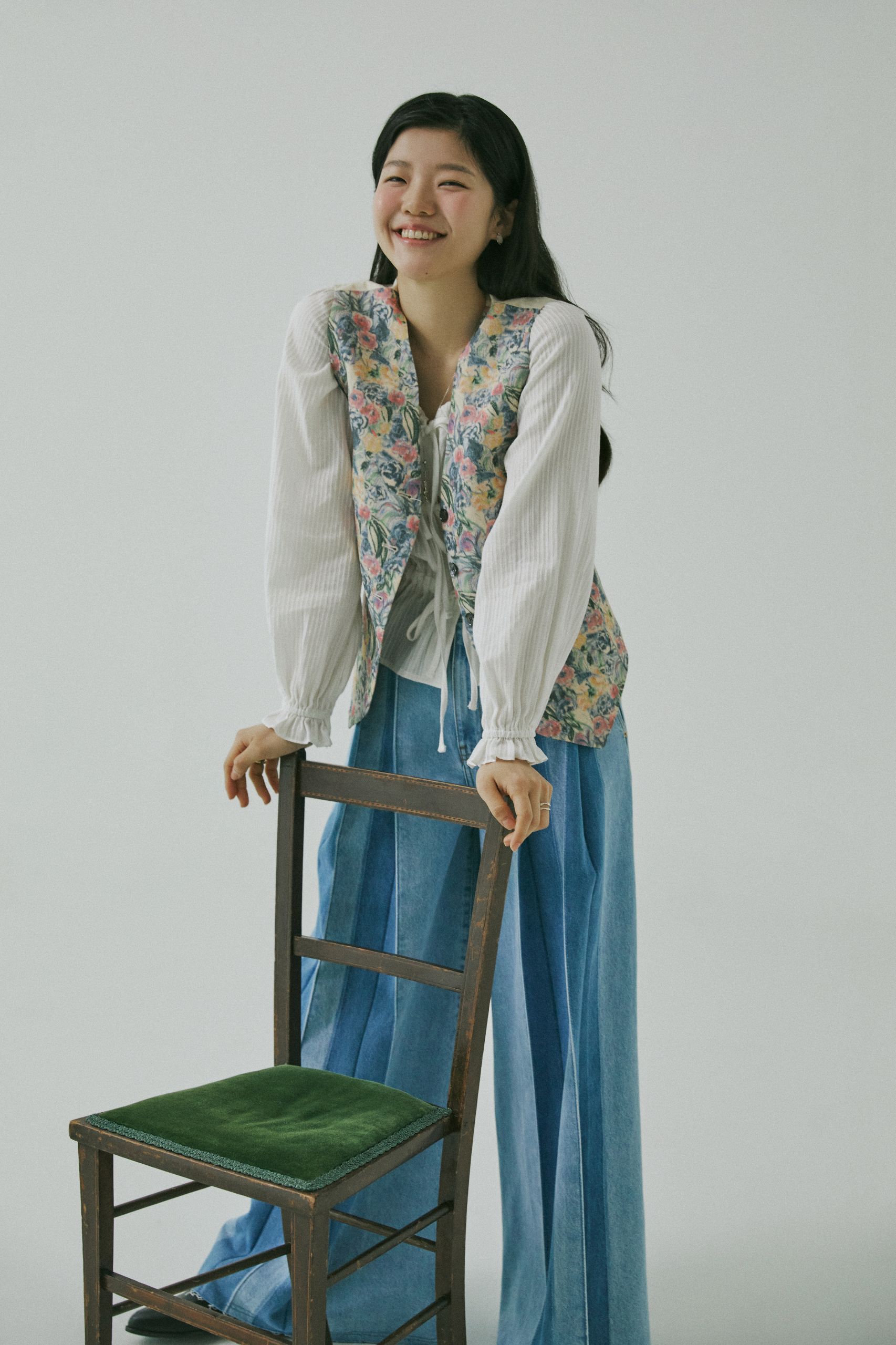 리본 매듭이 나풀거리는 넓은 소맷자락의 블라우스와 그 위에 걸친 수트 베스트는 마치 19세기 빅토리아 시대의 남성을 주인공으로 한 고전 영화에서 볼법한 클래식 아이템이죠. 영화 <작은아씨들>처럼 오래된 영화 속에 등장하는 스타일을 동경해 본 적이 있다면, 소재와 디자인을 자유롭게 선택해 나만의 코티지 스타일로 색다르게 연출해 보세요. 빈티지한 색감의 플로럴 패턴을 입은 수트 베스트와 데님 팬츠의 조화는 우아하고 온화한 숙녀의 모습을 떠올리게 해요.