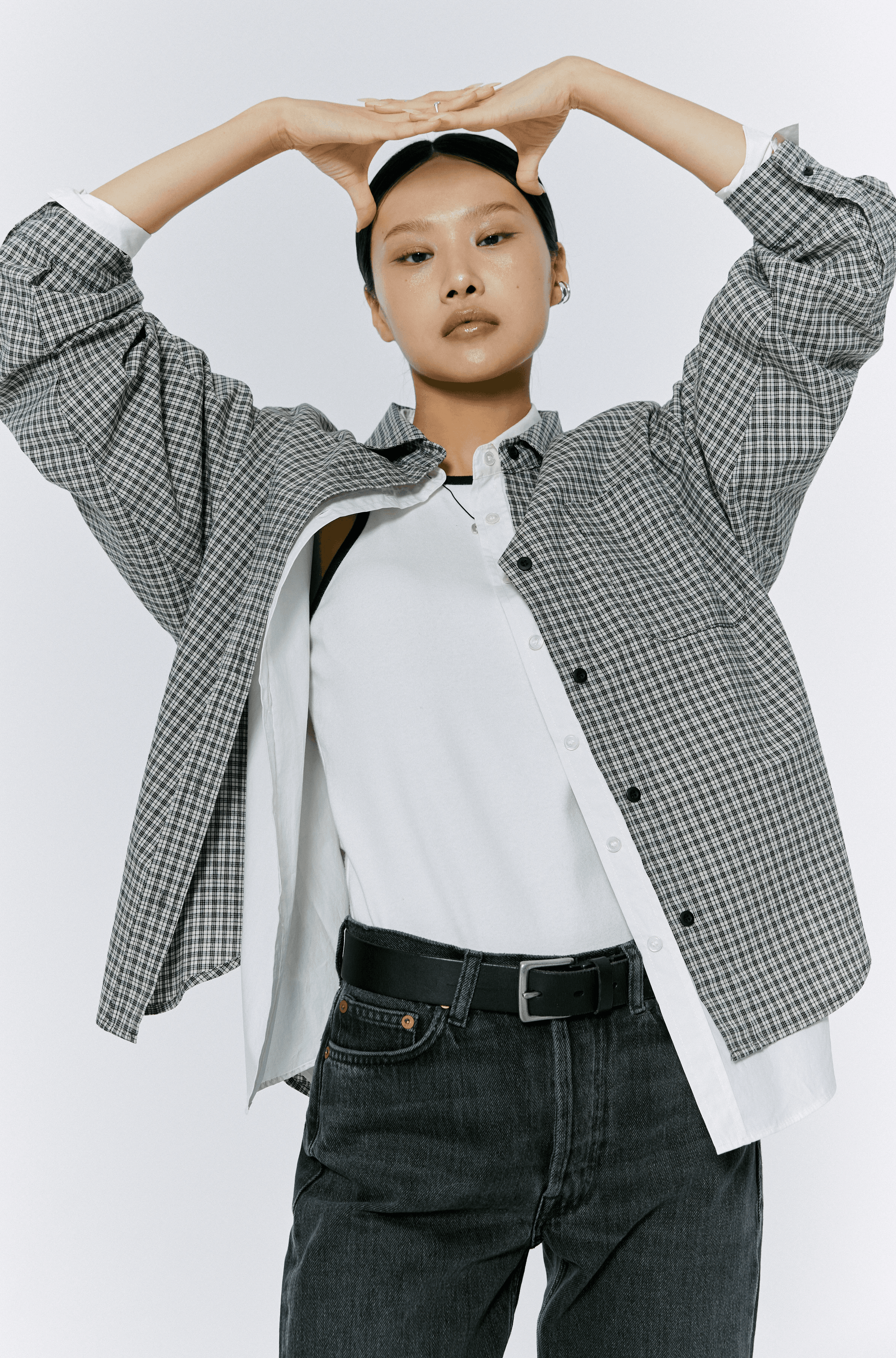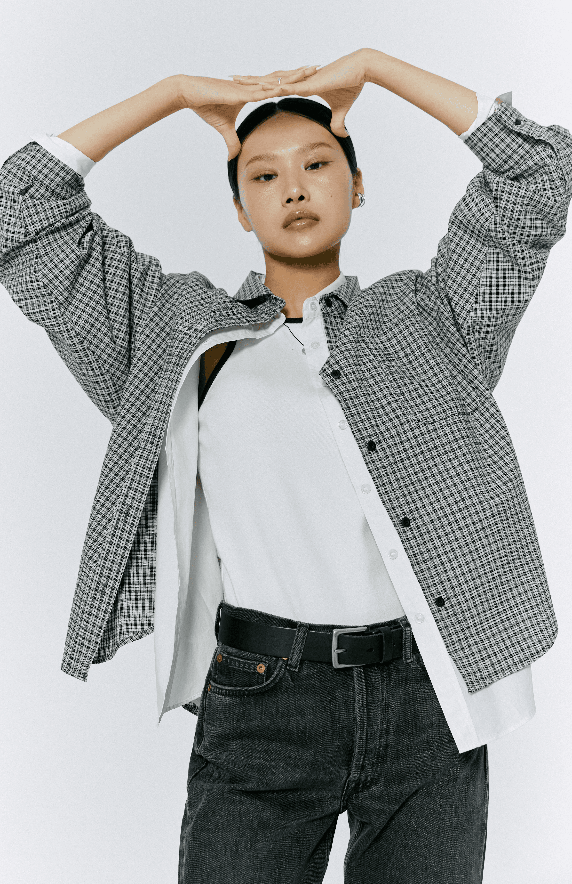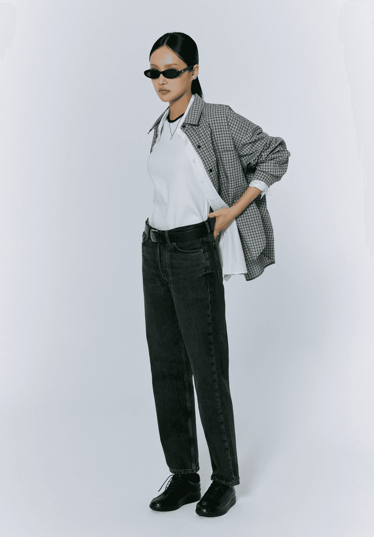 모두의 옷장에 있는 기본적인 아이템으로 조합해 내는 스타일이야말로 데님을 가장 근사하게 활용하는 방법일 겁니다. 빈티지한 워싱이 가미된 블랙 데님에 여러 장의 셔츠를 레이어링해 보세요. 단추는 모두 풀어 상의의 레이어가 겹겹이 보이도록 하고, 소매도 마구 주름이 지도록 걷어올려요. 이 룩이 추구하는 자유분방한 분위기는 1990년대 패션의 향수를 불러일으키는 동시에 꾸민 듯 안 꾸민 듯 힘을 뺀 데님의 미학을 만족시키기에 충분해요.