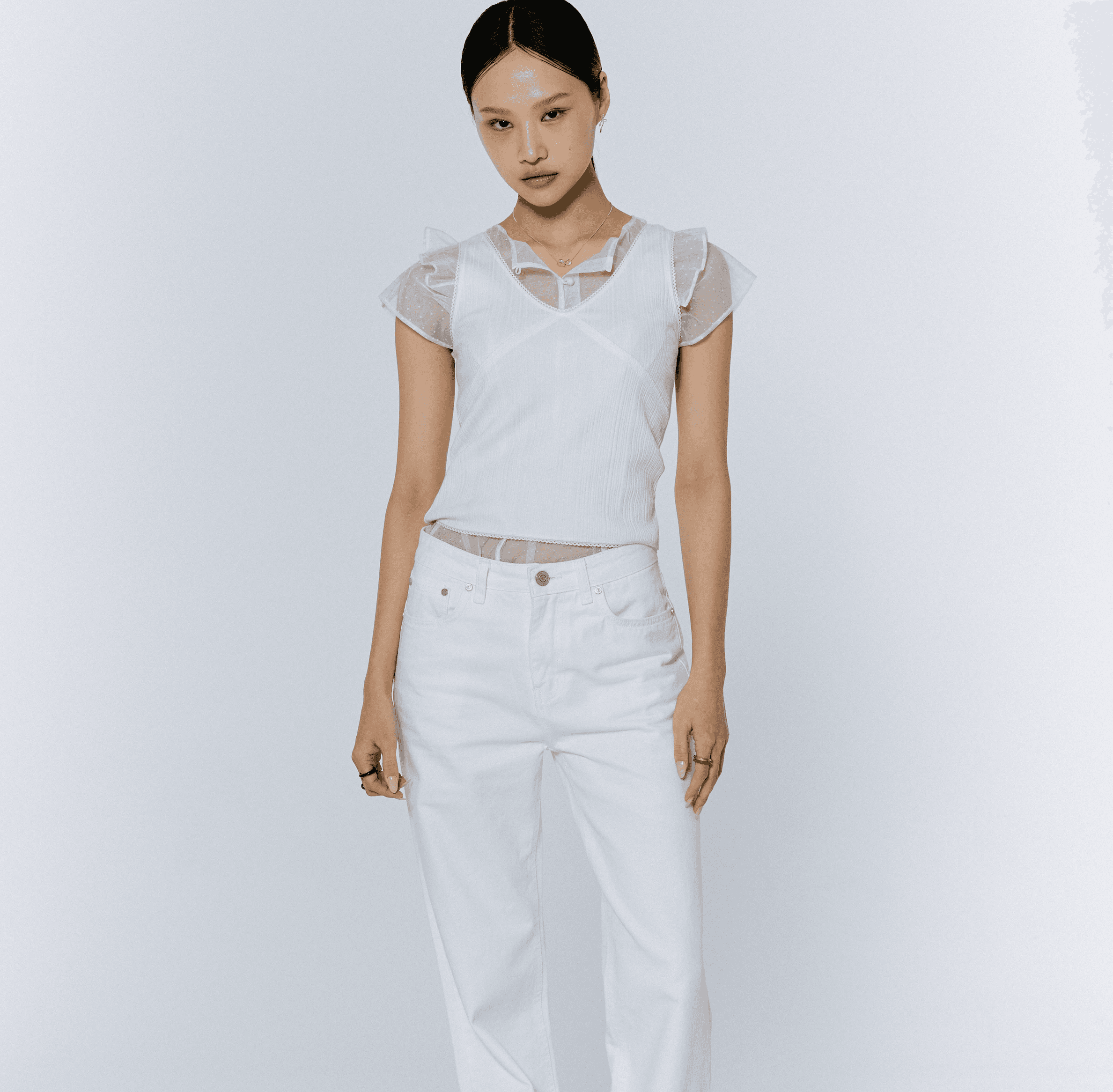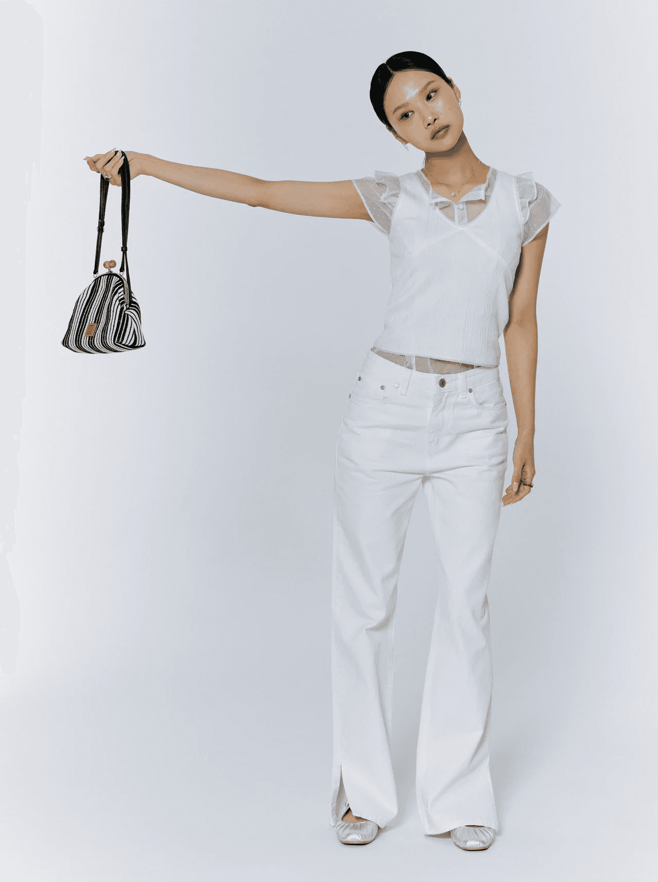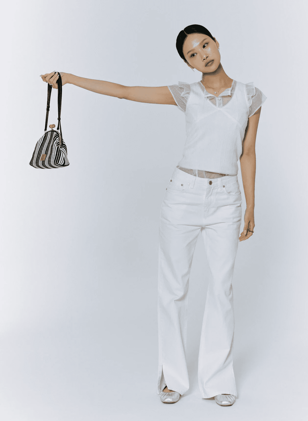 오피스코어와 대척점에 서 있는 코티지코어 그리고 이에서 파생된 숲과 정원의 싱그러움을 담은 프레리 시크 트렌드는 이번 시즌 내내 유효할 전망입니다. 봄의 생명력과 깨끗함을 오롯이 표현하고 싶다면 화이트 데님을 활용한 올 화이트 룩을 시도해 보세요. 시폰, 튈이나 레이스 소재의 상의와 매치하면 순수하고 깨끗한 이미지를 완성할 수 있어요.