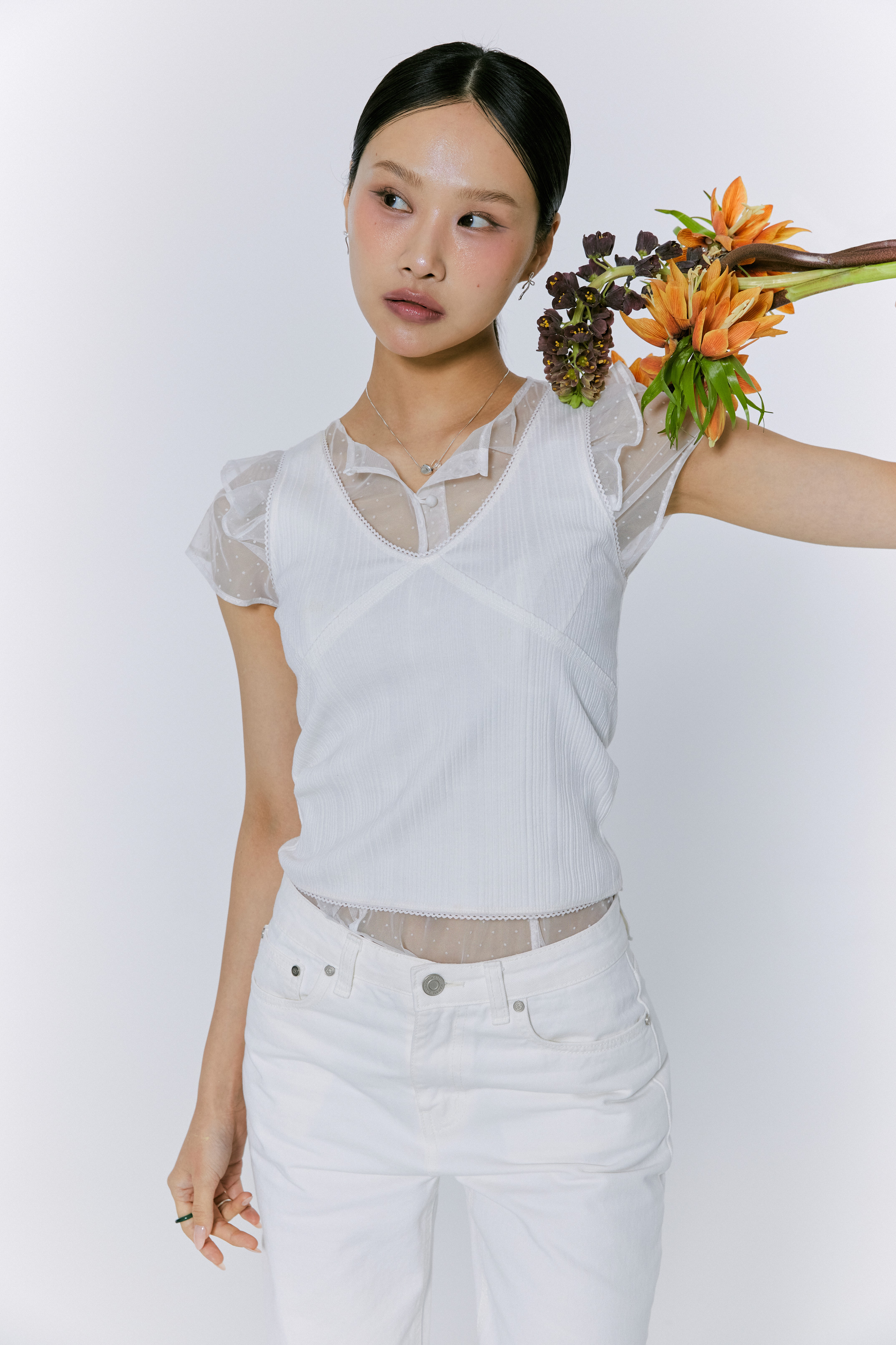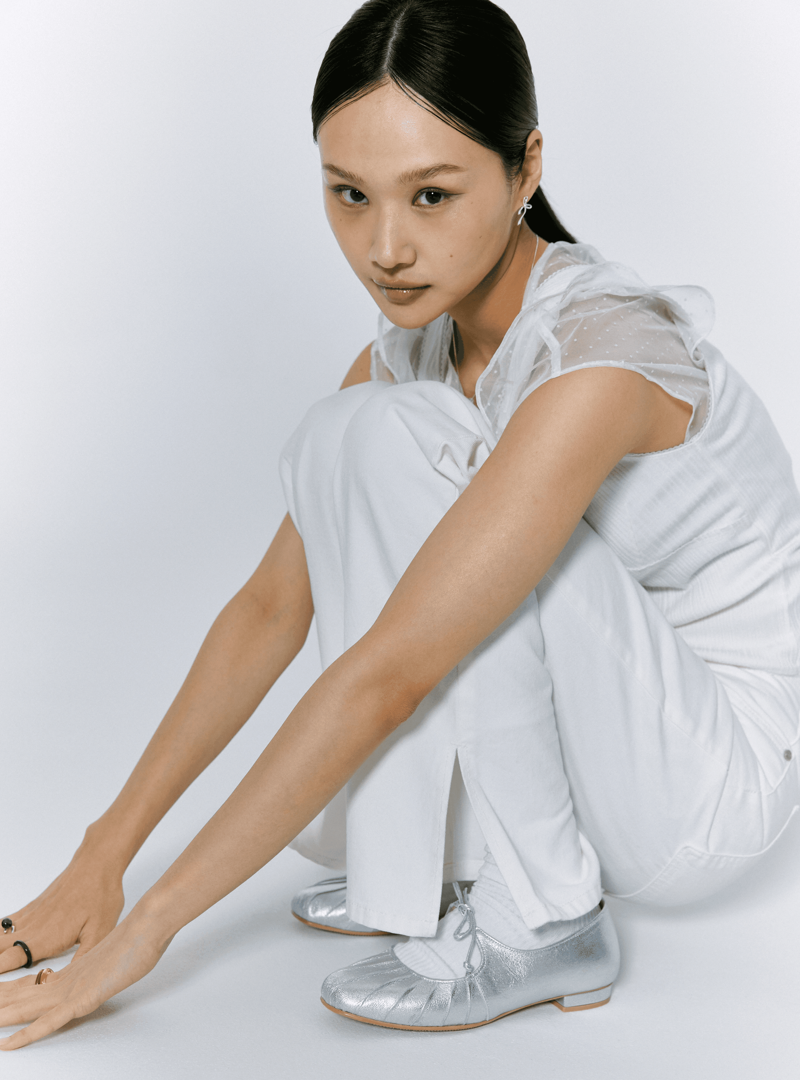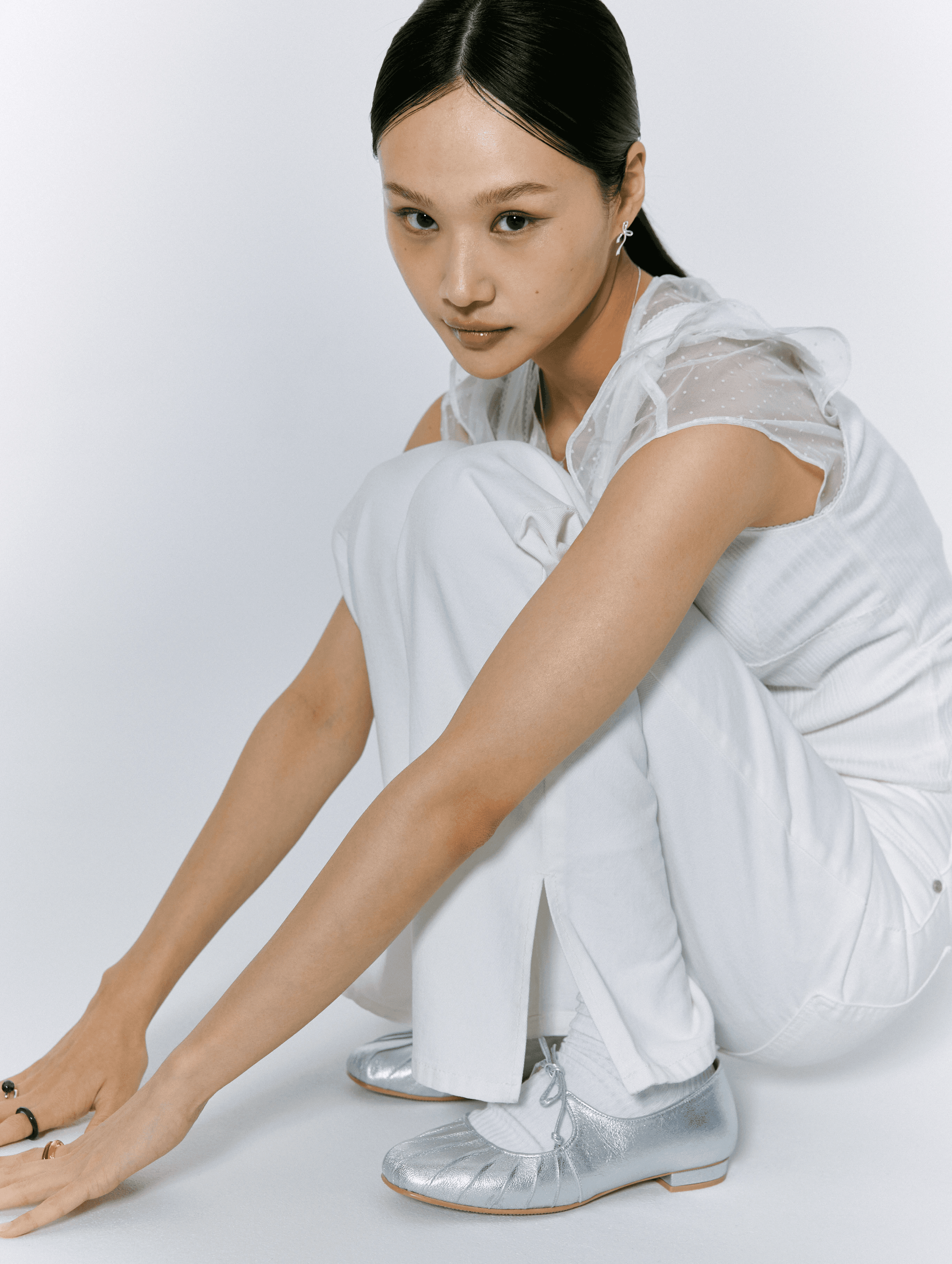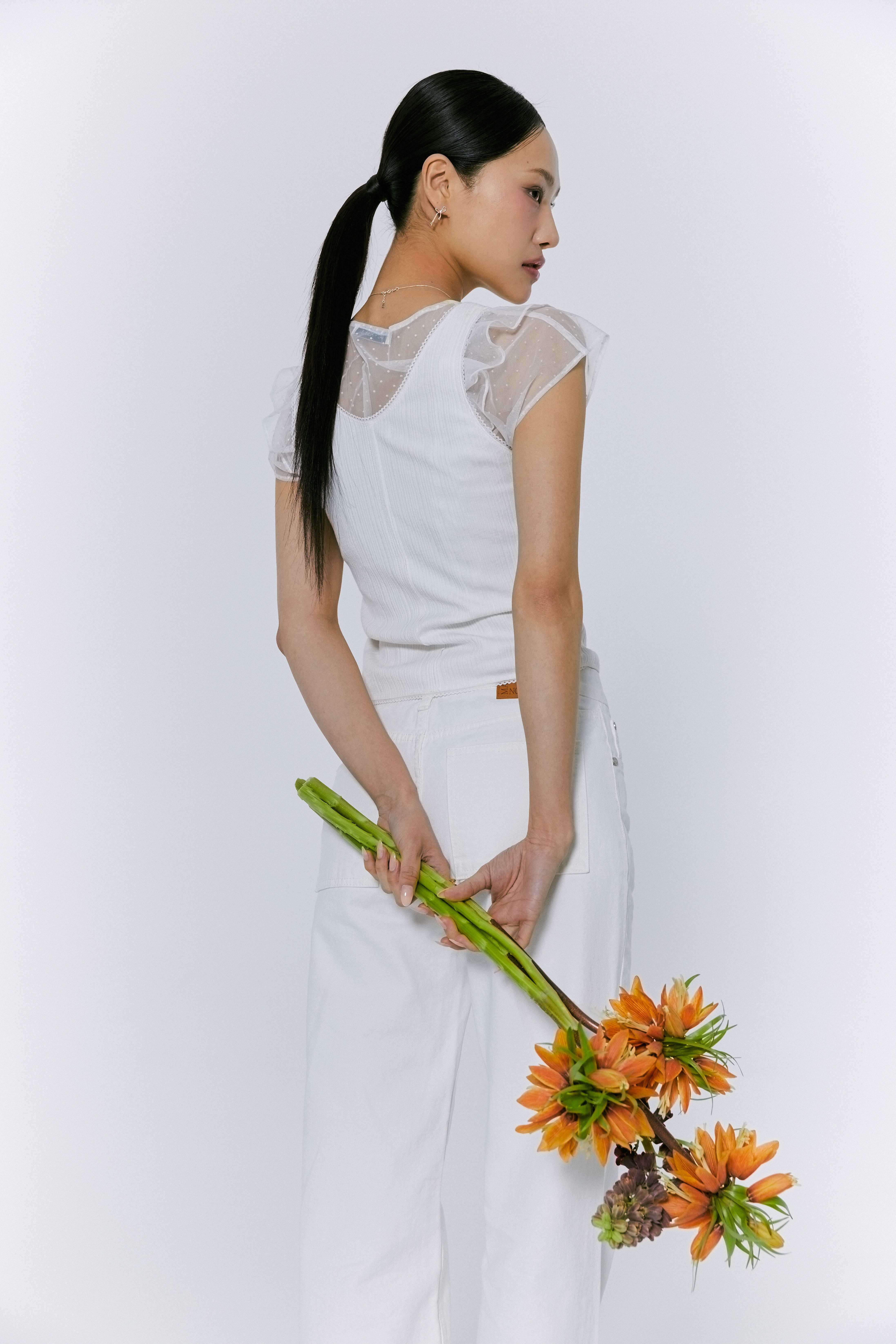오피스코어와 대척점에 서 있는 코티지코어 그리고 이에서 파생된 숲과 정원의 싱그러움을 담은 프레리 시크 트렌드는 이번 시즌 내내 유효할 전망입니다. 봄의 생명력과 깨끗함을 오롯이 표현하고 싶다면 화이트 데님을 활용한 올 화이트 룩을 시도해 보세요. 시폰, 튈이나 레이스 소재의 상의와 매치하면 순수하고 깨끗한 이미지를 완성할 수 있어요.