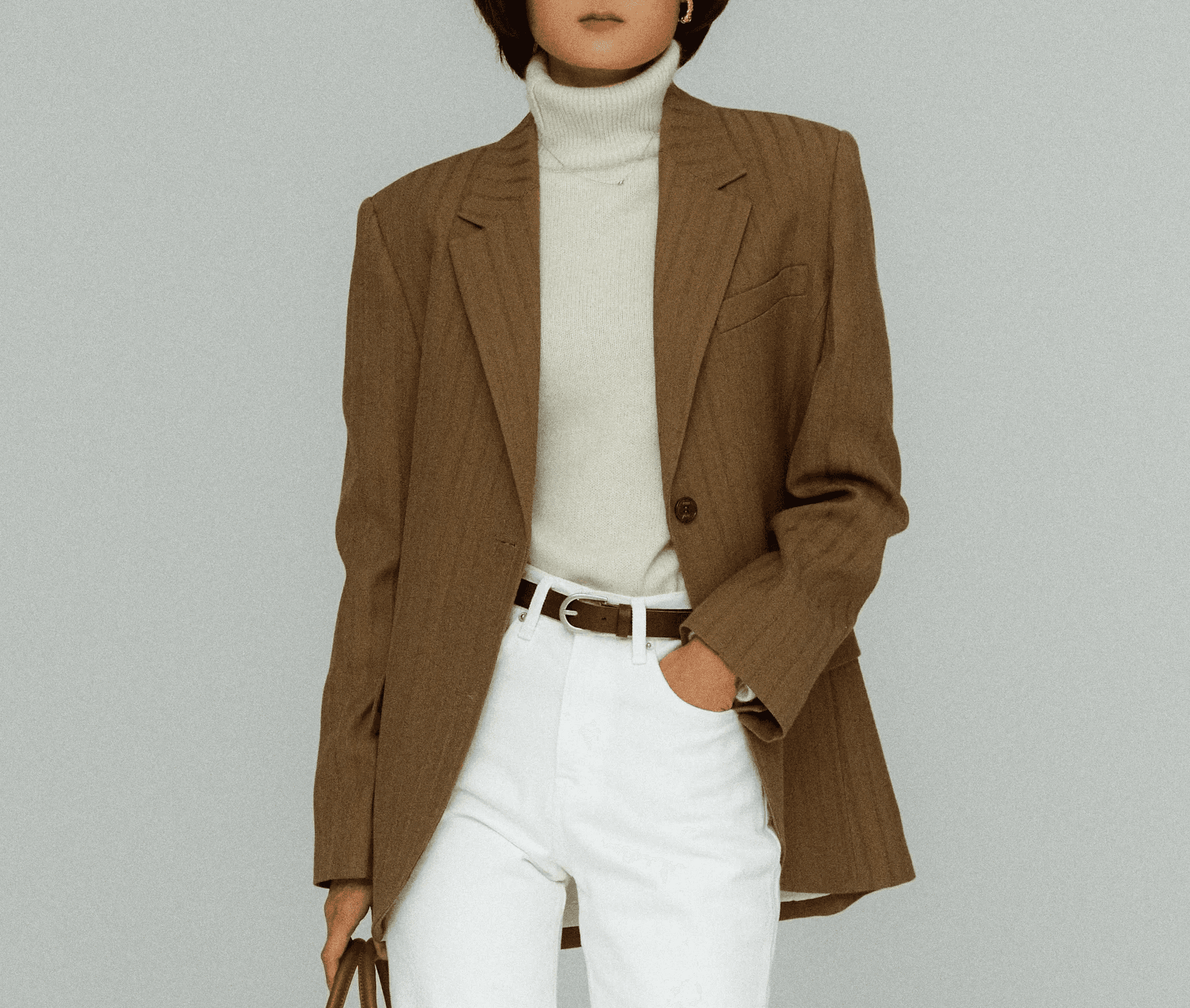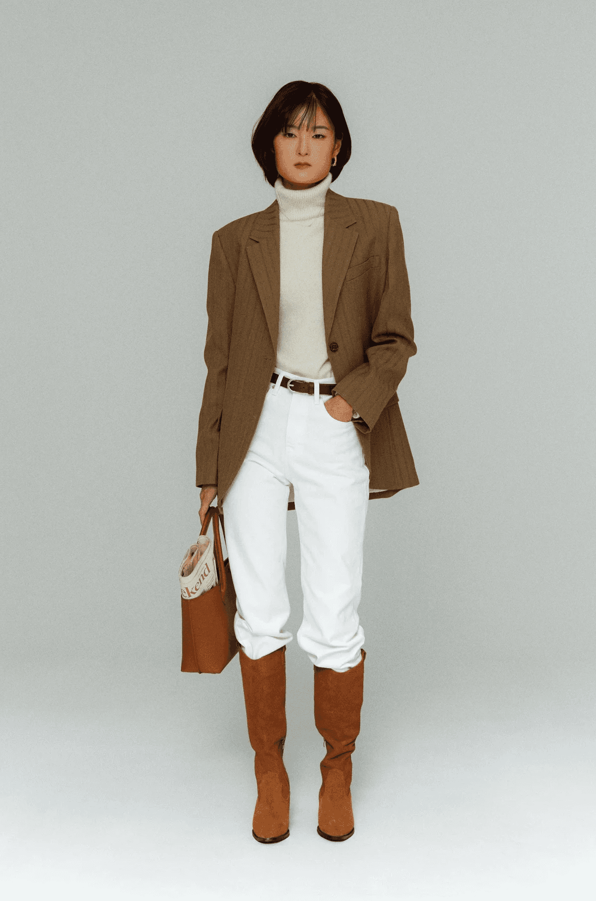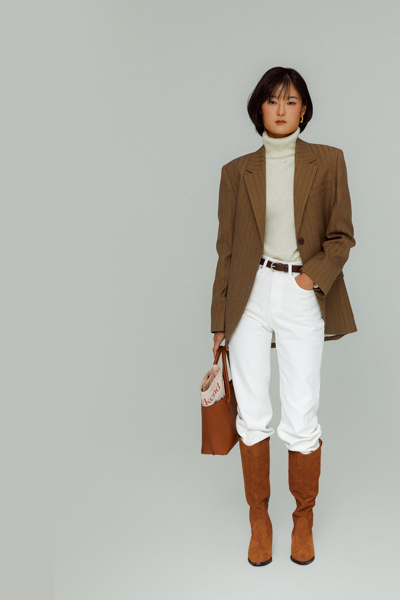 클래식한 올드머니 룩이 트렌드로 자리 잡으며 다이애나의 스타일도 다시 주목받고 있습니다. 다이애나는 우아하면서도 고상한 스타일을 연출할 때 매니시한 재킷을 활용했죠. 은은한 스트라이프 패턴이 돋보이는 재킷에 같은 톤의 카멜 코트를 매치하고 이너와 팬츠는 화이트 계열로 통일해 왕실의 기품을 잃지 않는 패션을 완성했습니다. 여기에 가죽 소재의 가방과 벨트, 스웨이드 소재의 부츠로 클래식한 분위기를 더해보세요.
