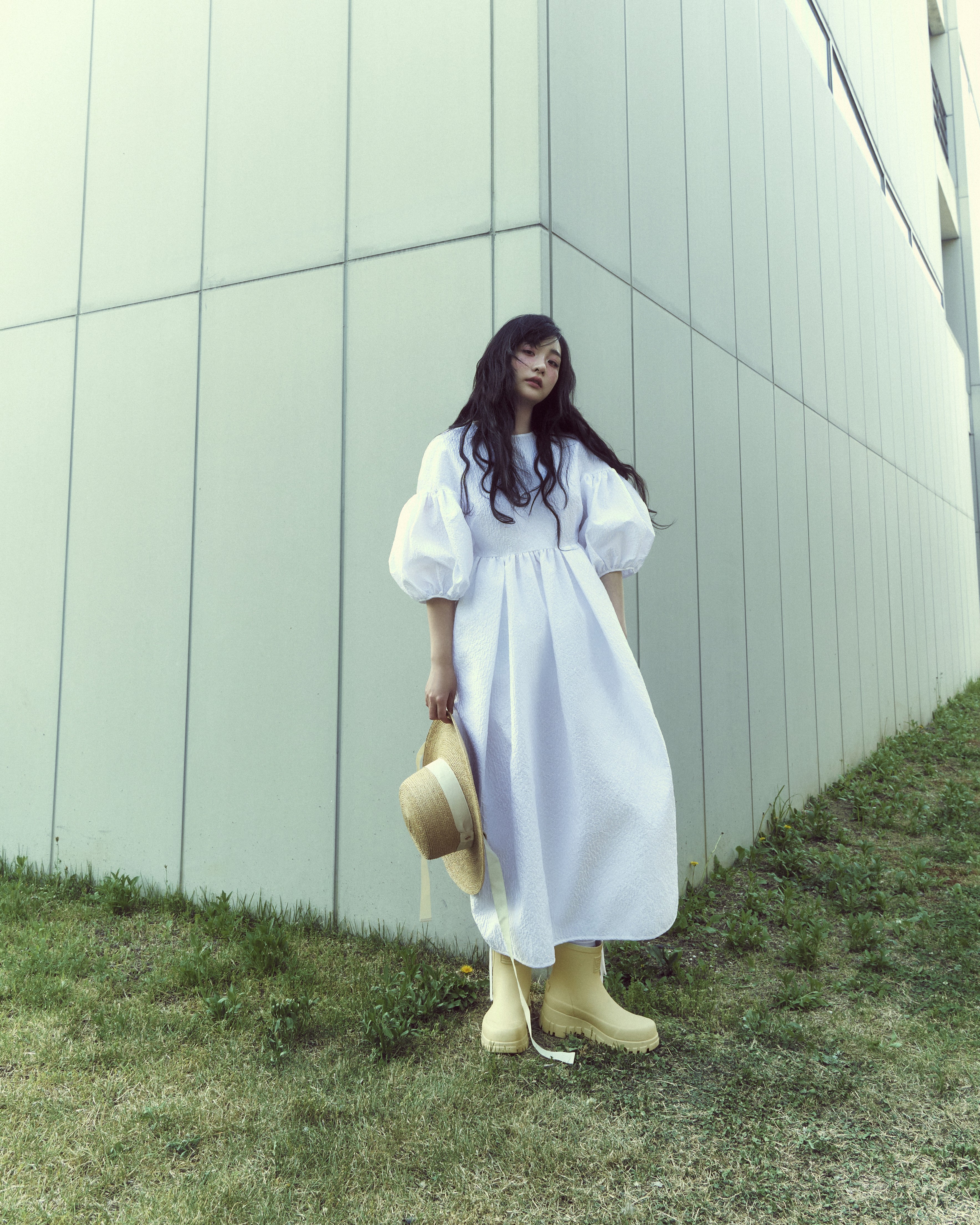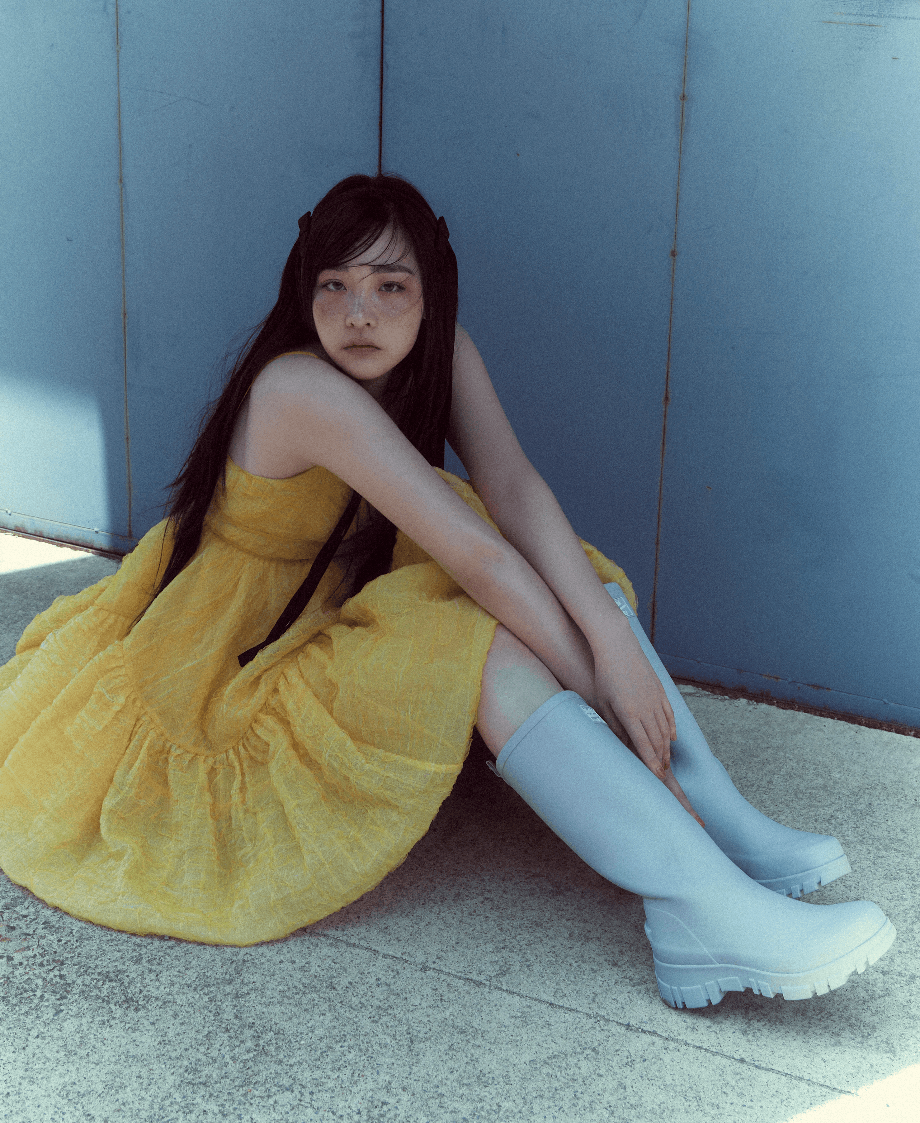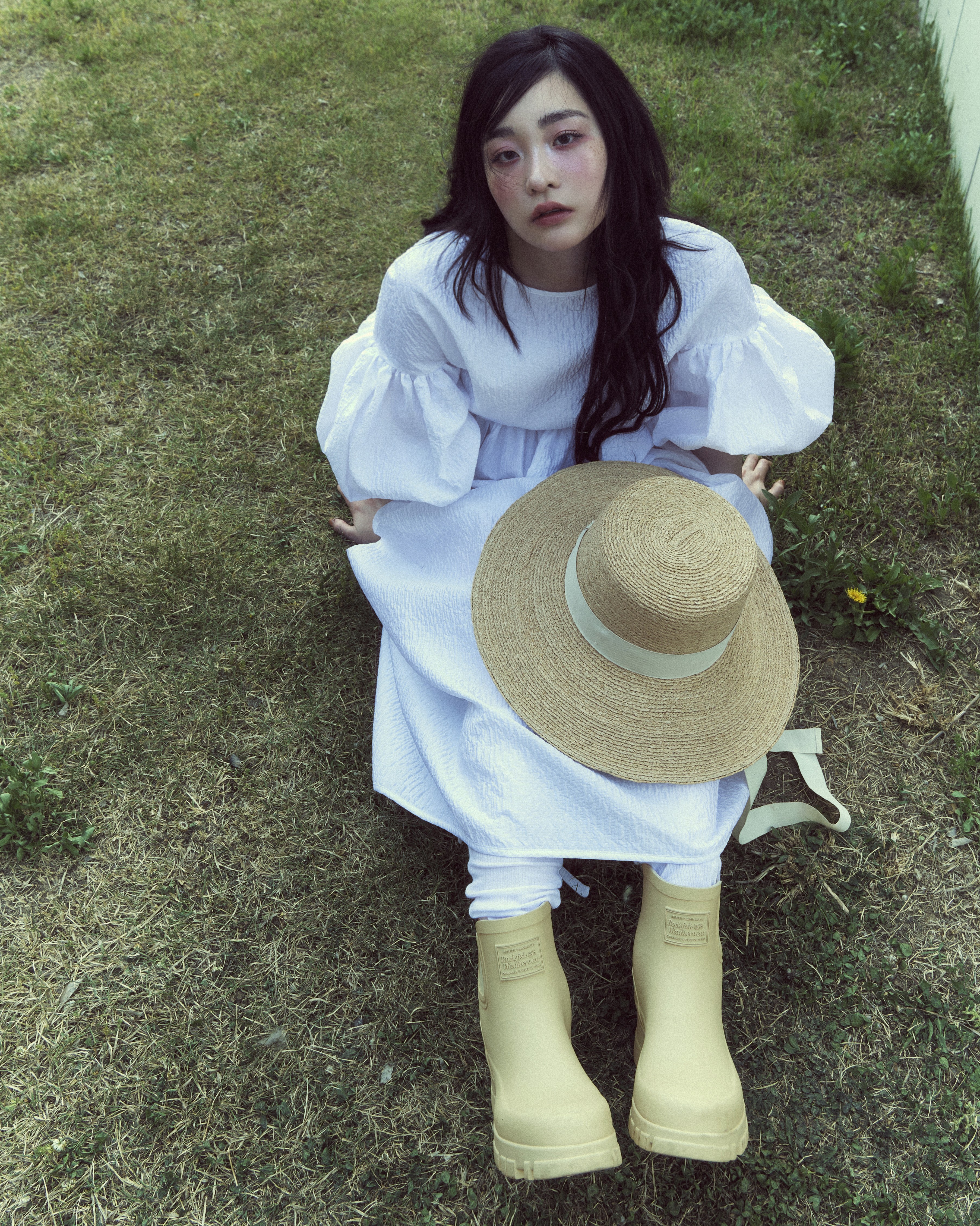 슬림한 발목 라인의 플랫폼 레인부츠와 넓은 챙이 매력적인 플로피햇을 함께 매치해 우아하면서도 사랑스러운 스타일을 완성했어요.
