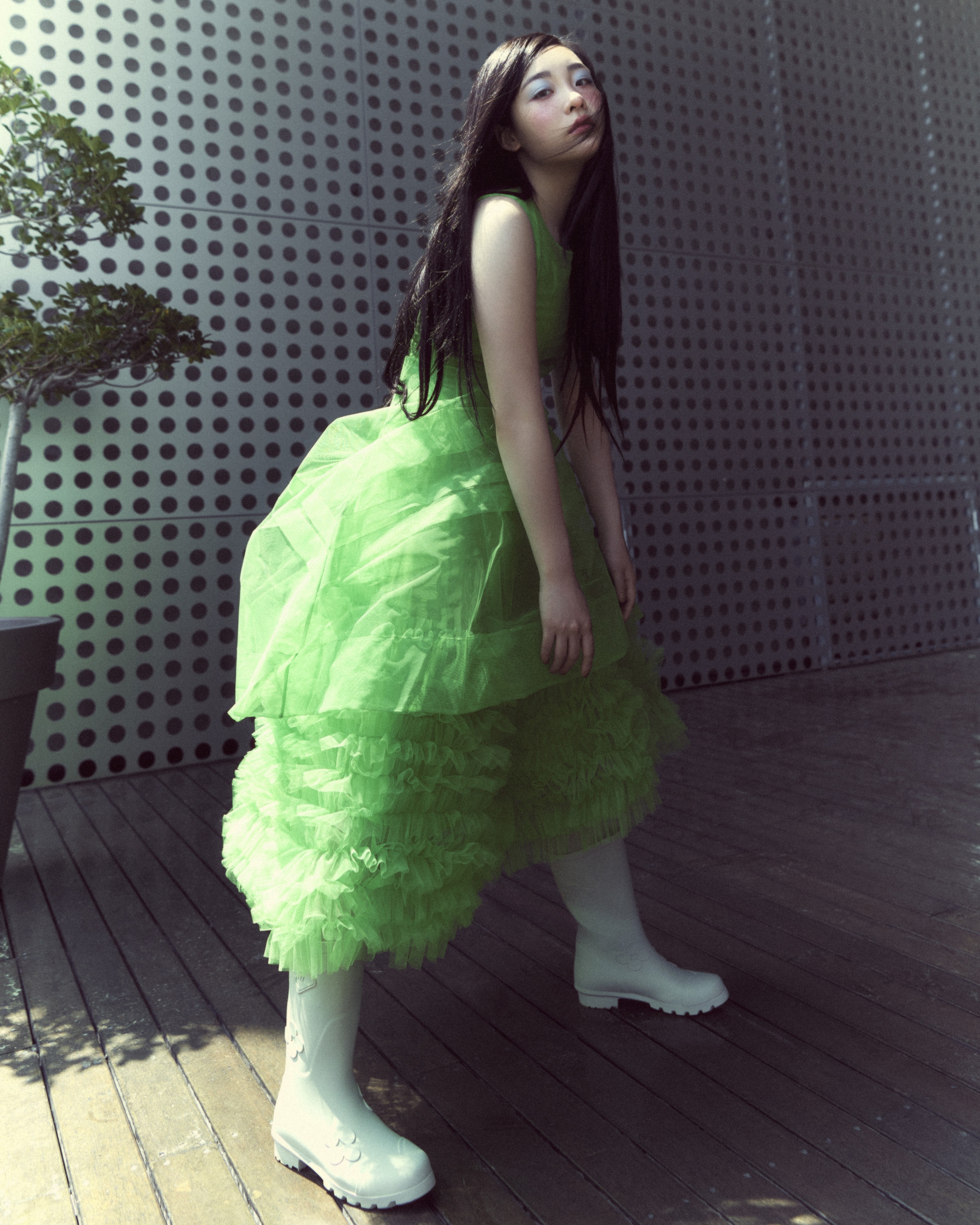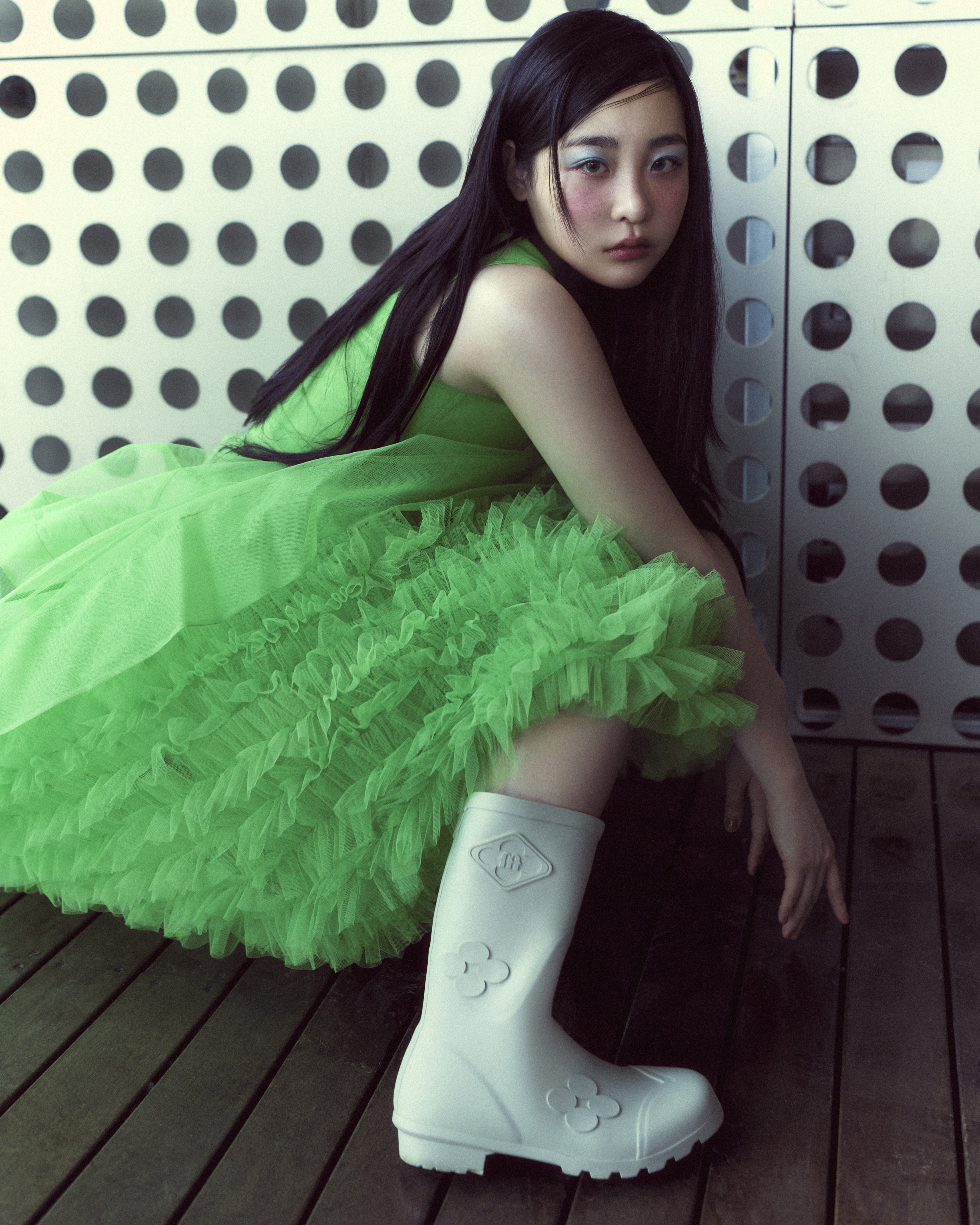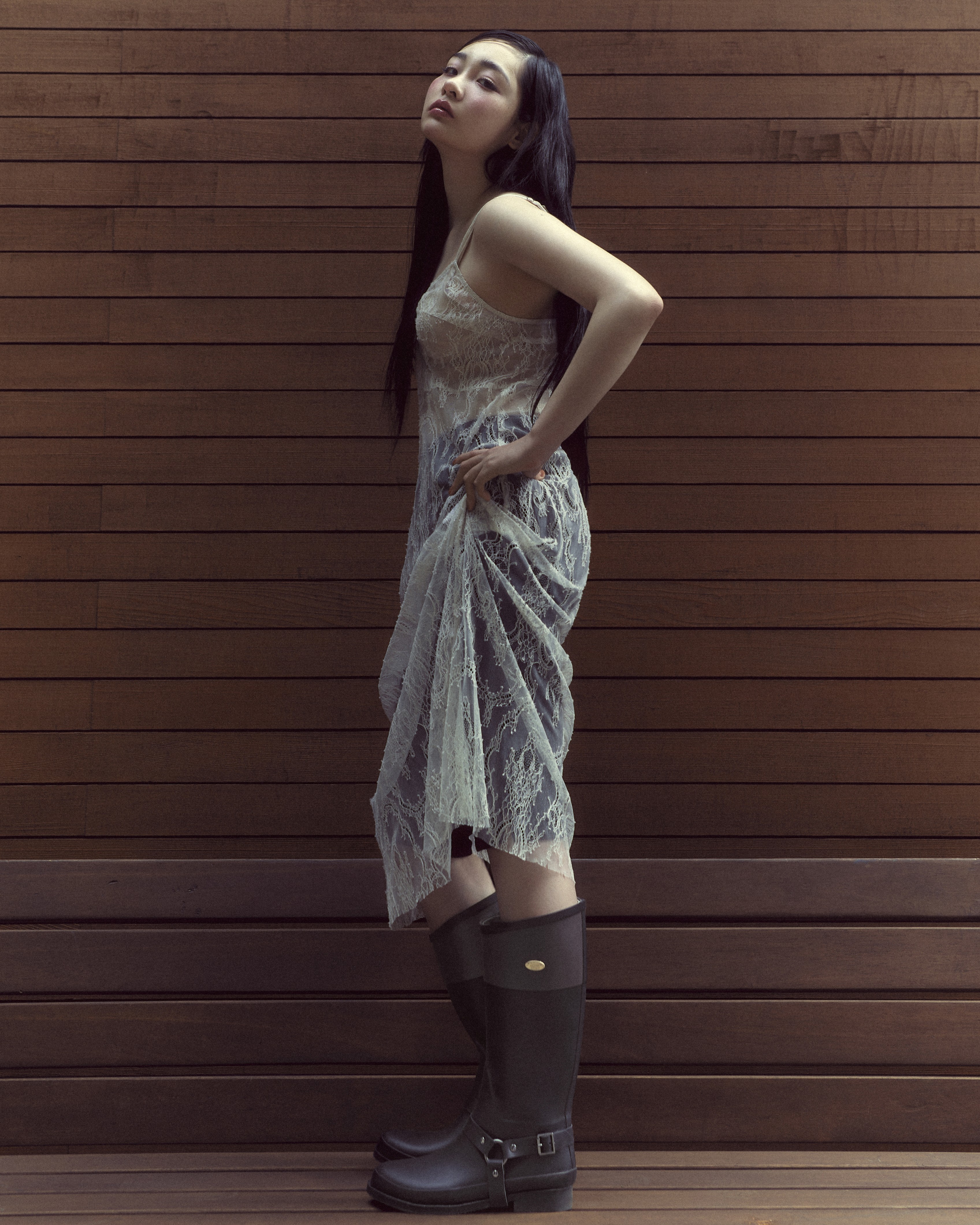 슬림한 발목 라인의 플랫폼 레인부츠와 넓은 챙이 매력적인 플로피햇을 함께 매치해 우아하면서도 사랑스러운 스타일을 완성했어요.