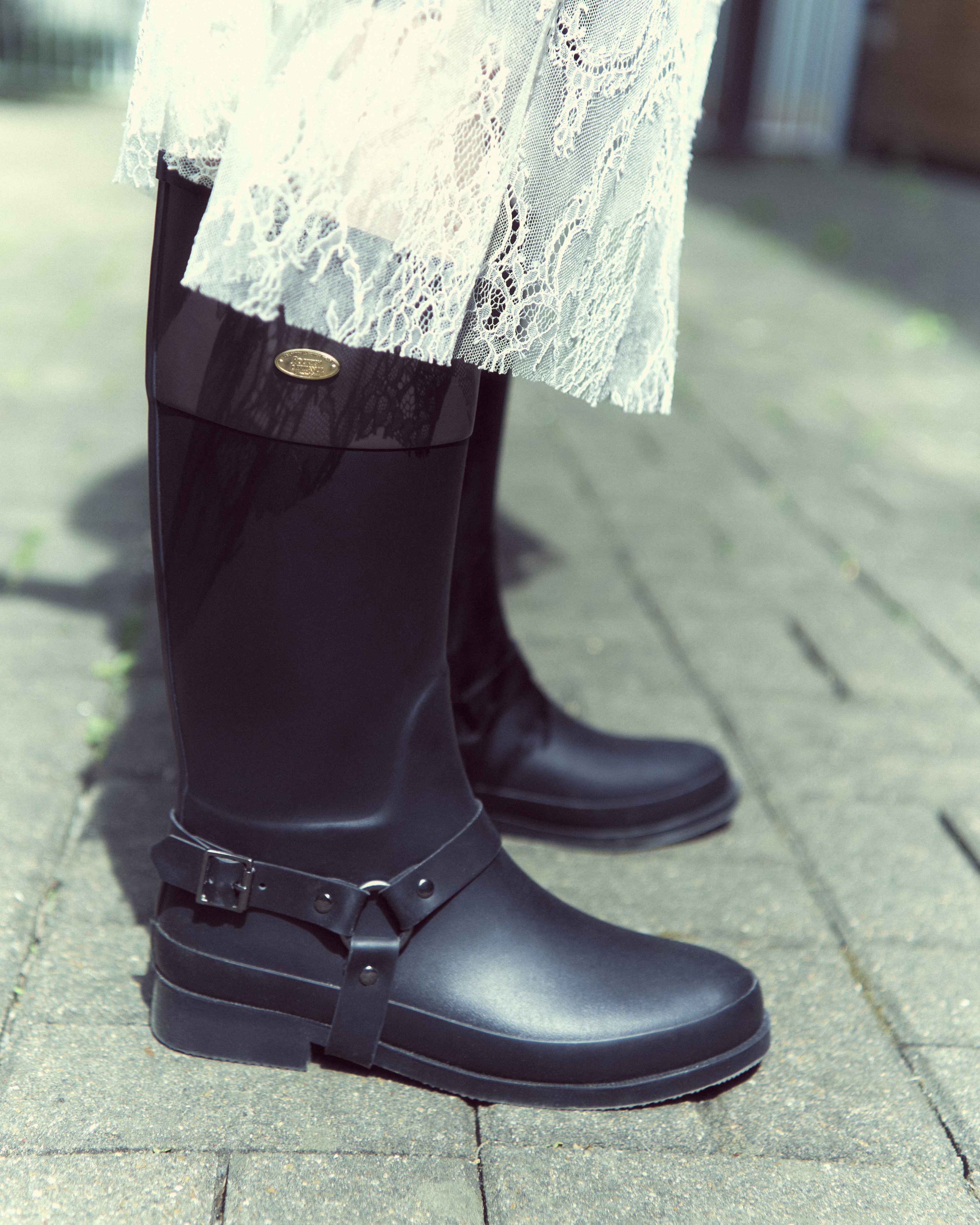 사선 절개와 하네스 디테일, 매트한 질감의 조합이 트렌디하면서도 세련된 웰링턴 레인부츠를 소개합니다.