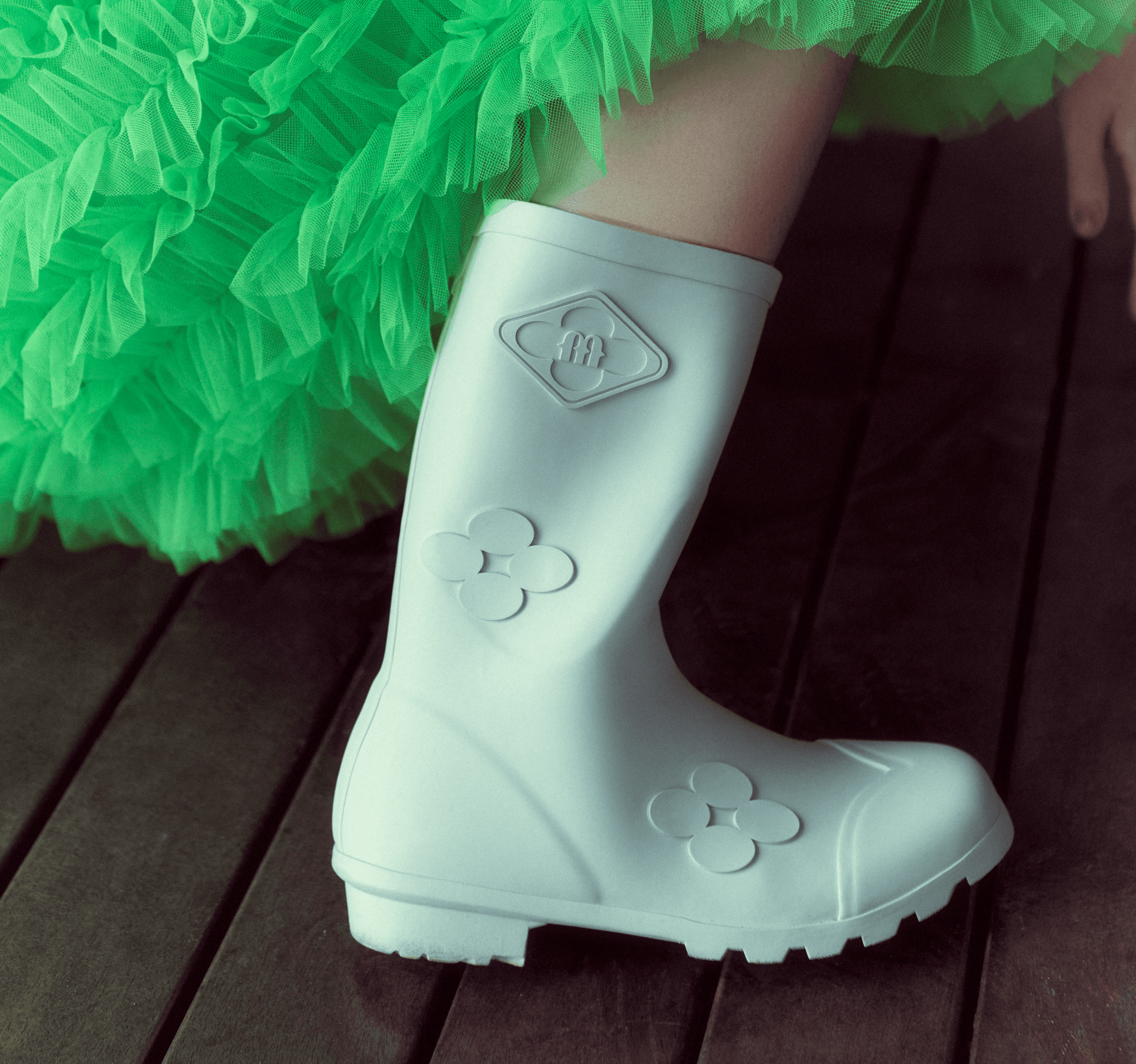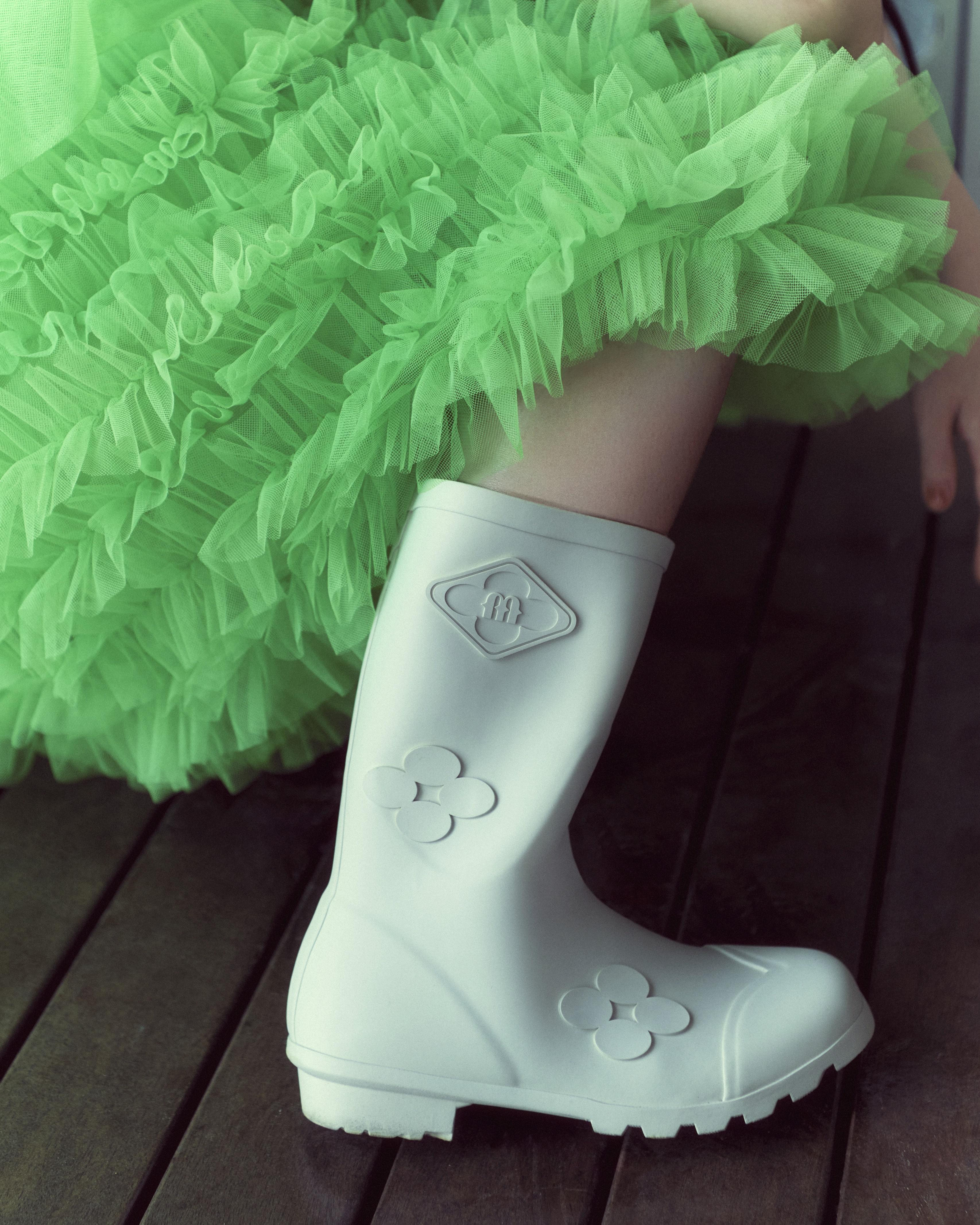 민주킴의 시그니처 플라워 모티프가 눈길을 끄는 레인부츠. 플라워 패치는 스타일에 사랑스러운 포인트가 되어줘요.
