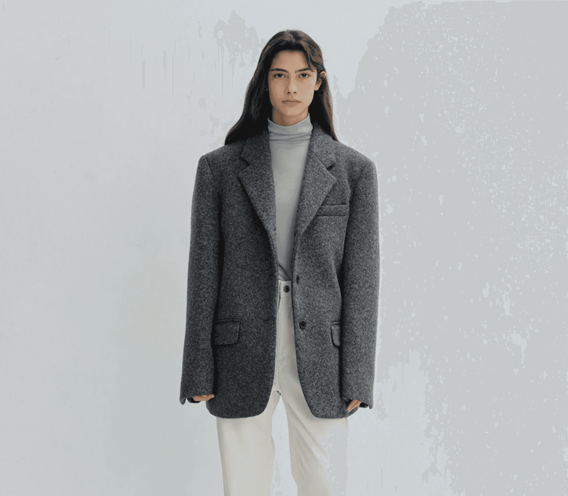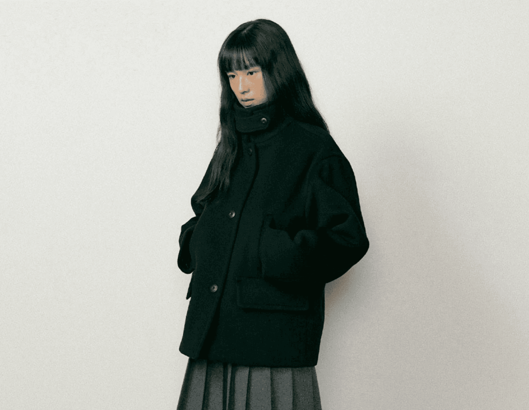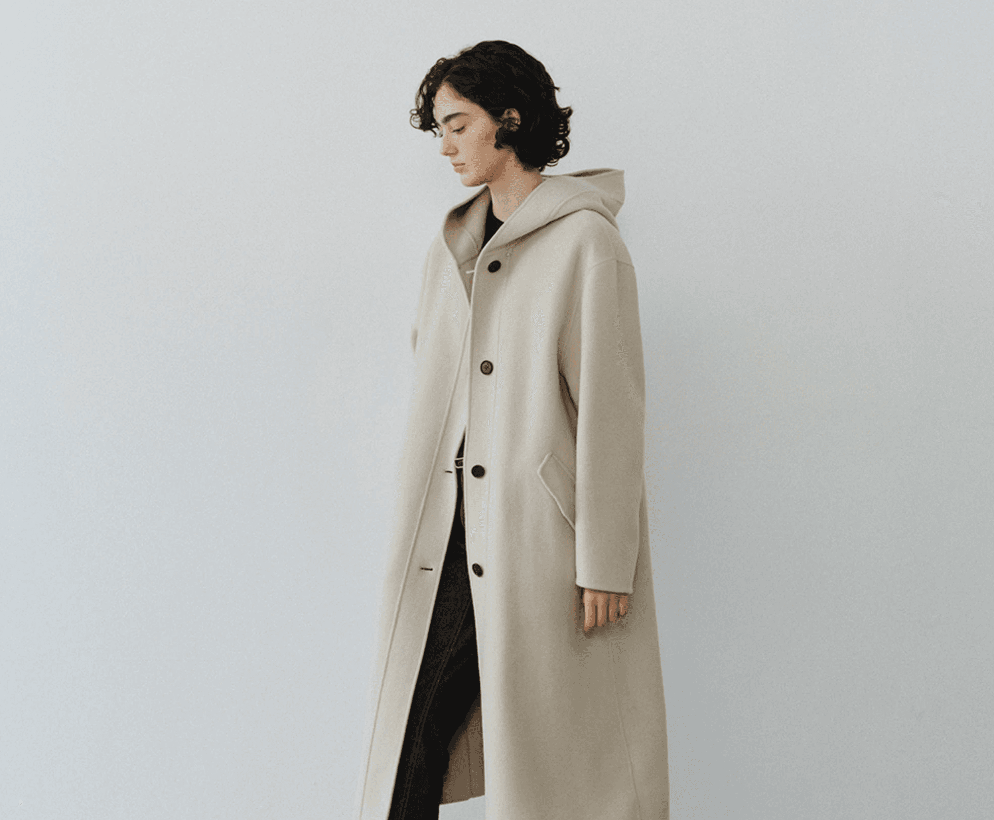 이중직 메리노울을 사용한 엉덩이를 살짝 덮는 하프 기장의 세미 오버핏 코트. 넥 부분의 패널로 투웨이 연출이 가능한 디자인이 특징입니다.