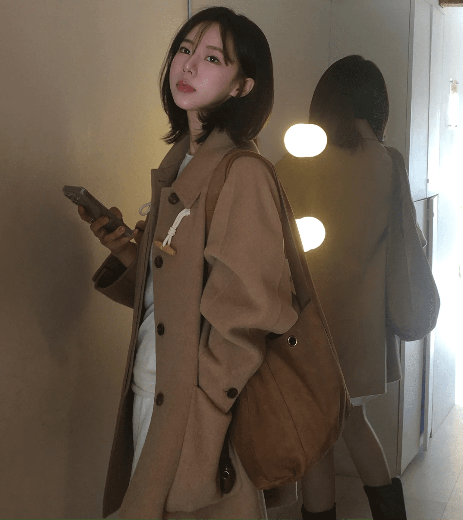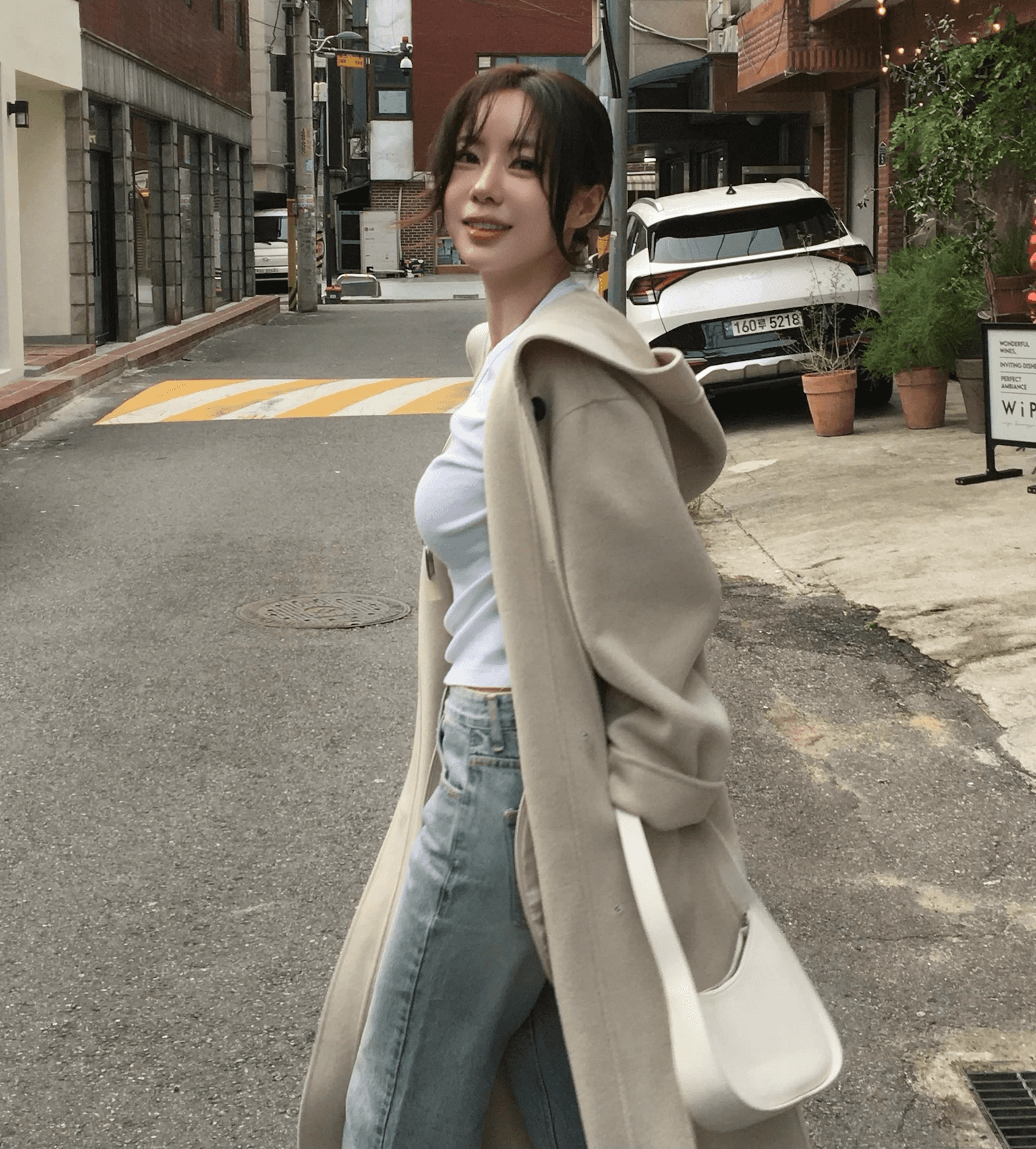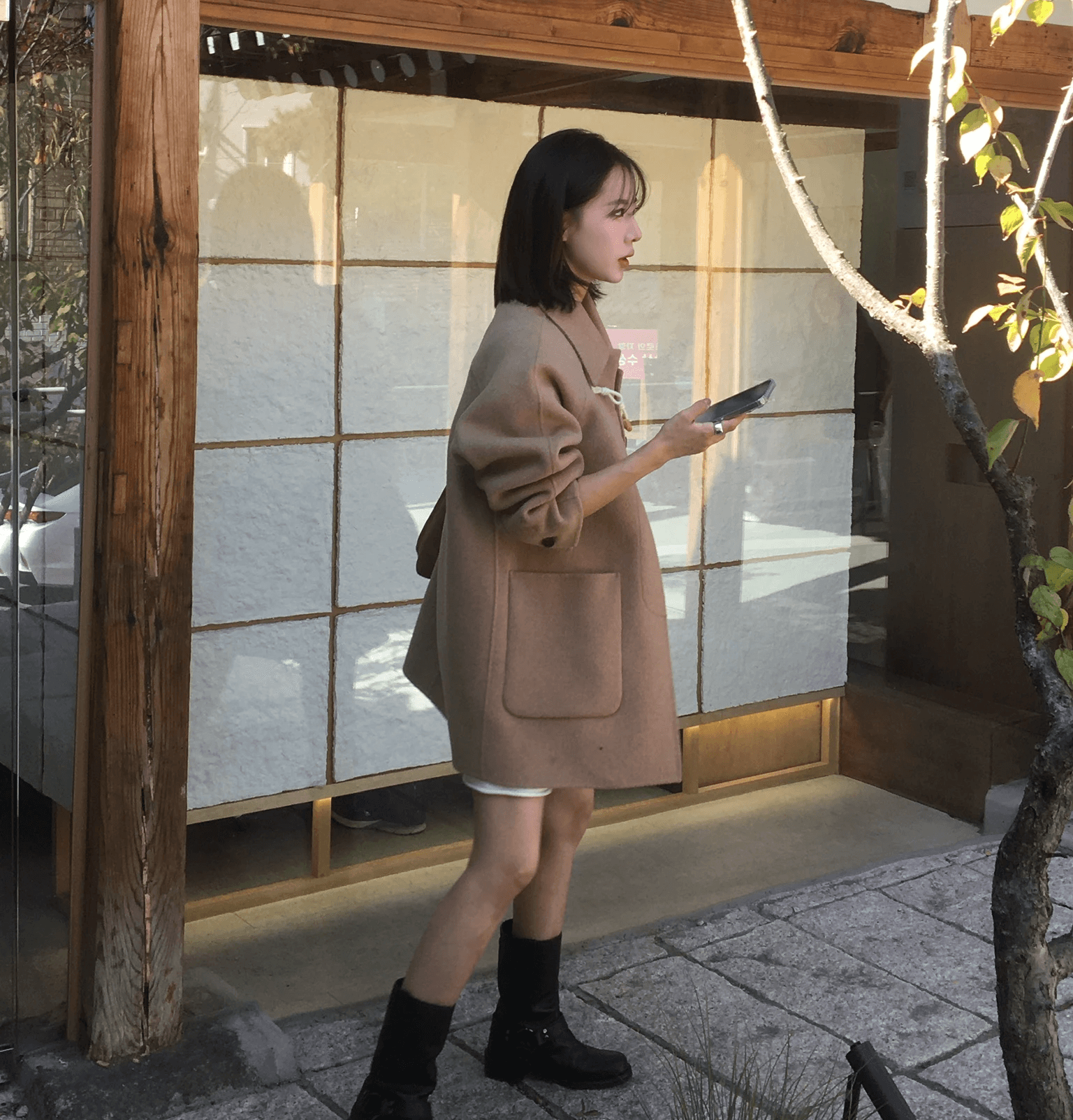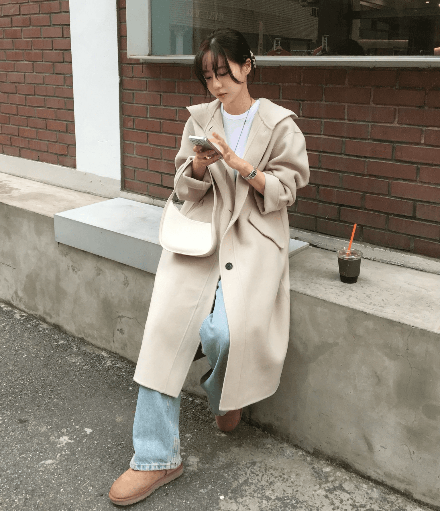 캐주얼하면서도 사랑스러운 코트. 적당히 여유로운 핏을 제공하며, 후디에서 네크라인 앞여밈까지의 연결 라인이 자연스럽게 떨어지는 실루엣이 매력적입니다.