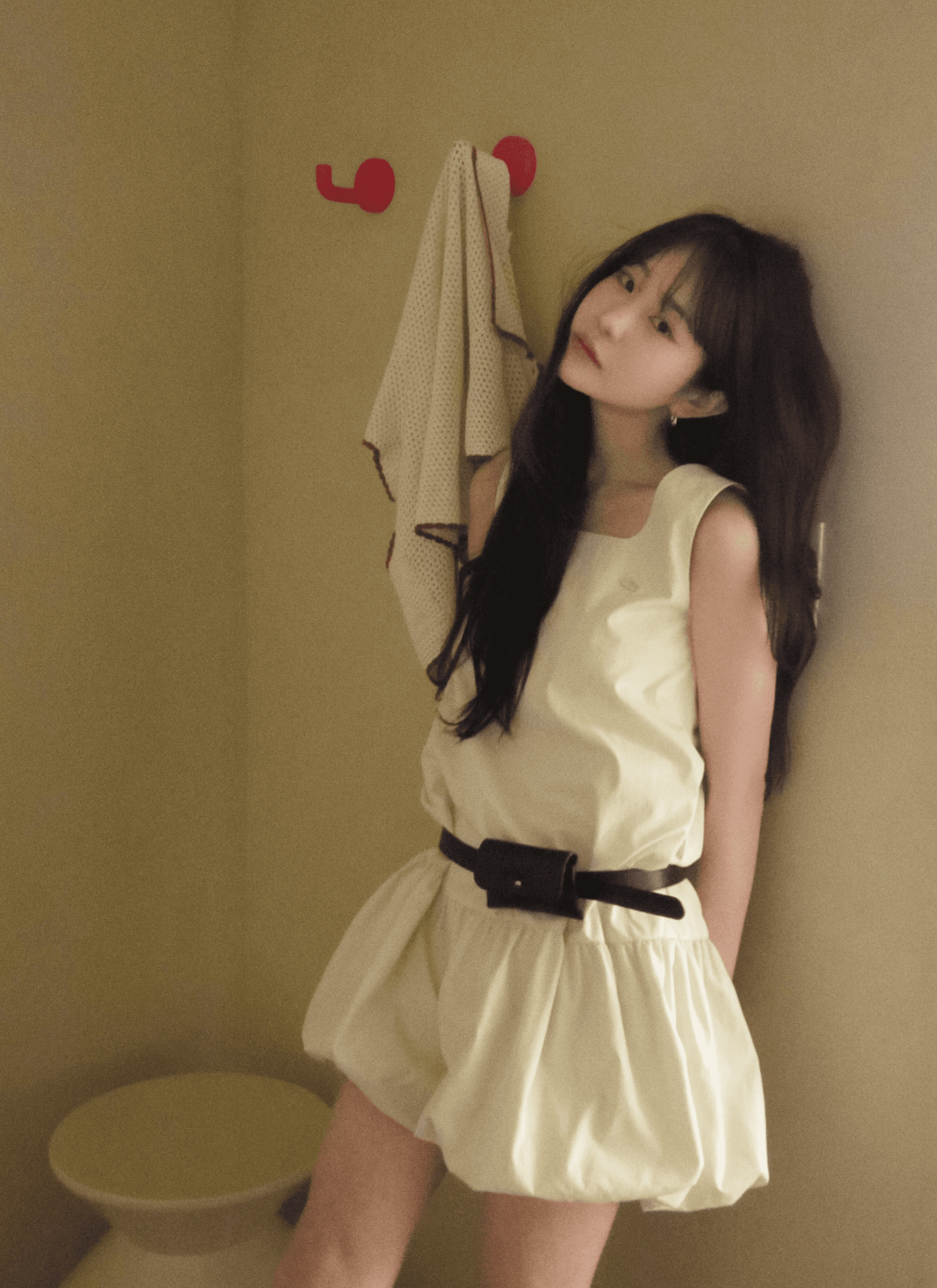 볼륨감 있는 버블햄 드레스에 배색 포인트의 크로셰 반소매 카디건을 레이어드해 리조트 감성의 룩을 연출해 보세요.
