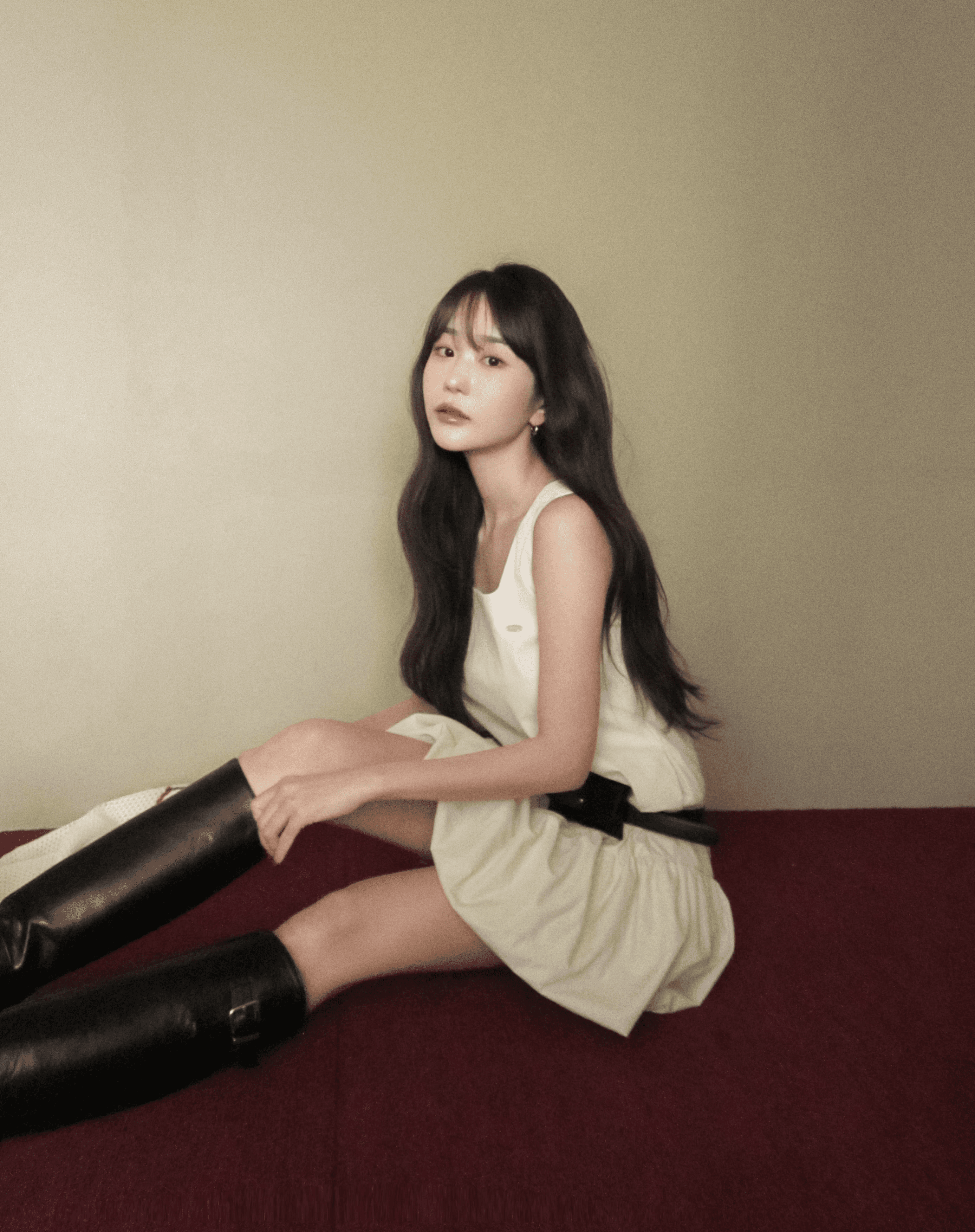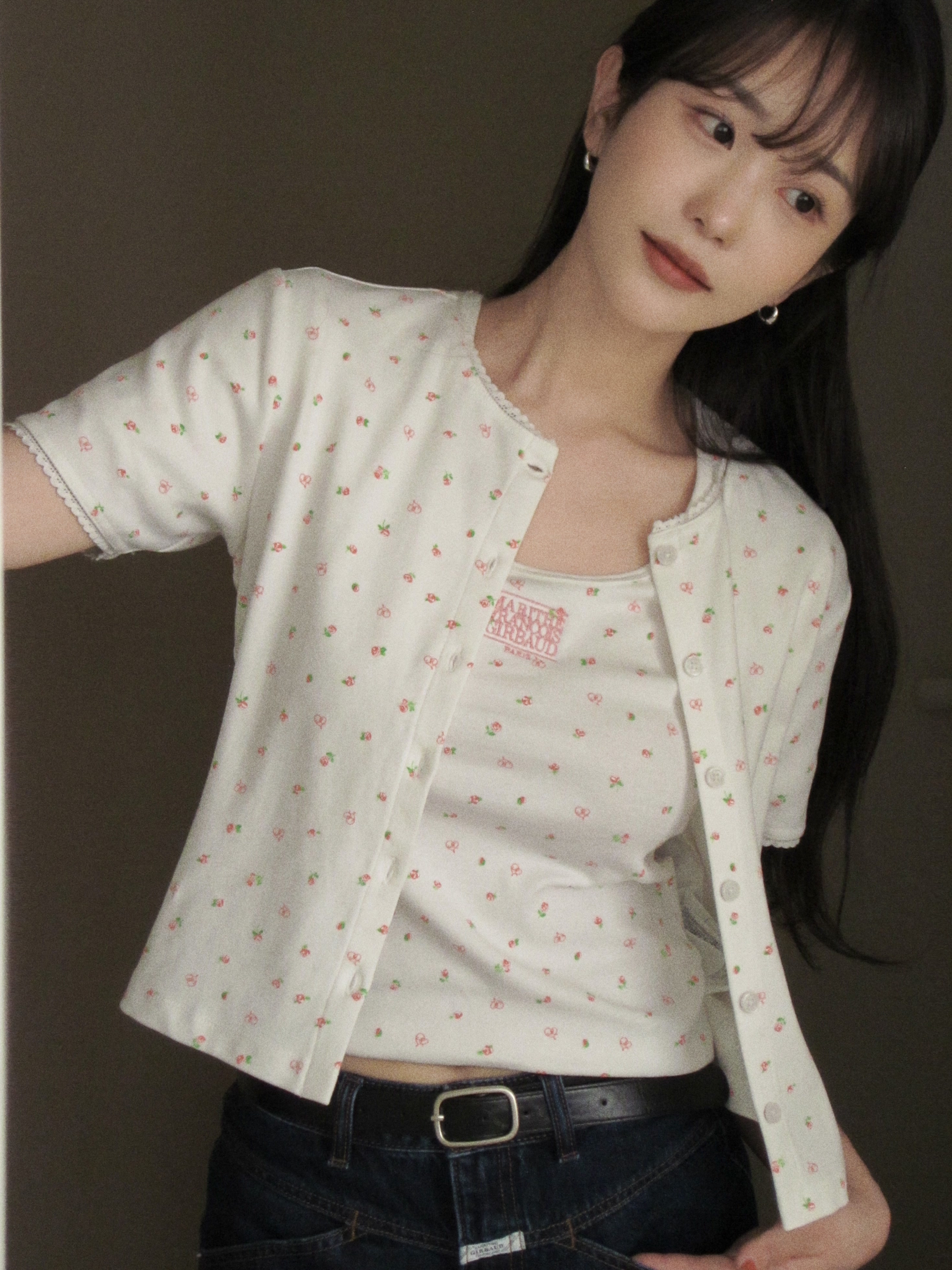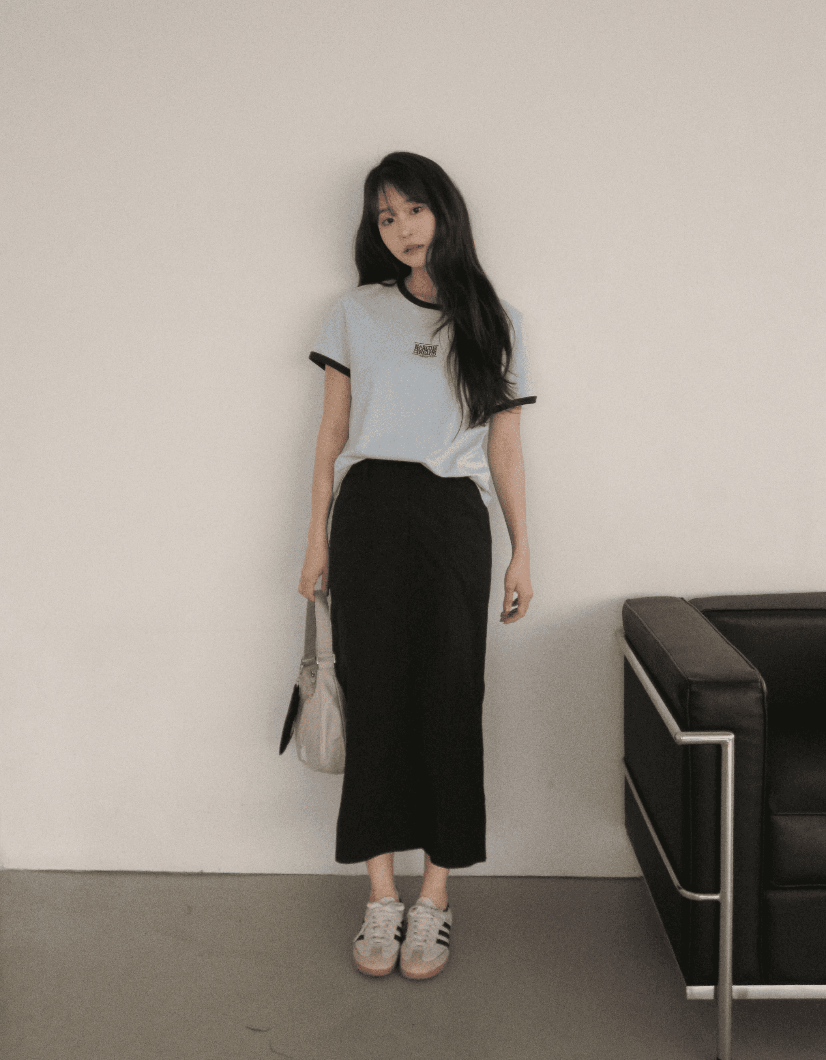 활용도 높은 면 카디건 세트와 티셔츠, 슬리브리스는 캐주얼한 데님 스커트와 조화를 이루어 편안하고 세련된 분위기를 완성합니다.