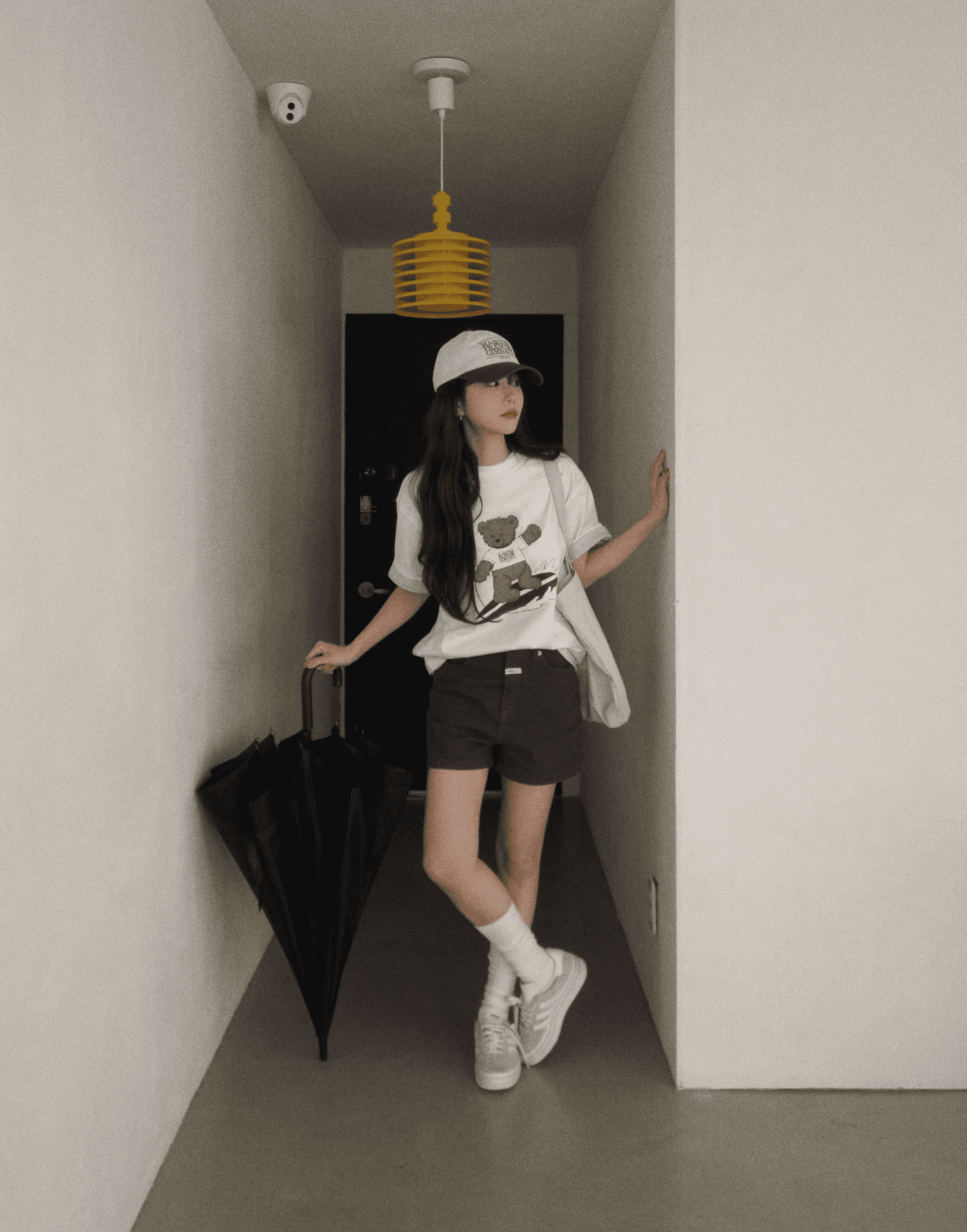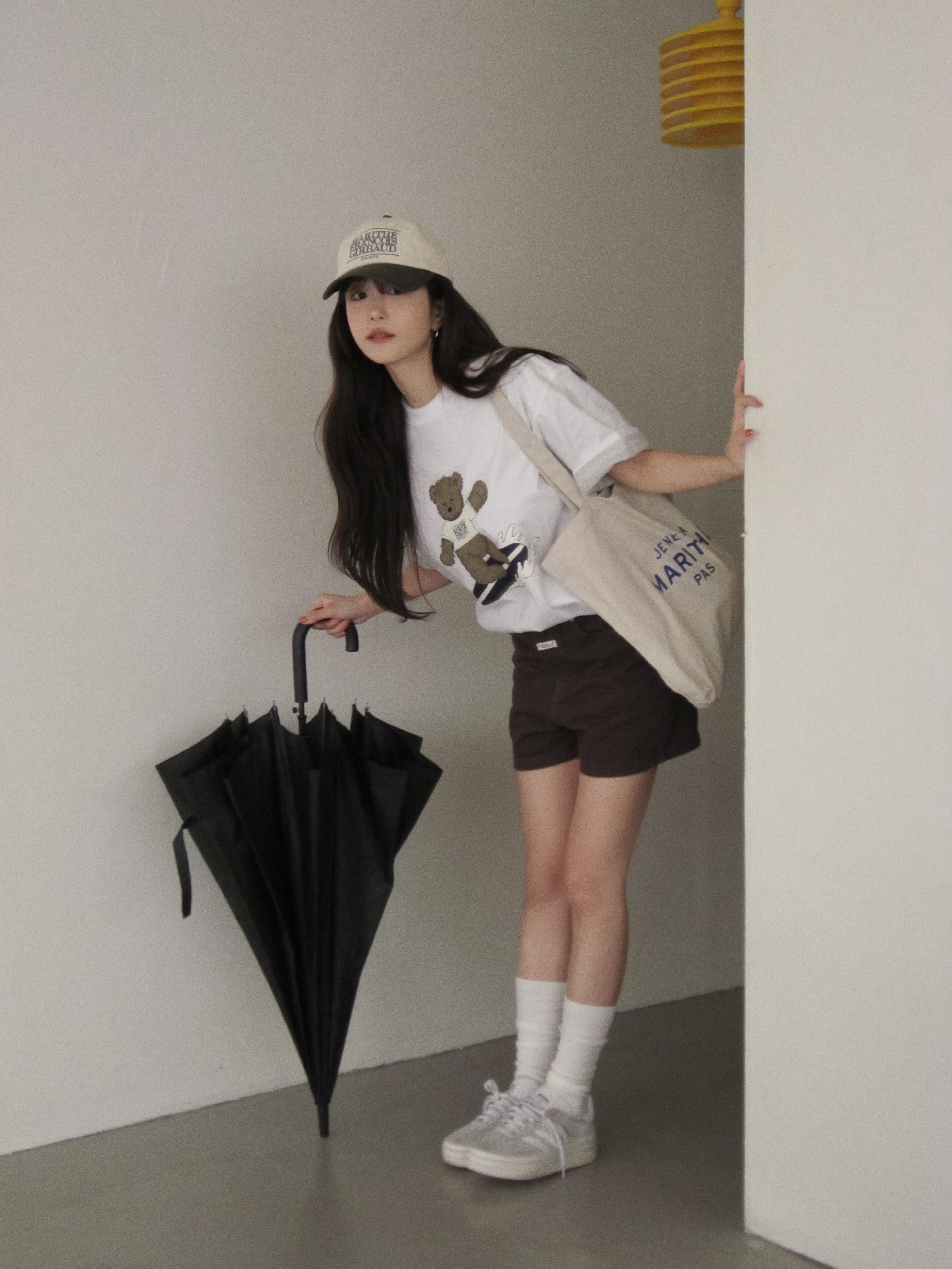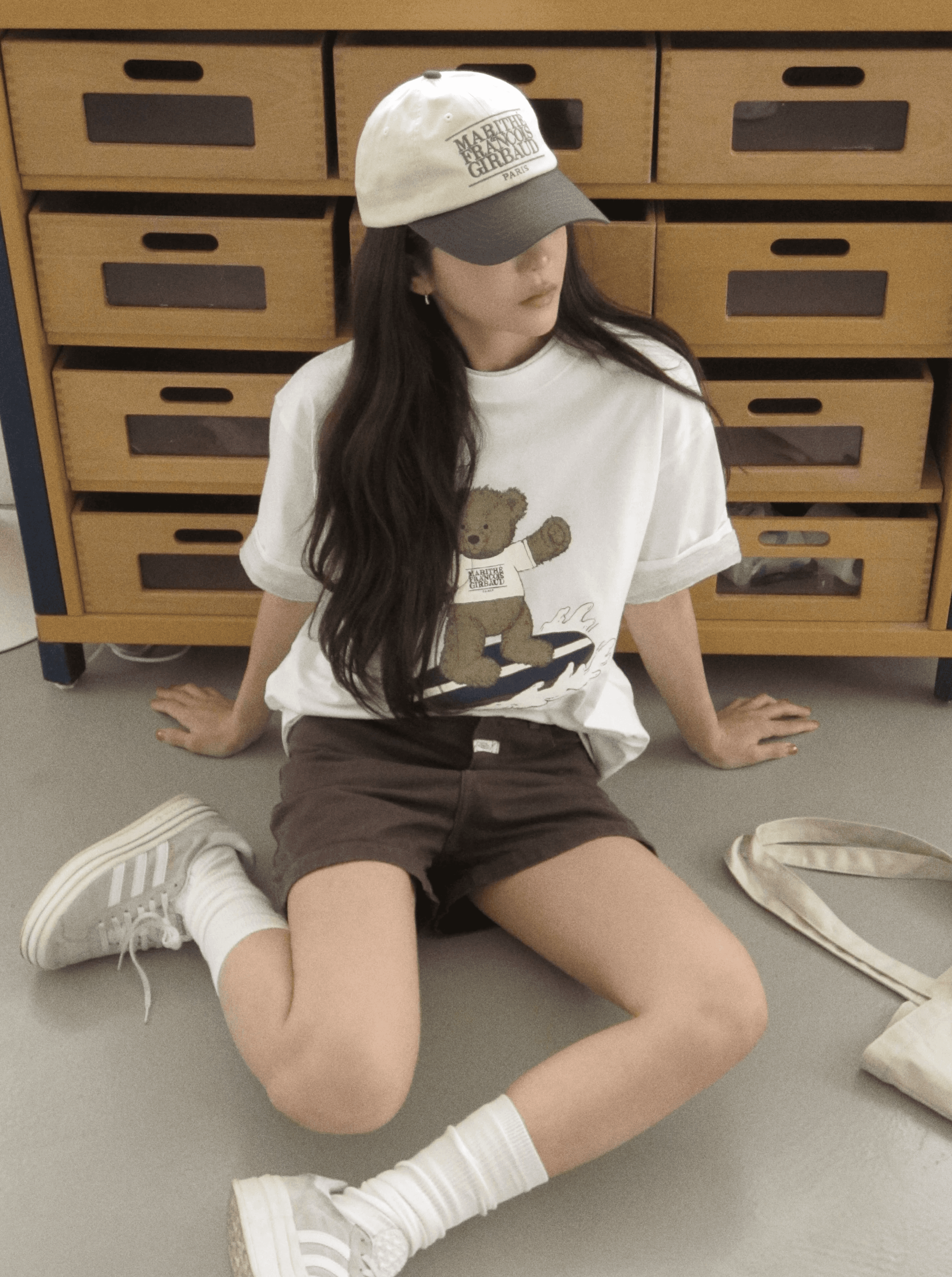 귀여운 두들베어 서핑 그래픽 티셔츠와 빈티지 분위기의 색감이 돋보이는 쇼츠로 청량한 스타일을 완성했어요.
