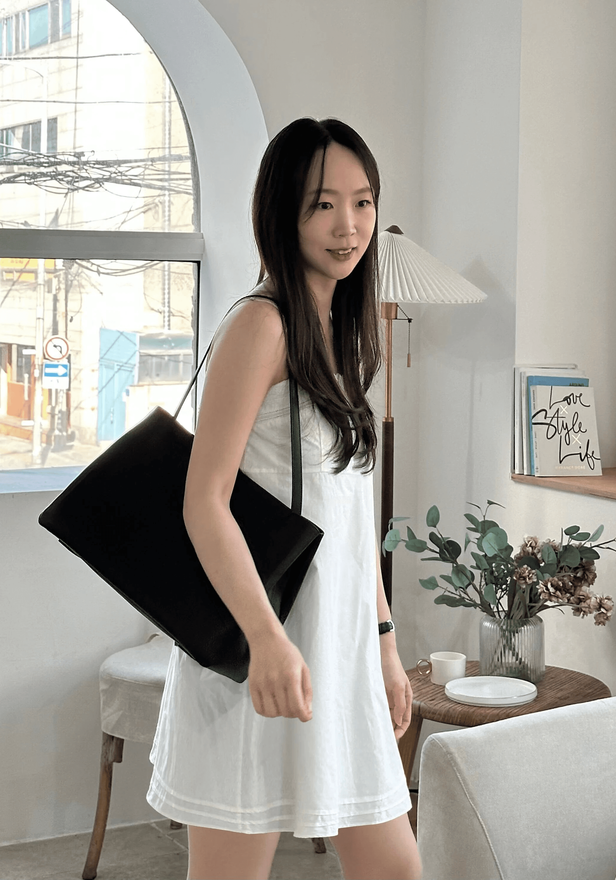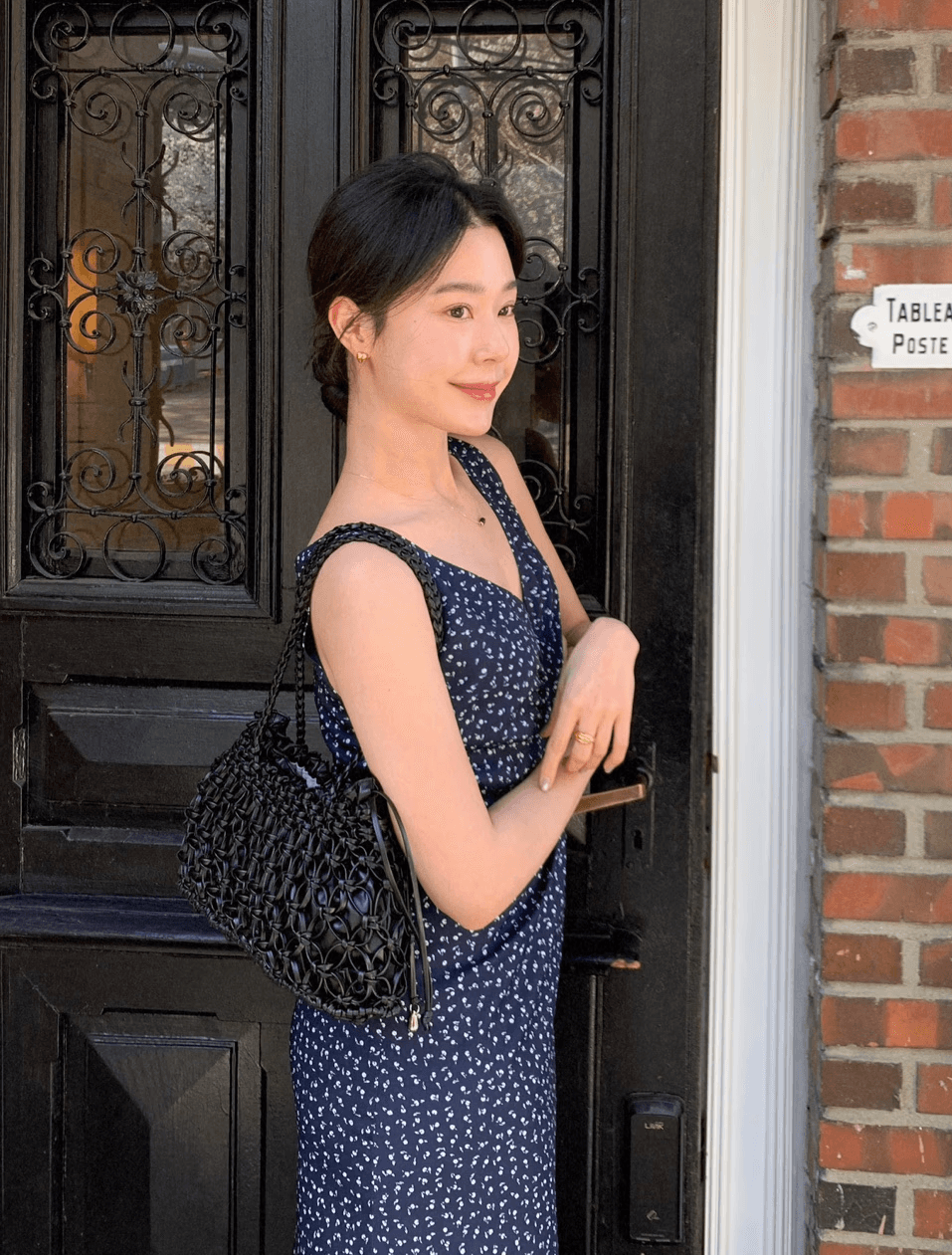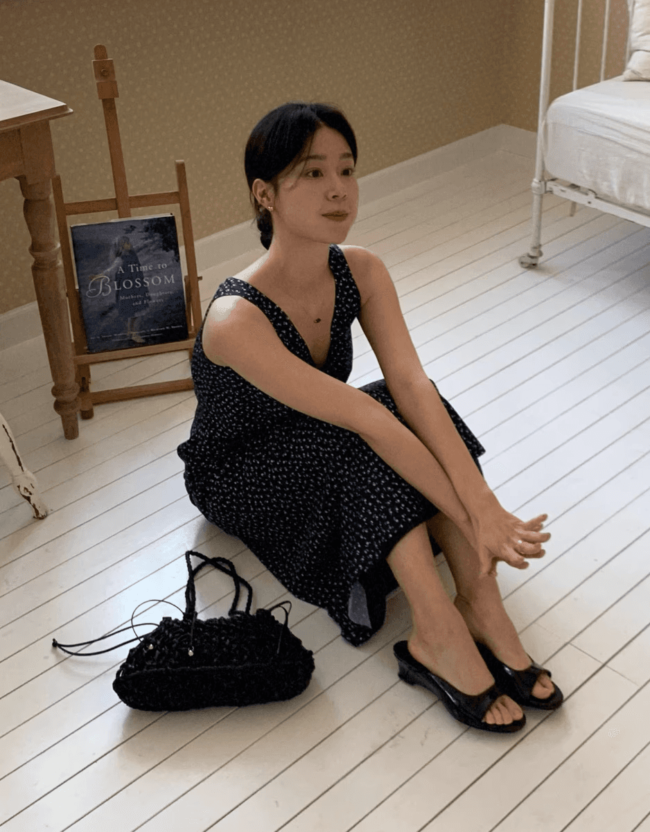 잔잔한 플라워 패턴이 은은하게 감도는 롱 드레스를 입었어요. 깊게 파인 브이 넥 라인과 슬림하게 떨어지는 실루엣은 사랑스러움을 더해줍니다. 가볍게 묶은 니트로 여유로운 포인트와 함게 한여름에도 시원하게 즐기기 좋은 스타일이에요.