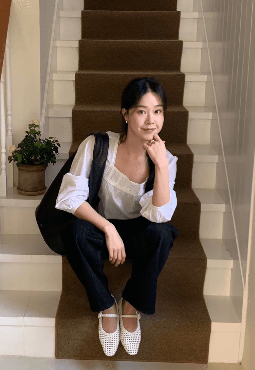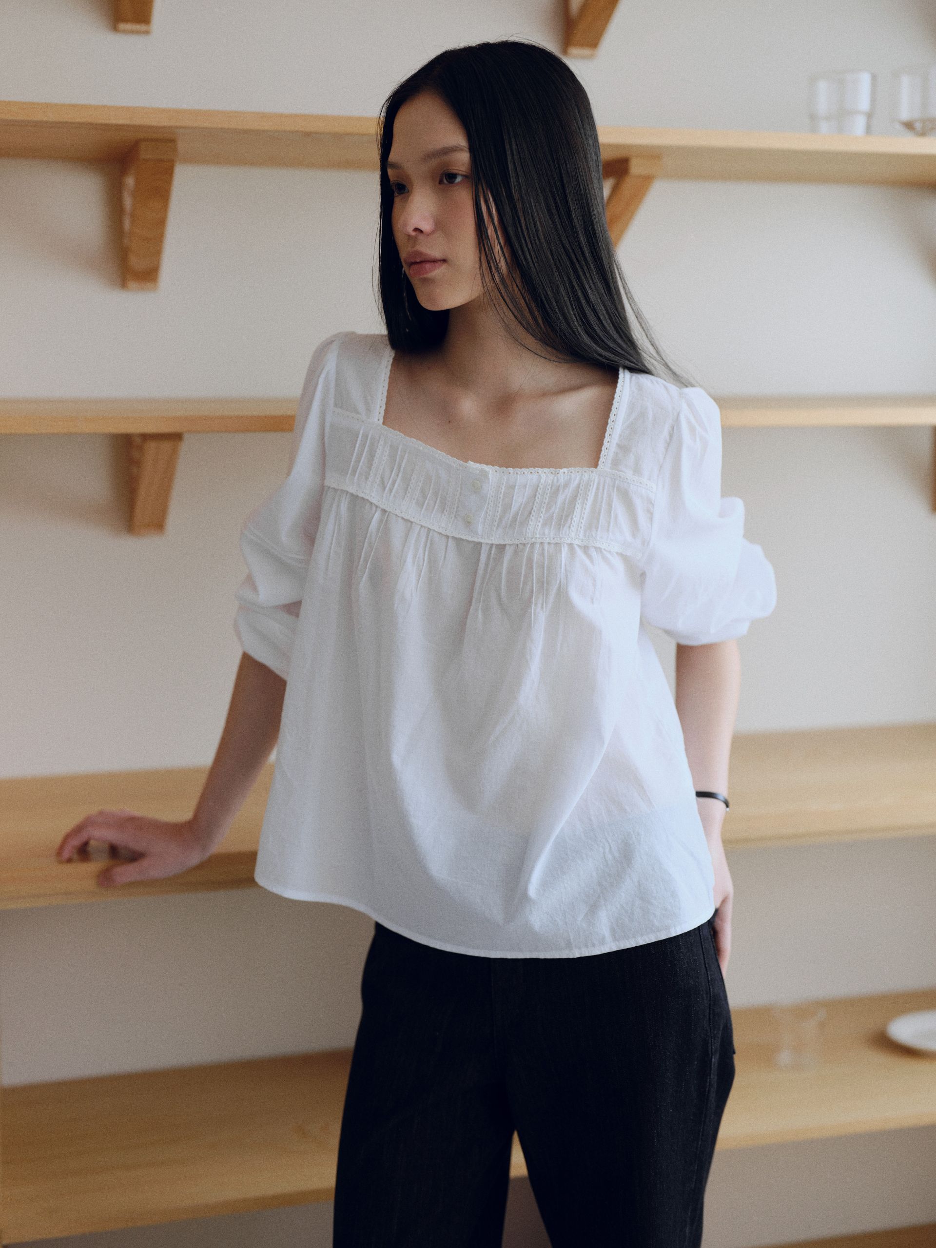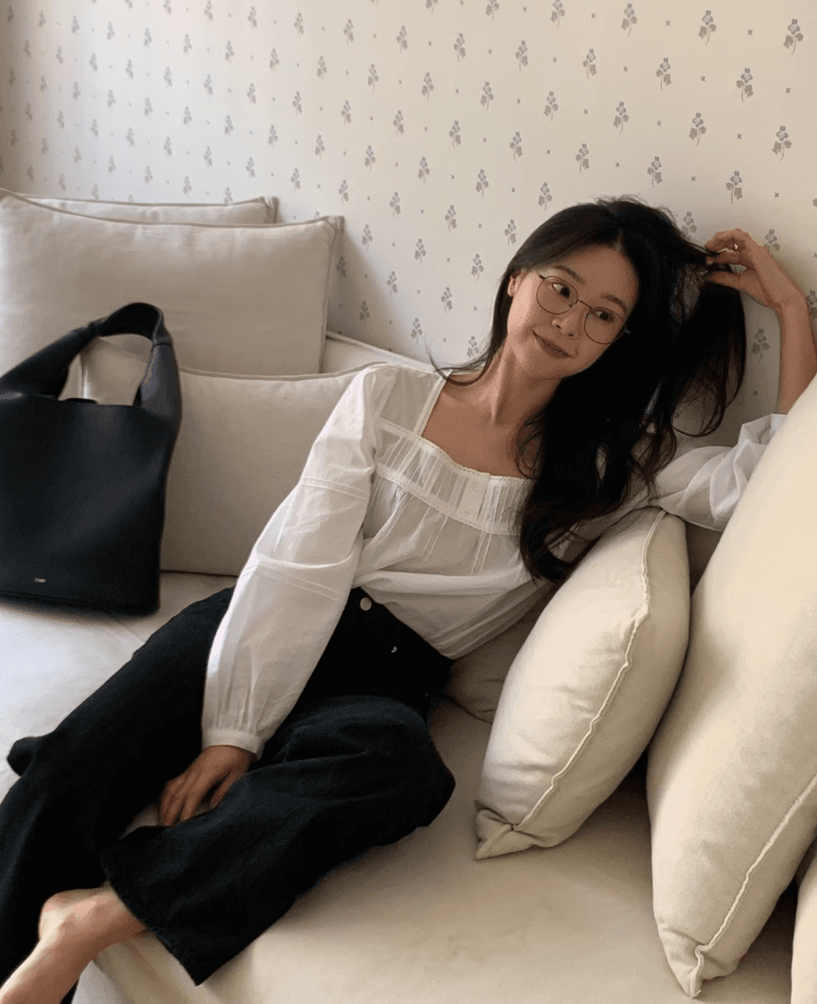 스퀘어 넥 라인으로 여리여리한 실루엣을 연출해 주는 블라우스와 와이드핏의 로우 라이즈 데님을 매치했어요. 클래식한 감성과 로맨틱 무드로 세련된 실루엣을 완성해 보세요.
