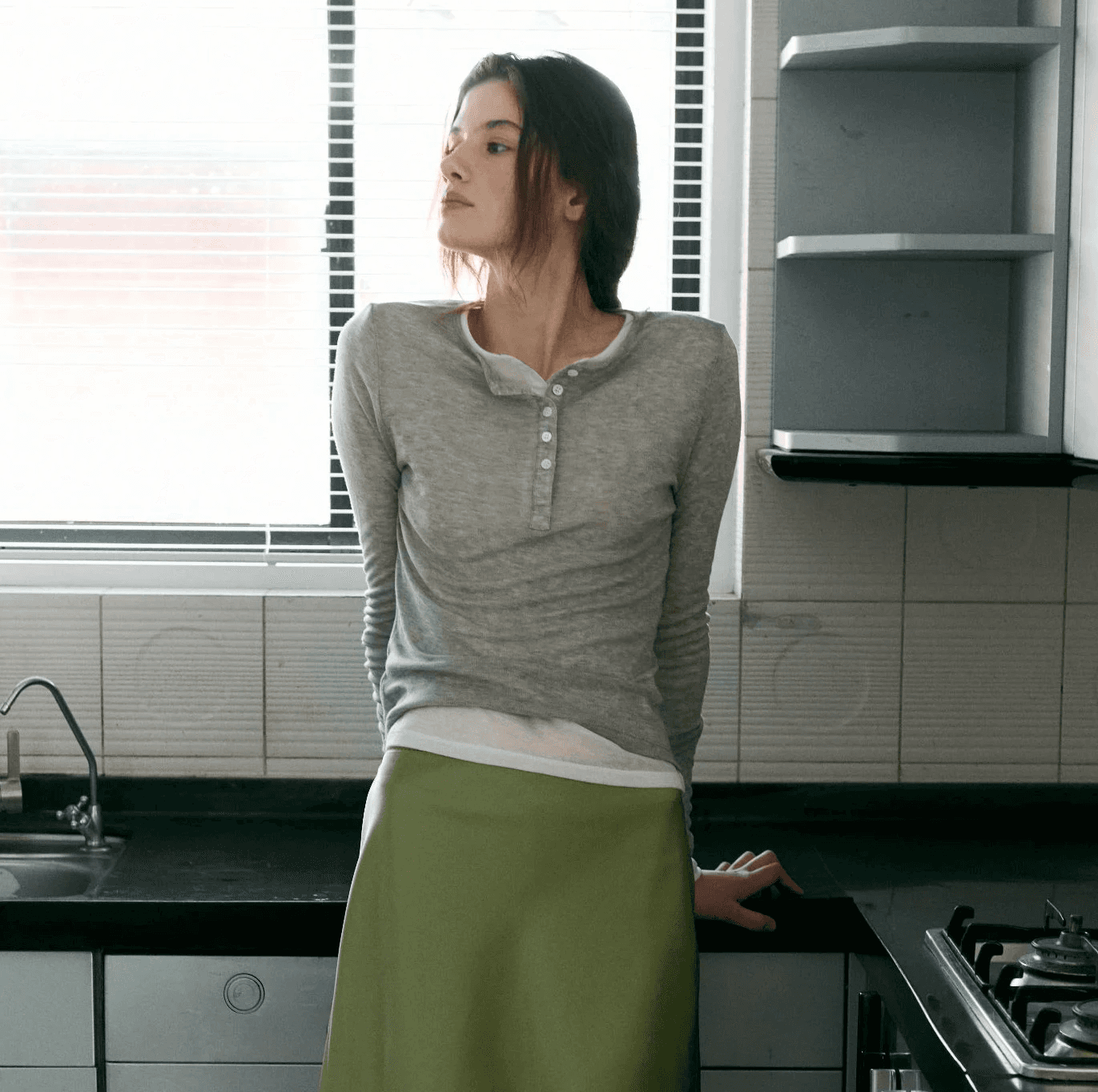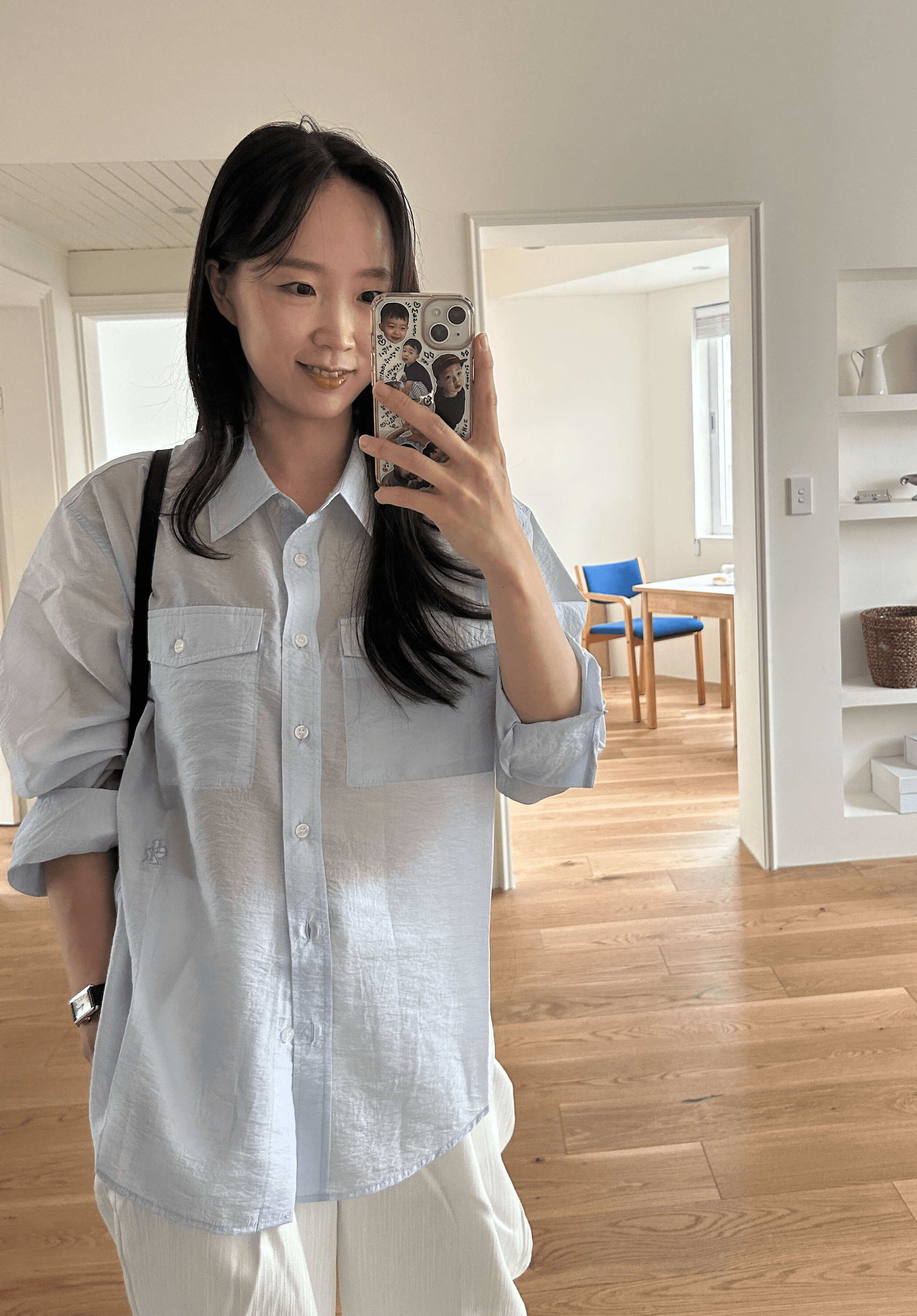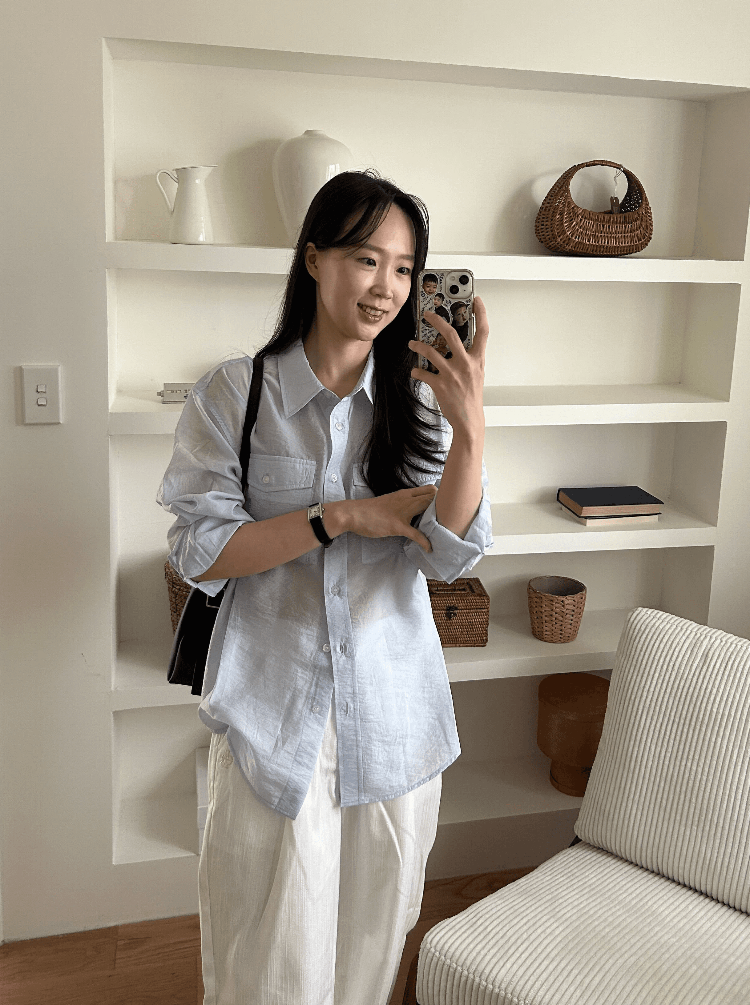 자연스럽게 흐르는 루즈한 실루엣의 셔츠와 화이트 원턱 팬츠를 매치해 보았습니다. 은은한 광택감과 시어한 느낌이 우아한 분위기를 자아내요.
