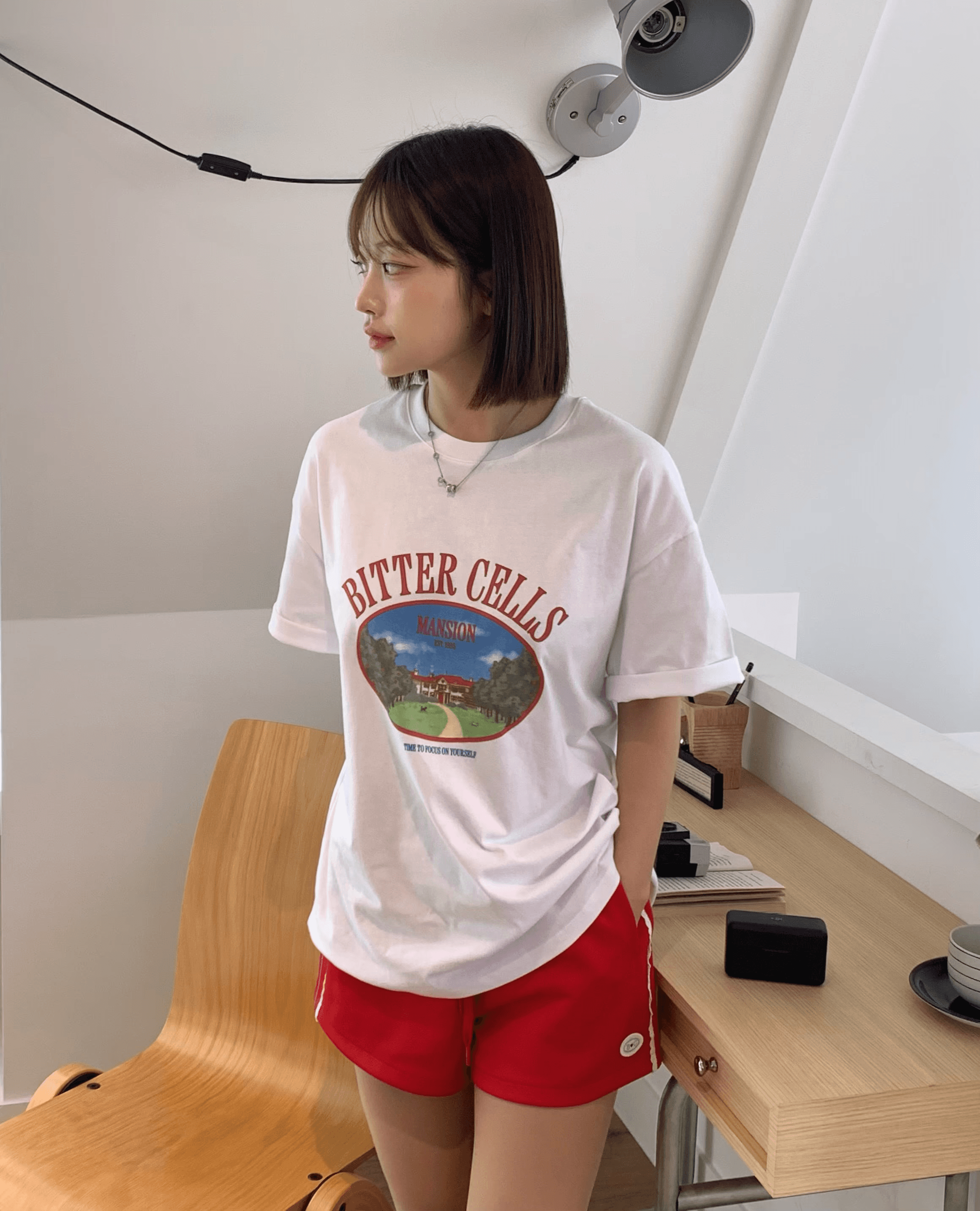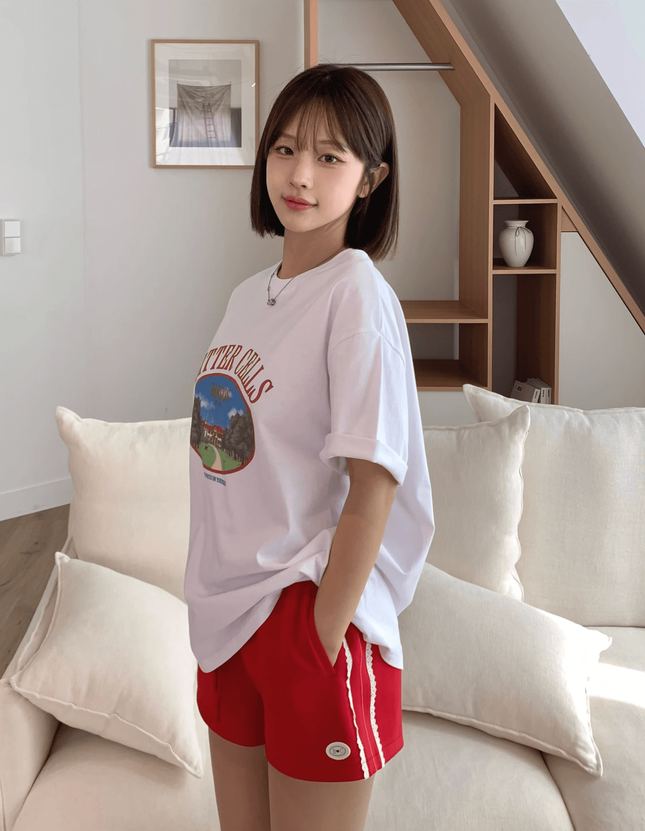 수채화 느낌의 빈티지 무드 오버핏 티셔츠와 옆선 레이스가 매력적인 쇼츠를 매치했어요.