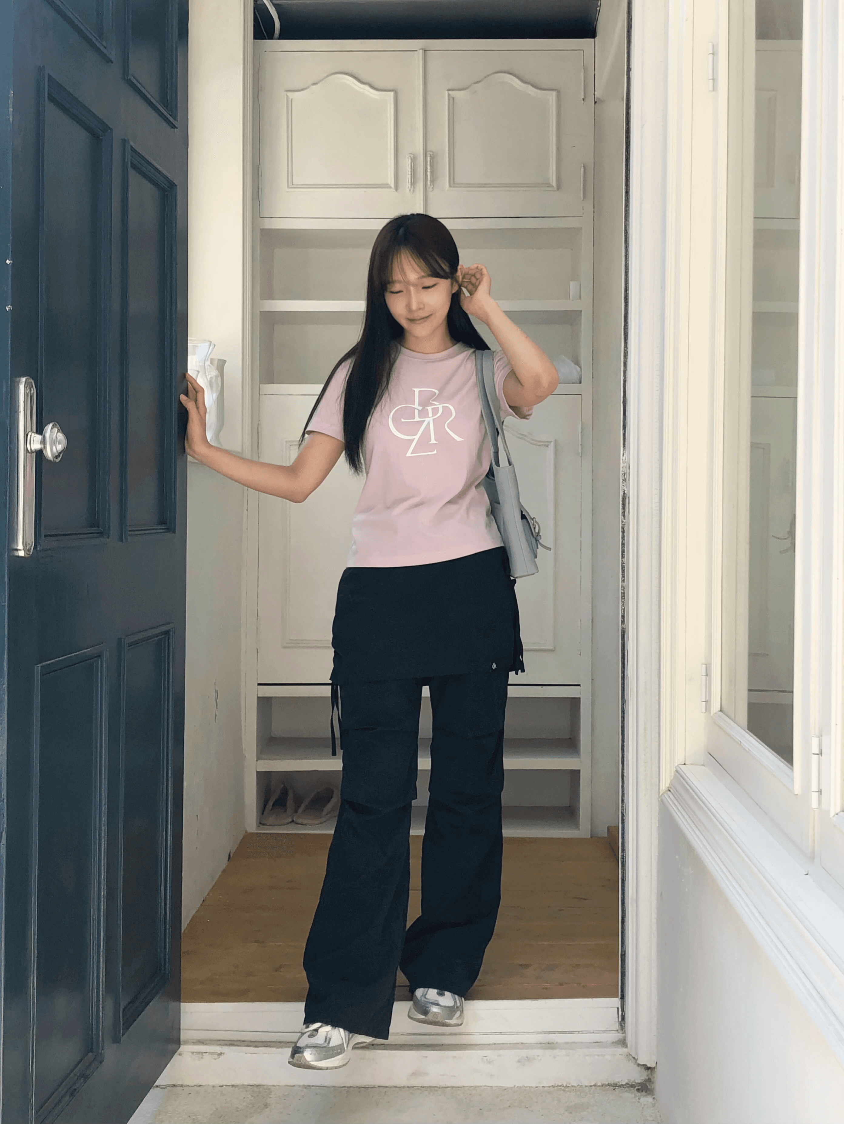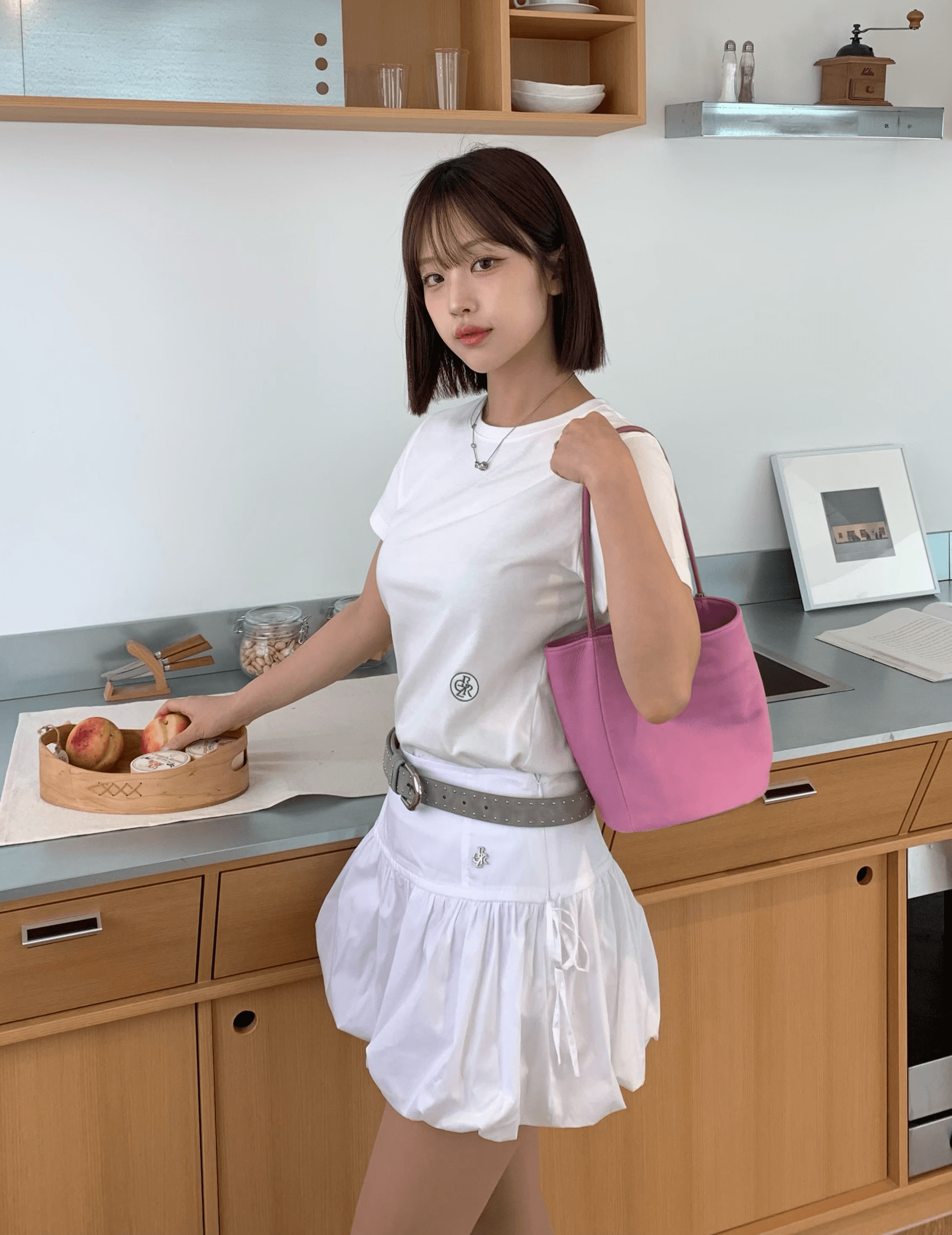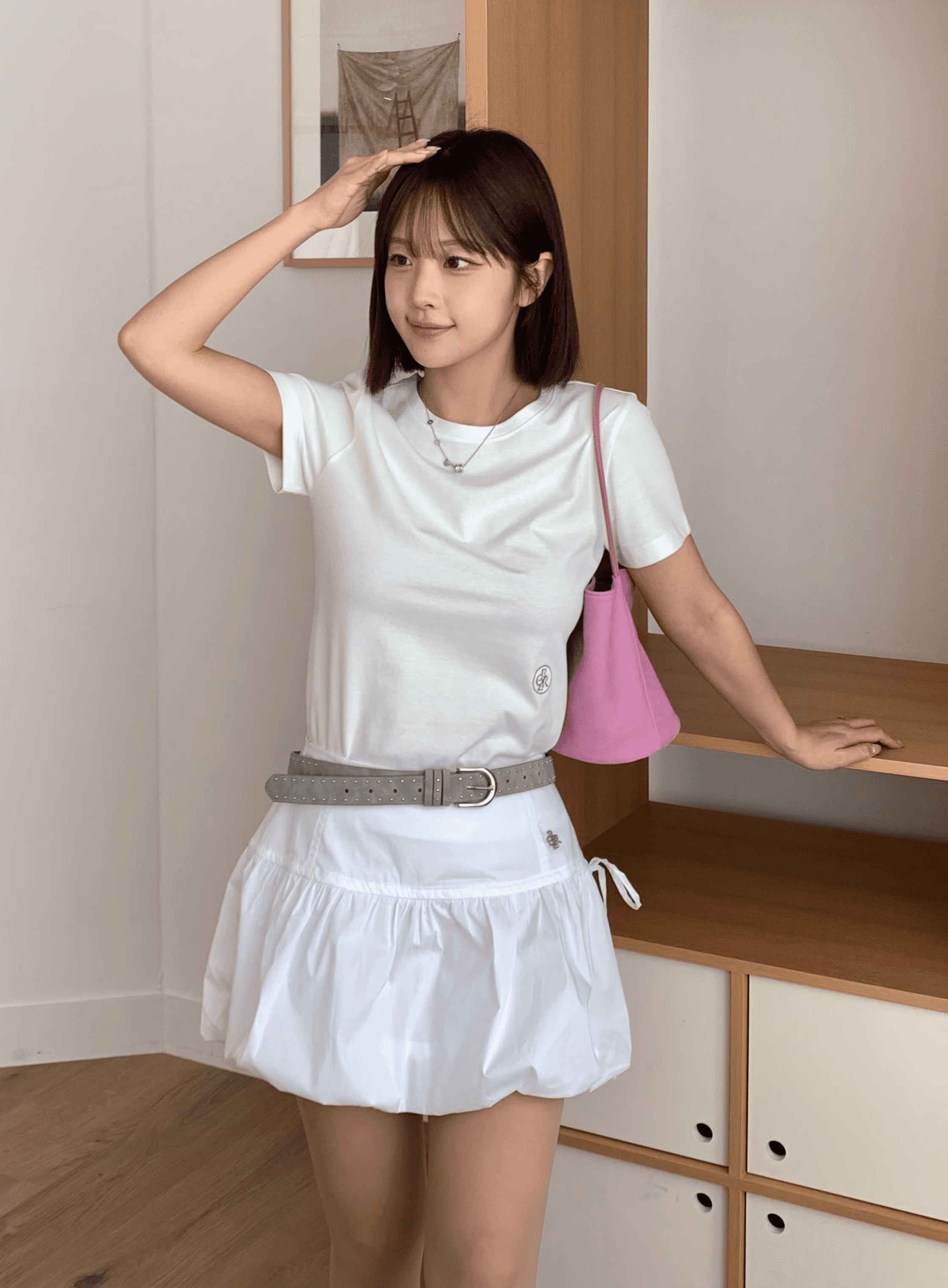 부담스럽지 않은 미니 로고 티셔츠에 벌룬 미니 스커트를 매치해 캐주얼 룩을 완성했어요.