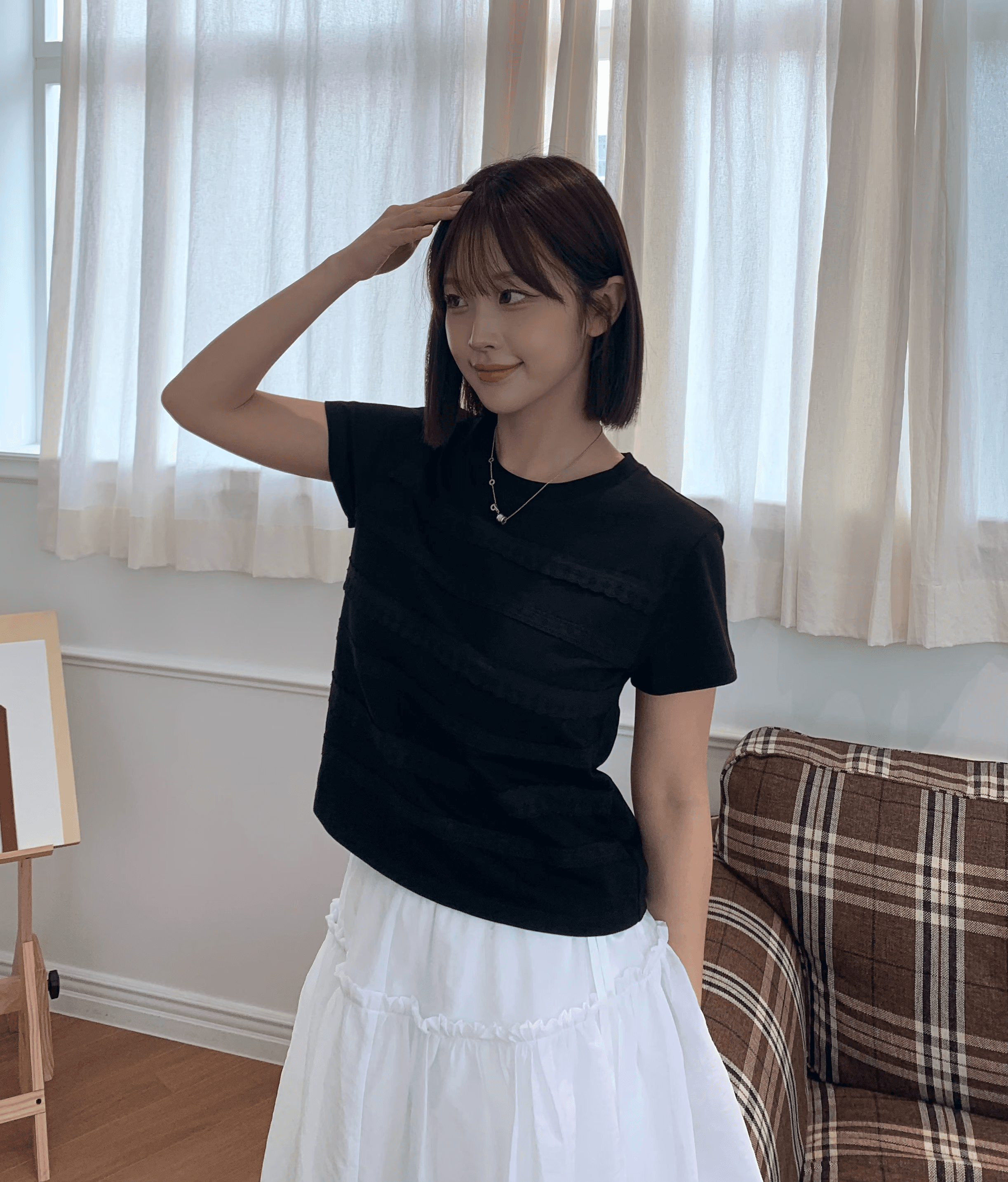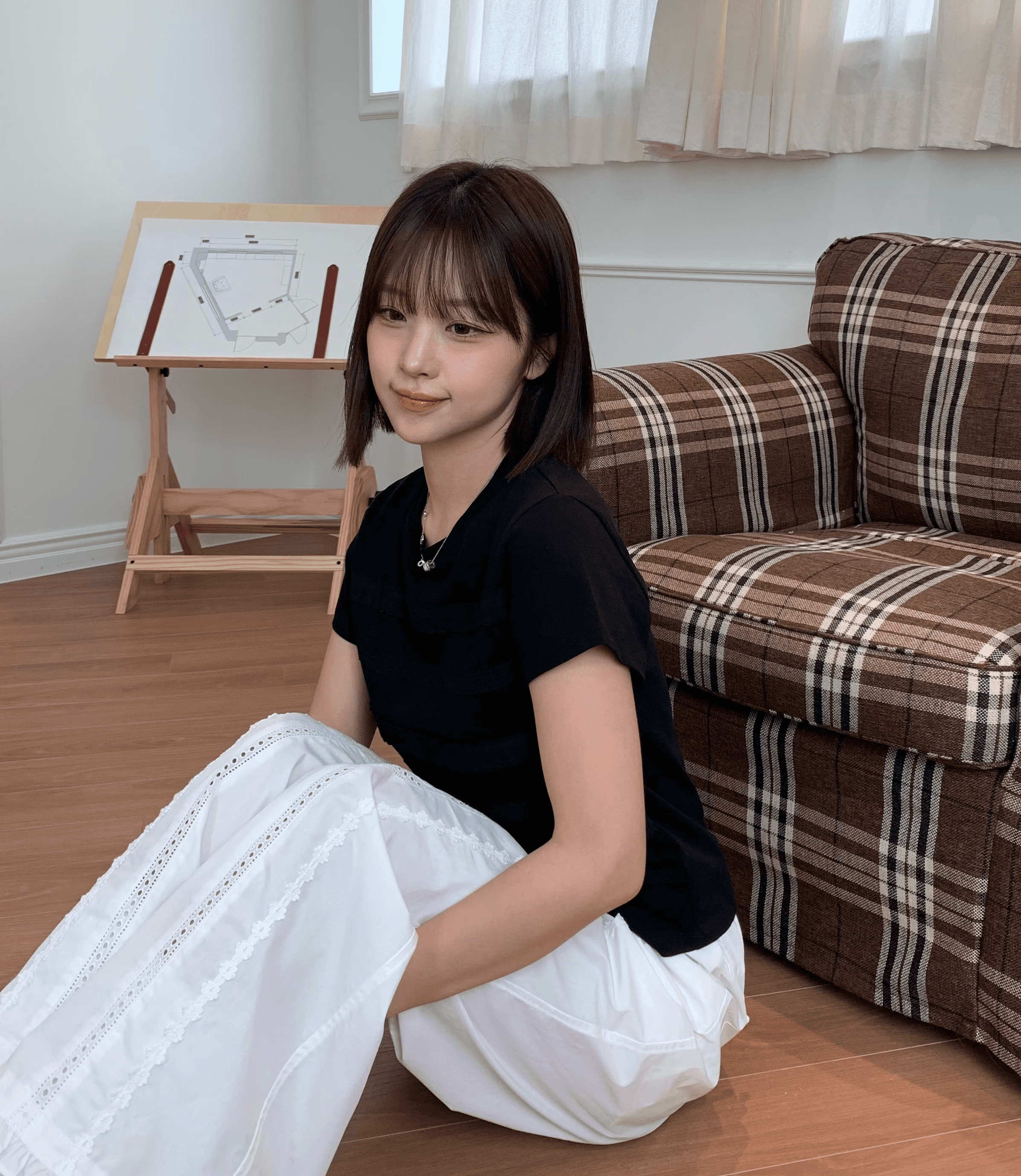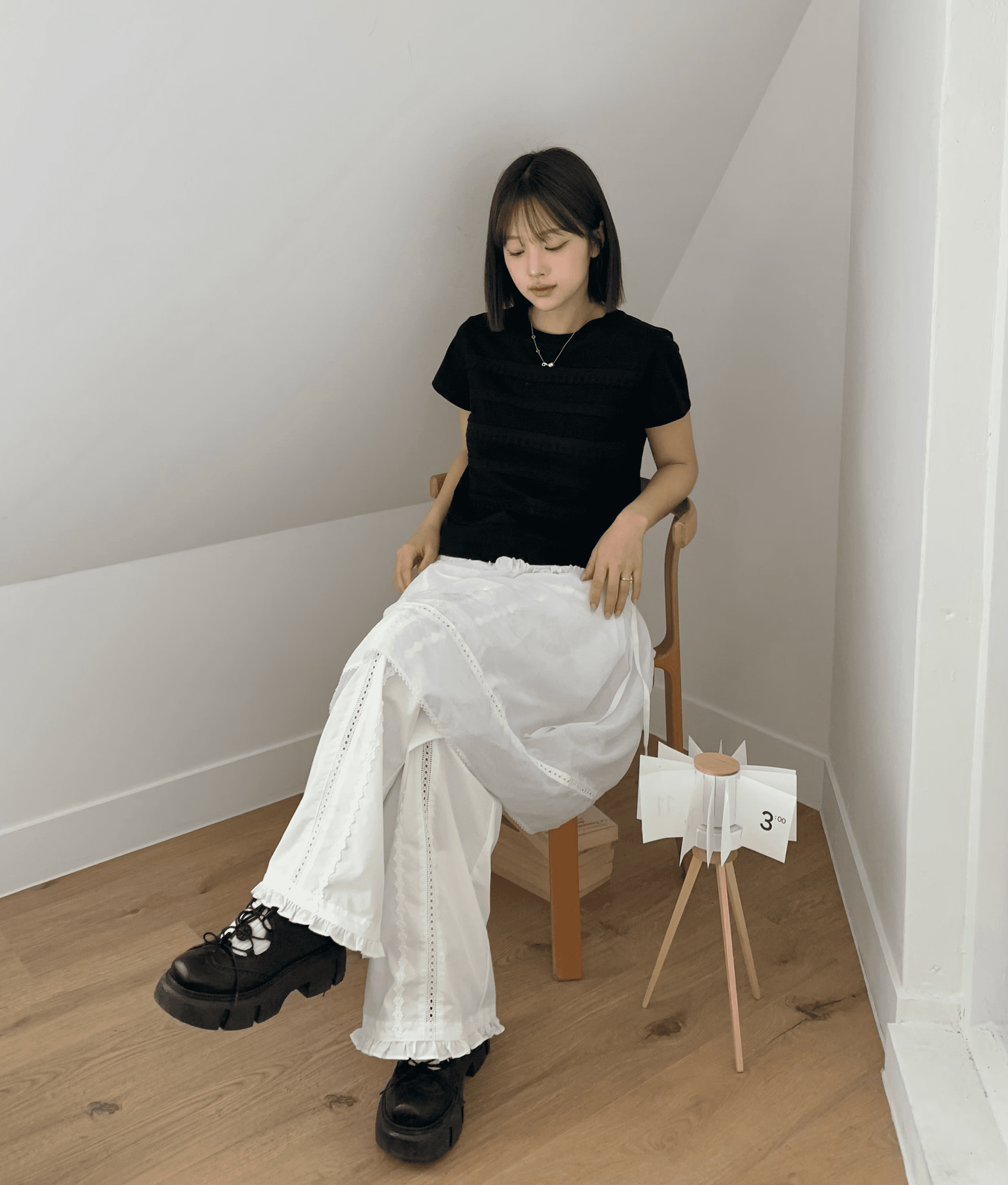 은은한 펀칭 디테일의 스쿱넥 티셔츠와 로맨틱 레이스 디테일이 돋보이는 스커트로 사랑스러운 여름 데이트 룩을 완성했어요.