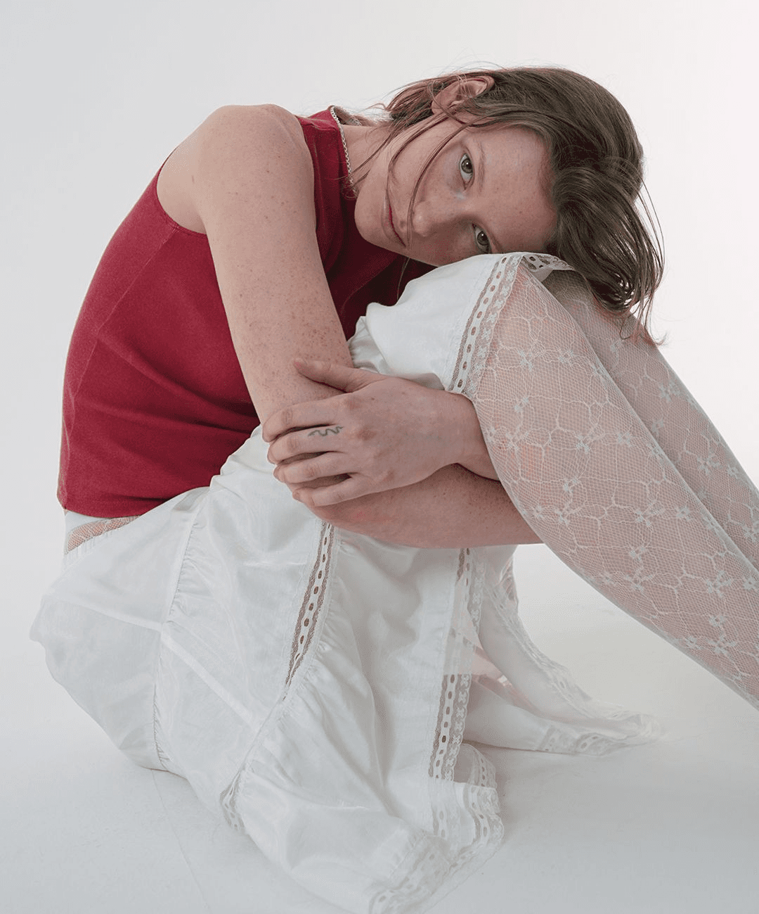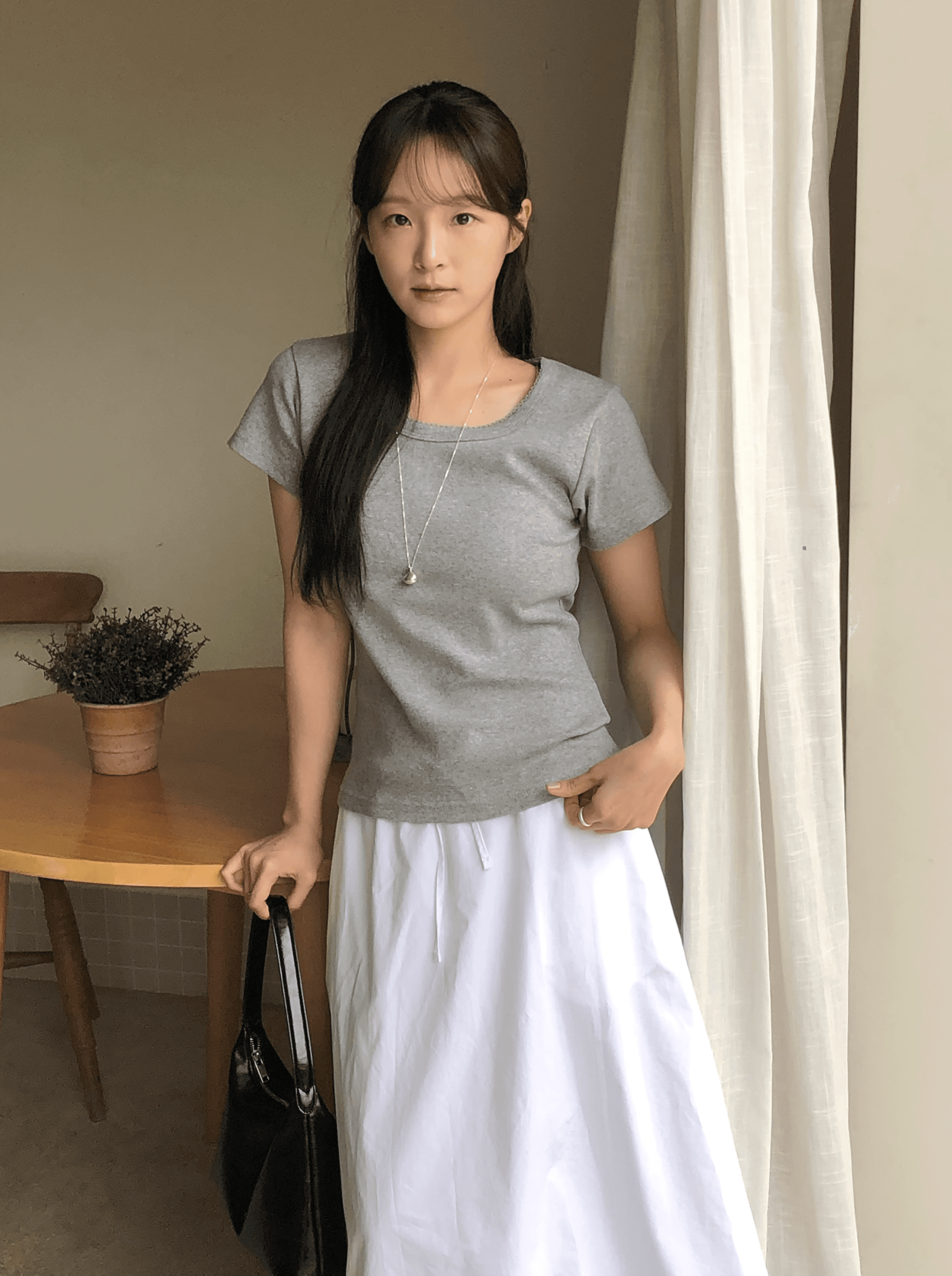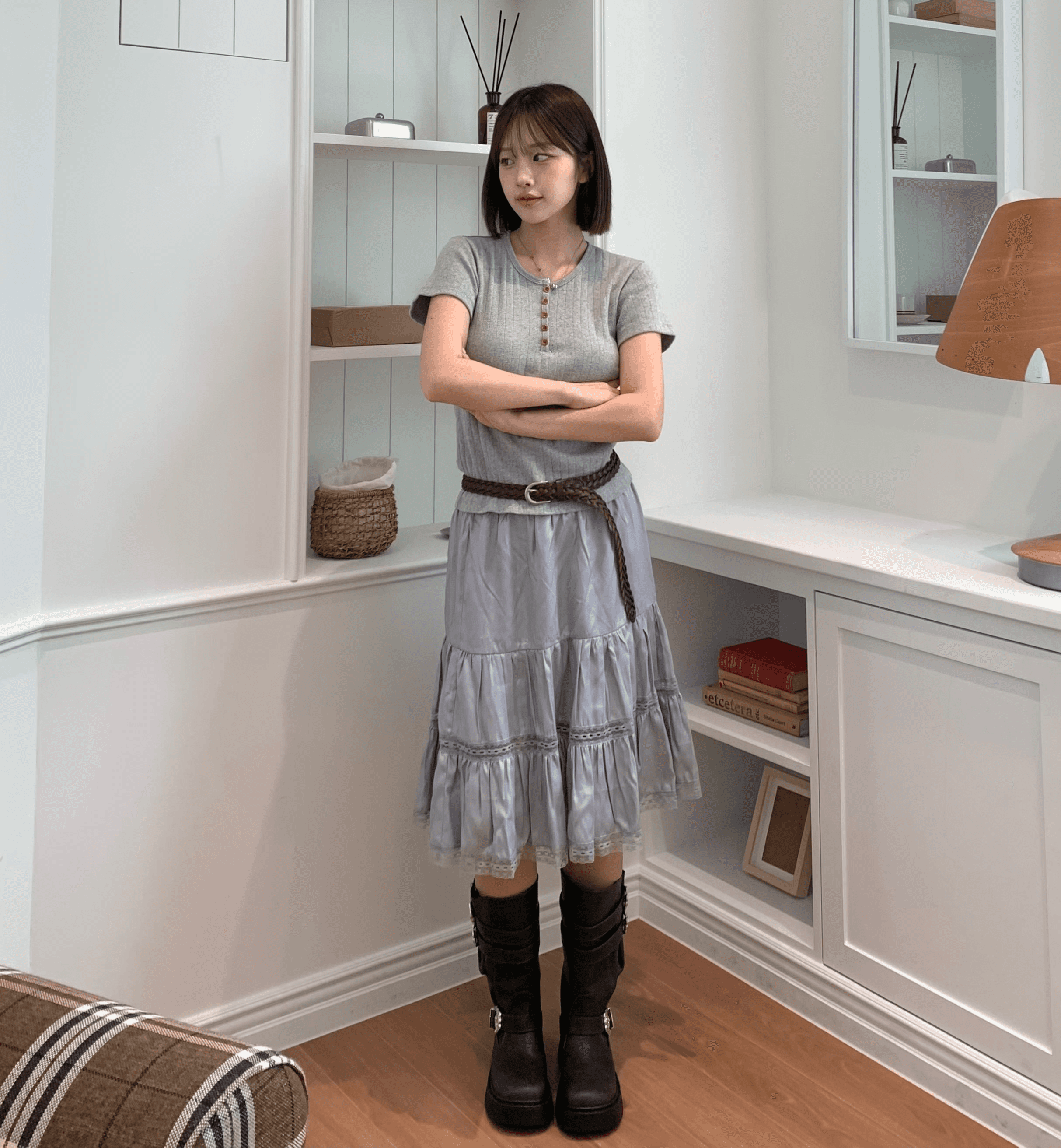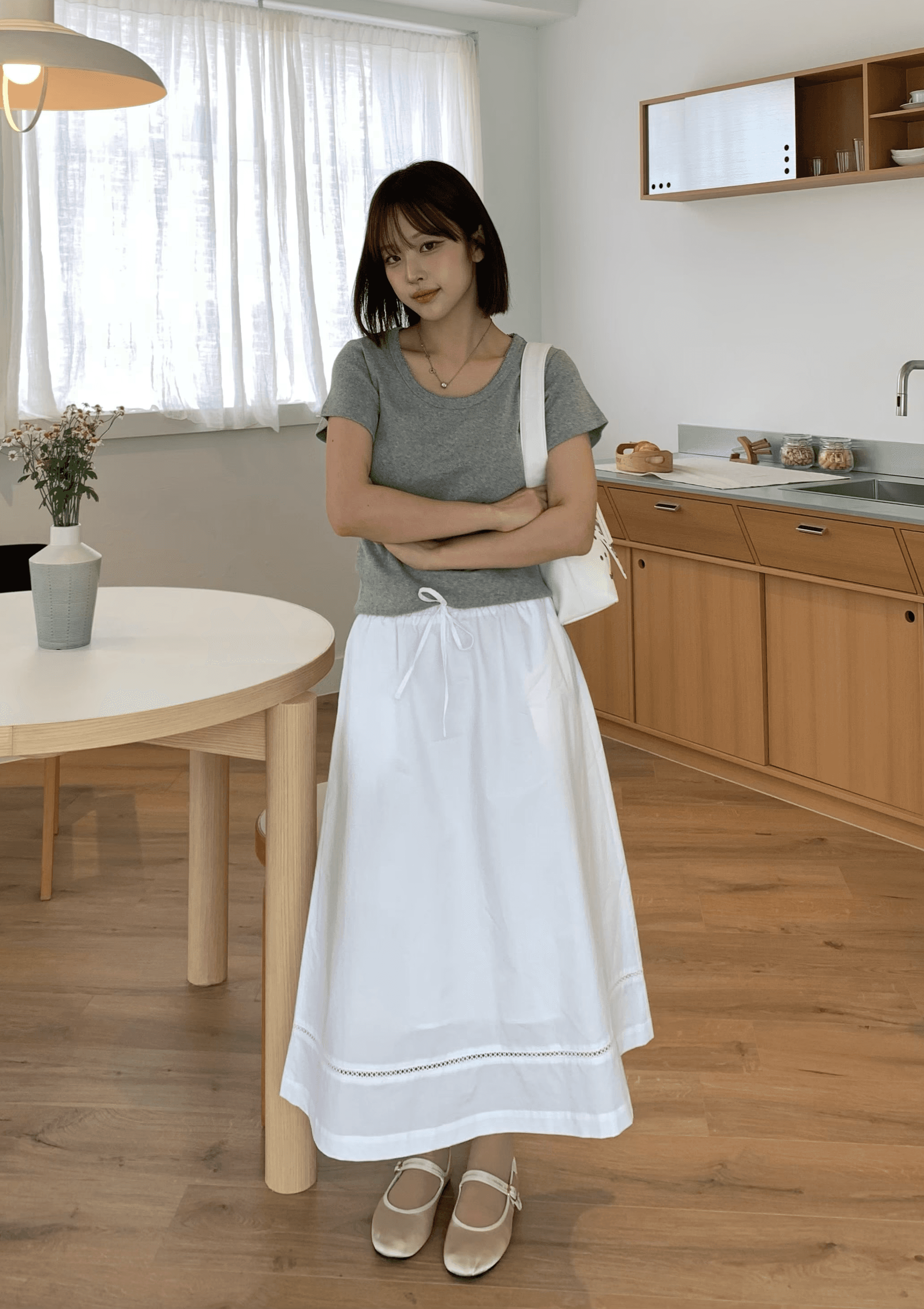 은은한 펀칭 디테일의 스쿱넥 티셔츠와 로맨틱 레이스 디테일이 돋보이는 스커트로 사랑스러운 여름 데이트 룩을 완성했어요.