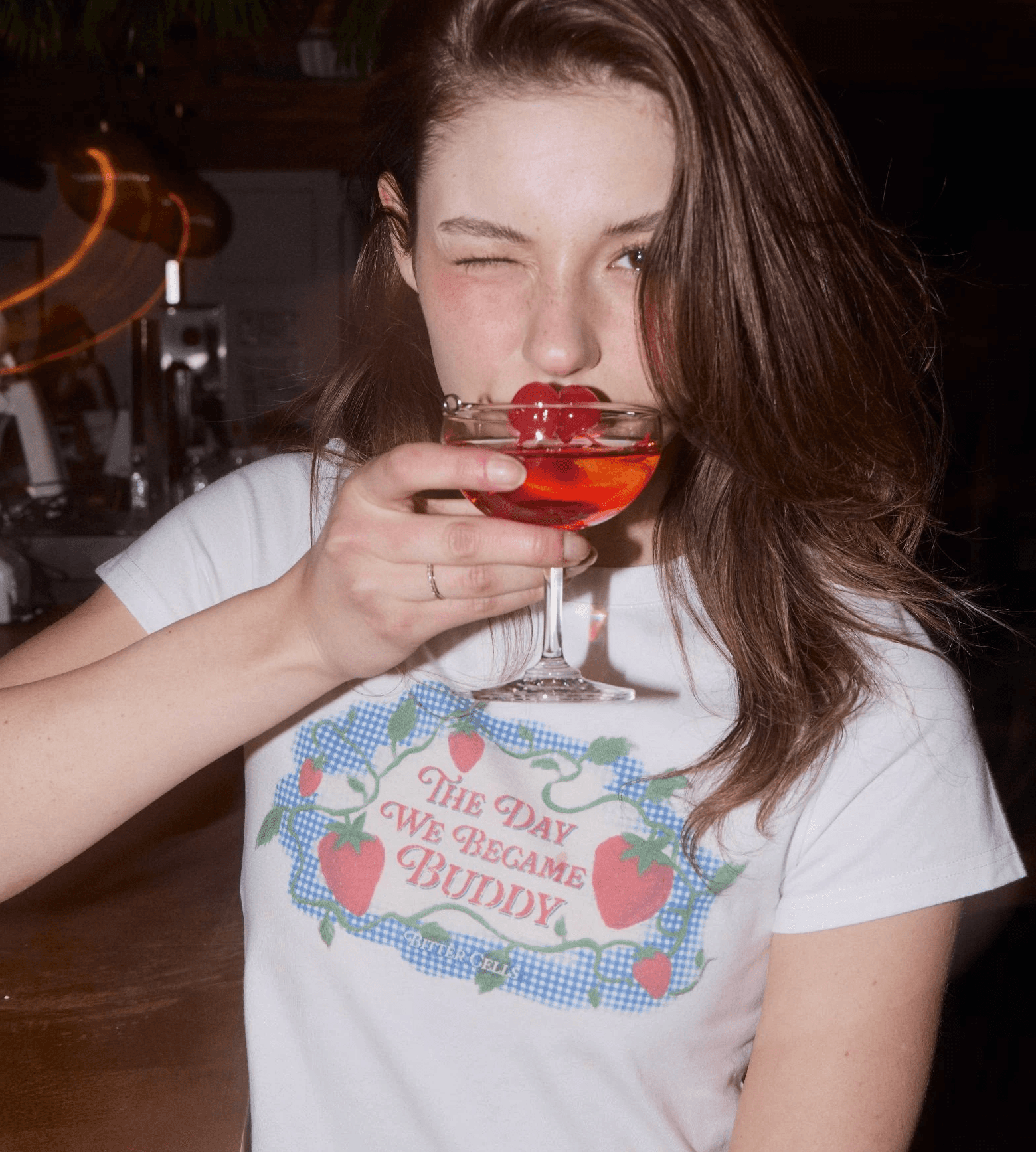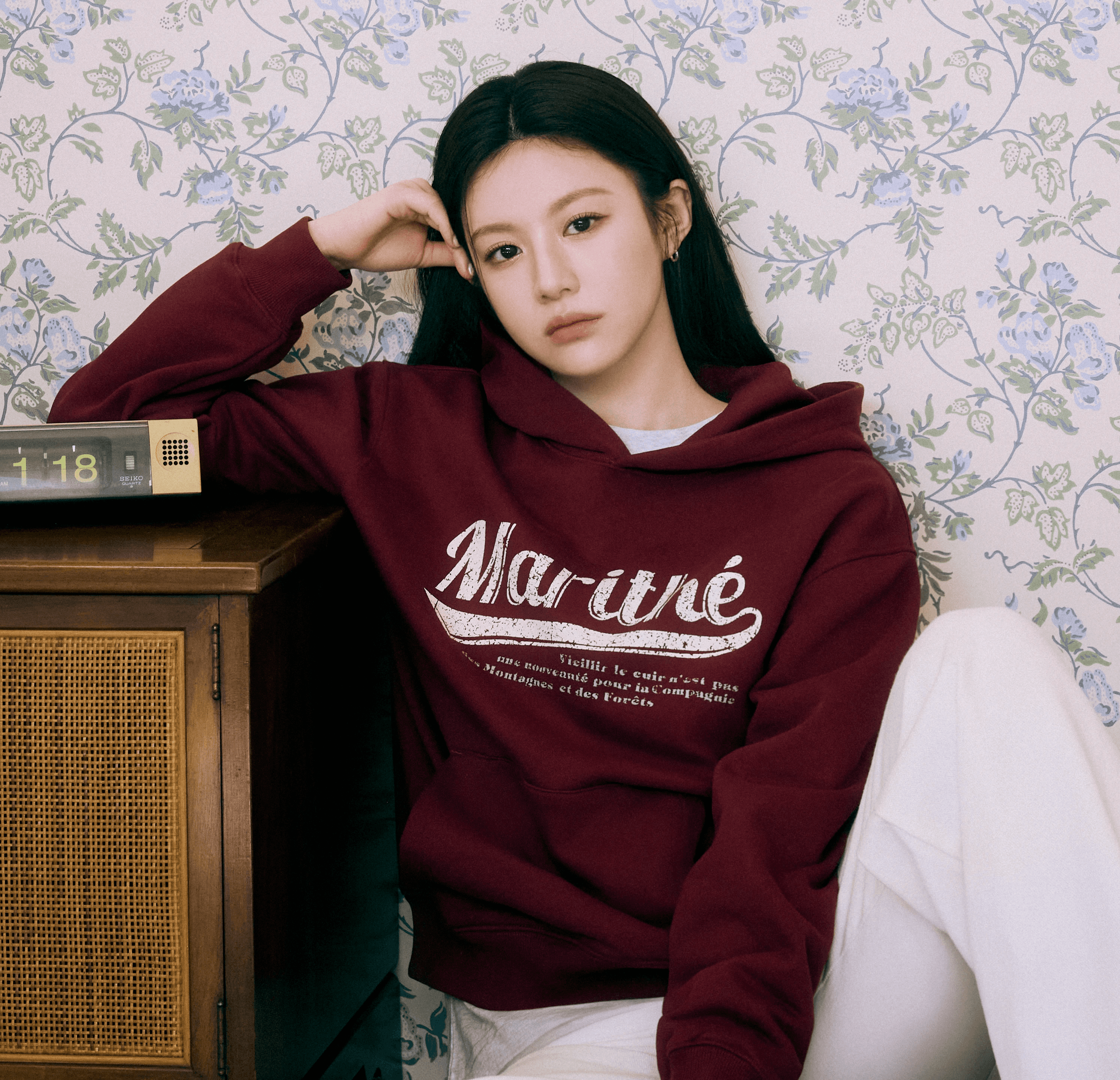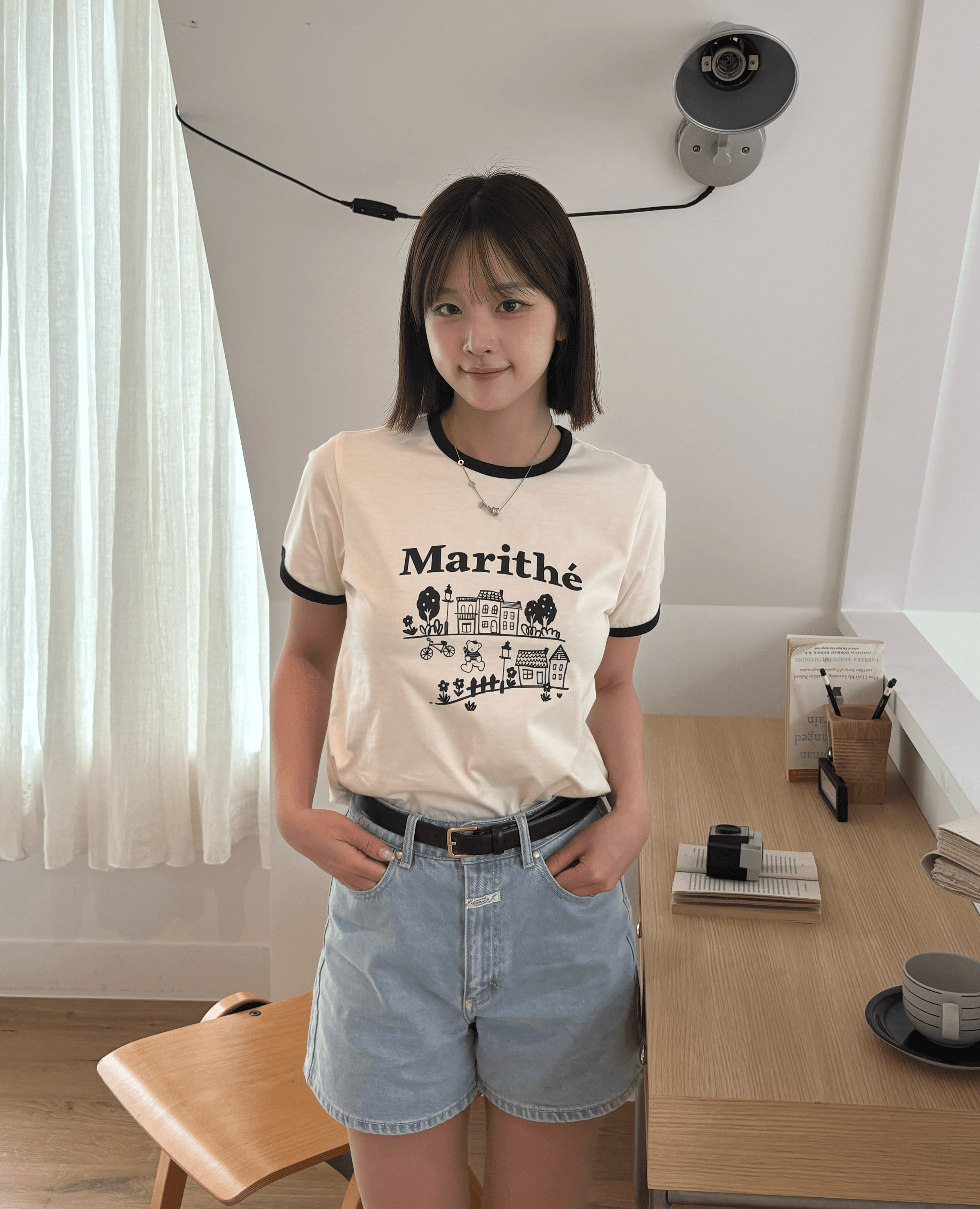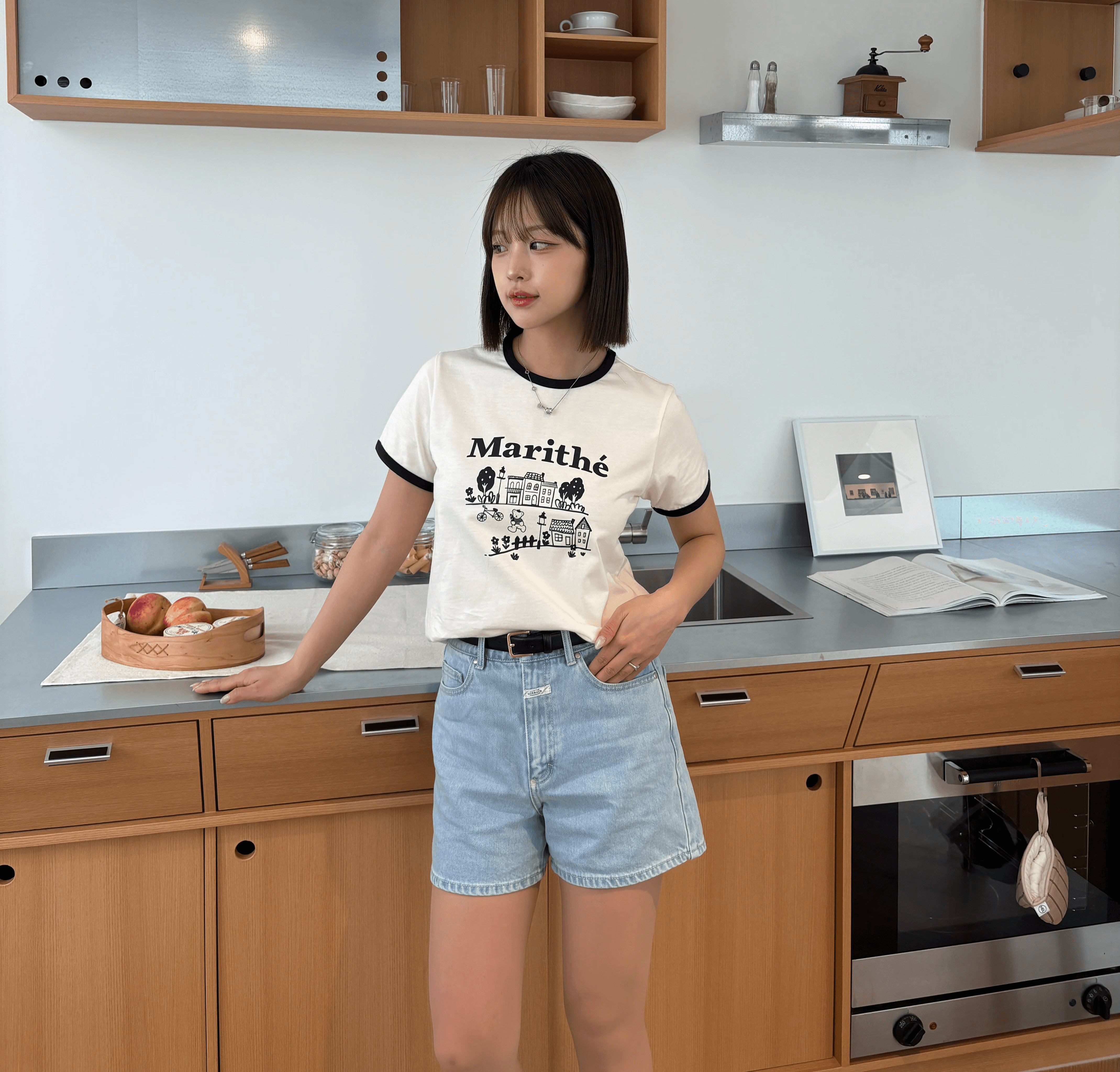 그래픽이 매력적인 스탠다드 핏 링거 티셔츠와 마리떼 프랑소와 저버만의 시그니처 디테일이 매력적인 짧은 데님 팬츠를 매치했어요.