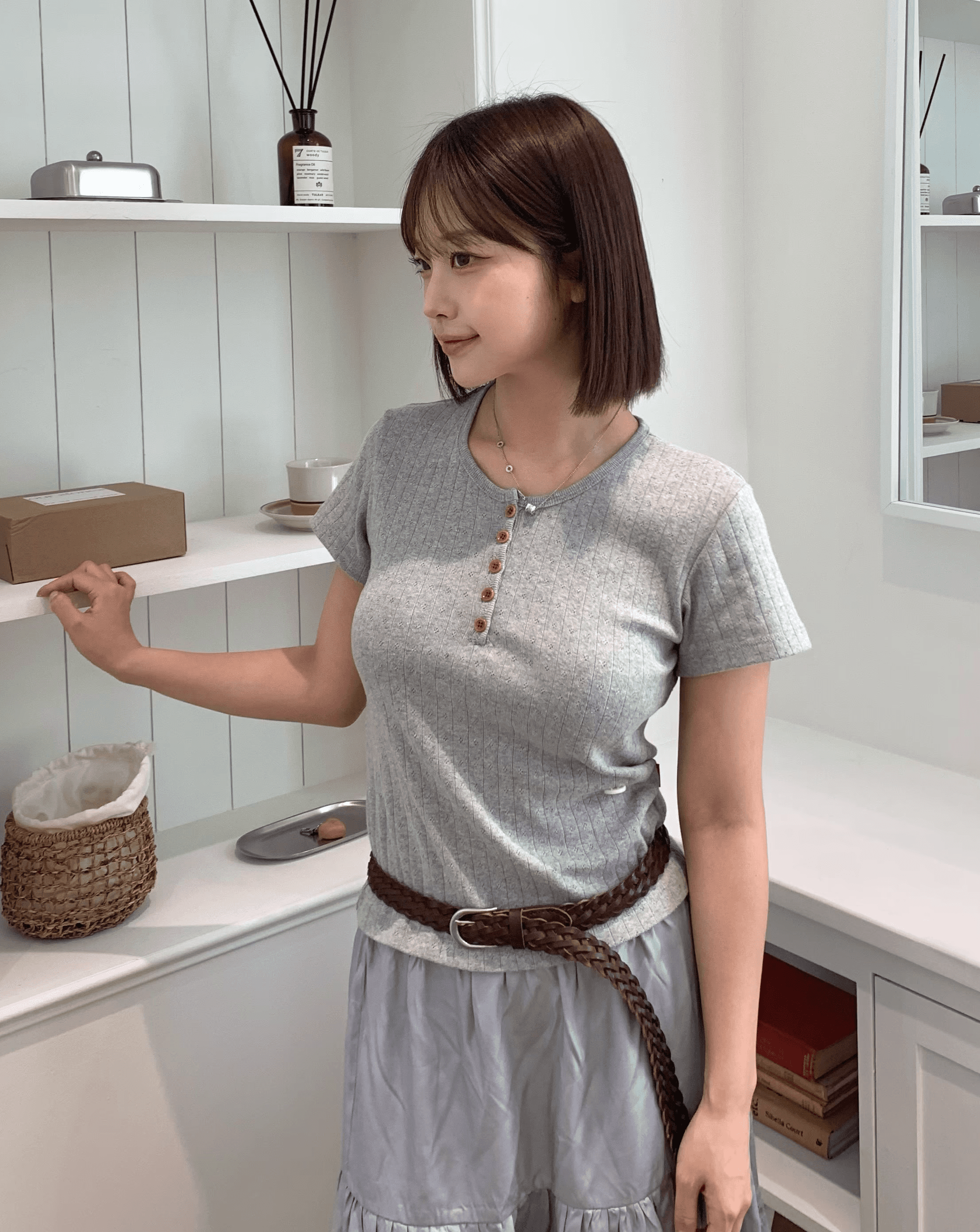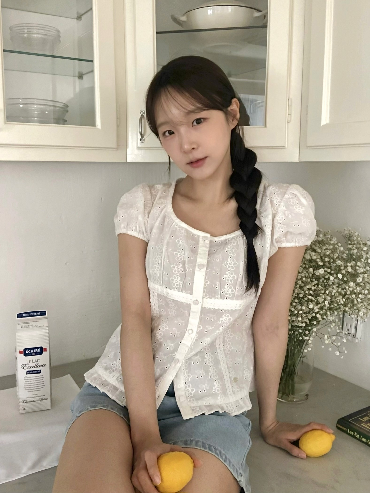 퍼프소매와 유넥 디테일이 특징인 여름 블라우스와 데님 쇼츠를 매치해 다가오는 여름 데일리 룩을 완성했습니다.