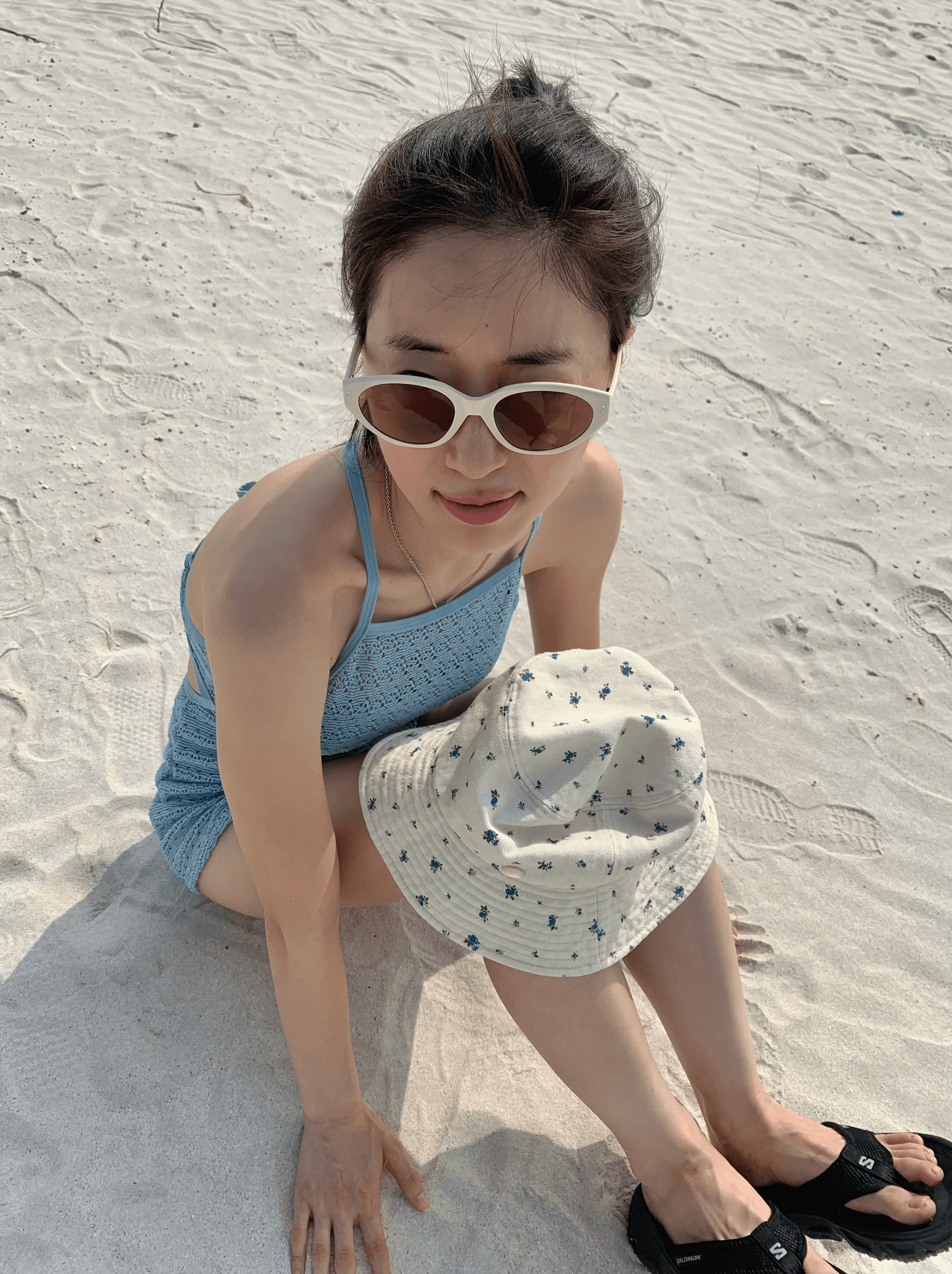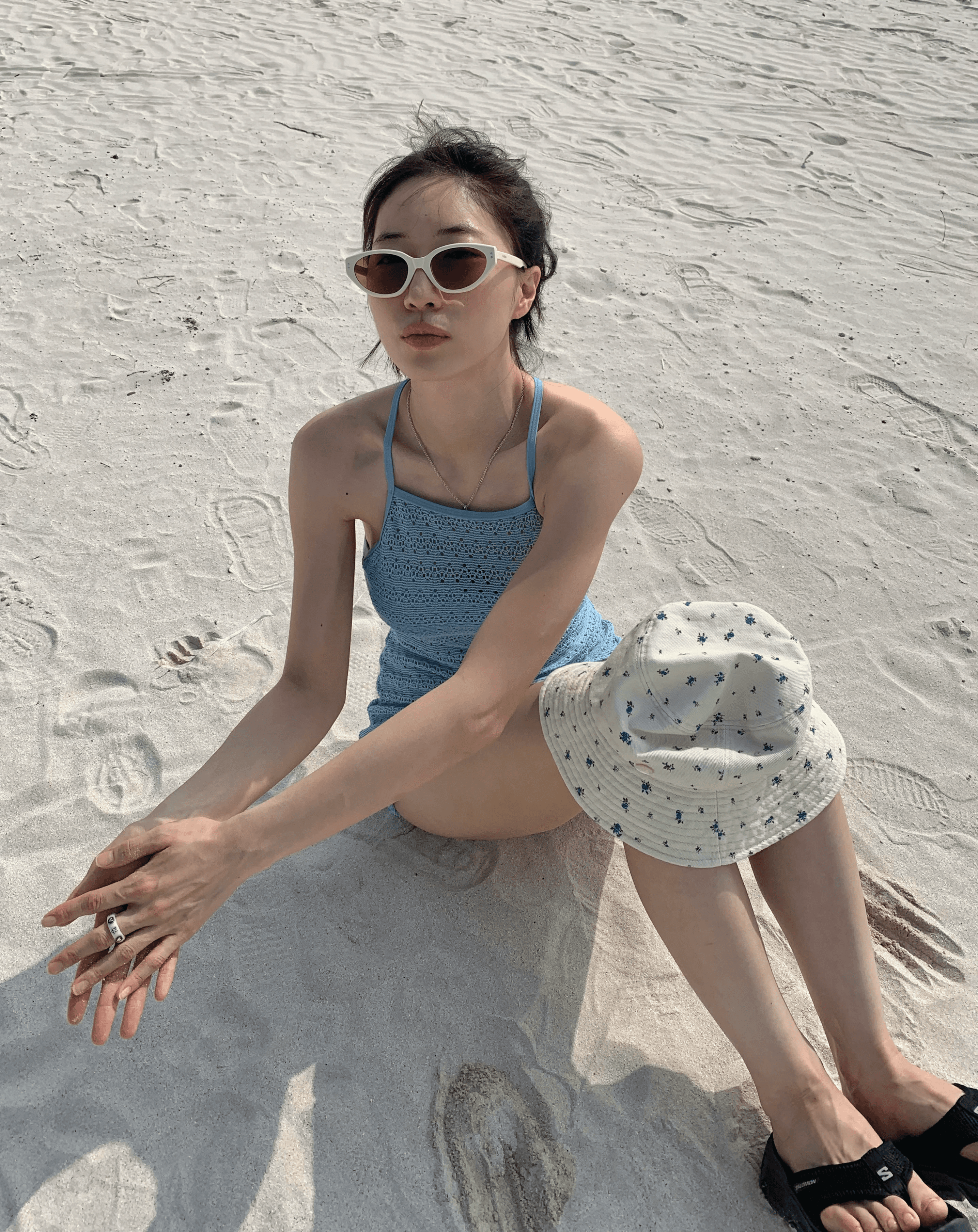 다채로운 색감과 사랑스러운 캐주얼을 즐긴다면, 코랄리크의 백스트링 크로셰 모노키니와 귀여운 꽃무늬 패턴이 포인트인 메르헨의 버킷햇을 착용해 보세요. 포인트로 카린의 아이보리 선글라스와 빈티지 레진 링까지 나만의 개성을 드러내 보세요.