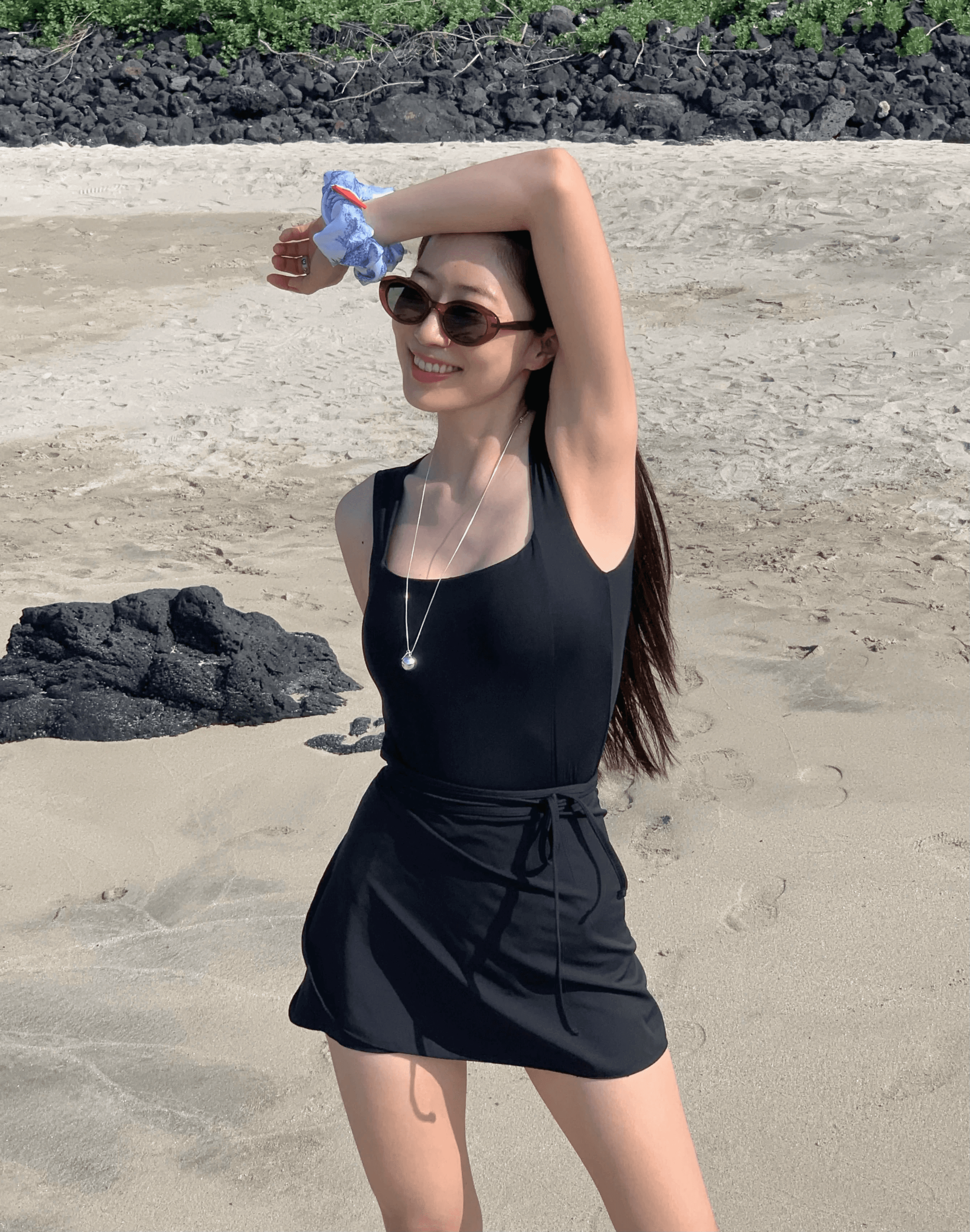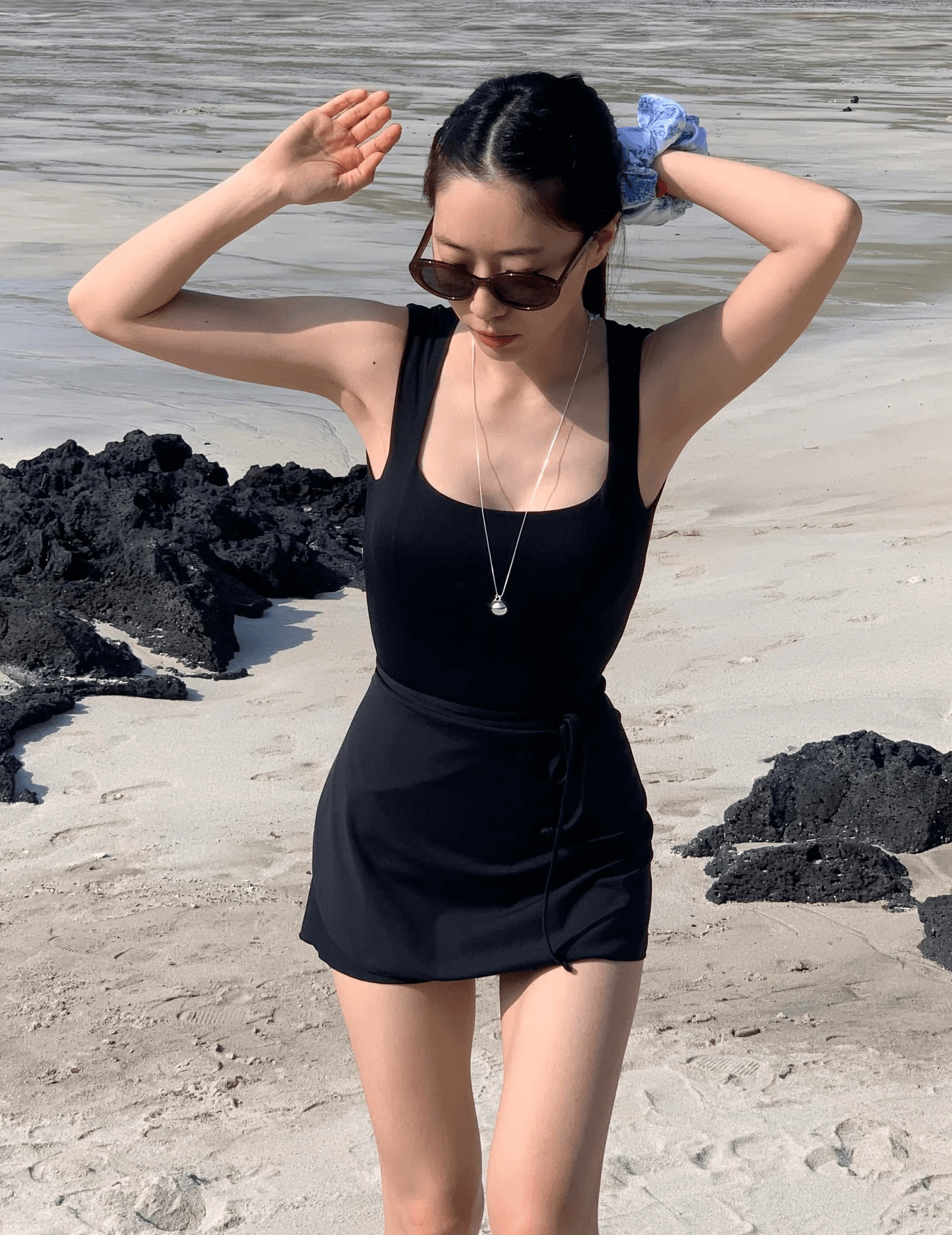 평소 우아한 룩을 즐긴다면, 비키니밴더의 넥 라인이 아름다운 블랙 모노키니와 커버업 스커트로 우아하게 실루엣을 드러내 보세요. 심플한 룩에 시선이 한번 더 갈 수 있도록 헤이의 실버 목걸이로 포인트를 주고, 부드러운 색상과 형태의 블루엘리펀트 선글라스로 완성해요.