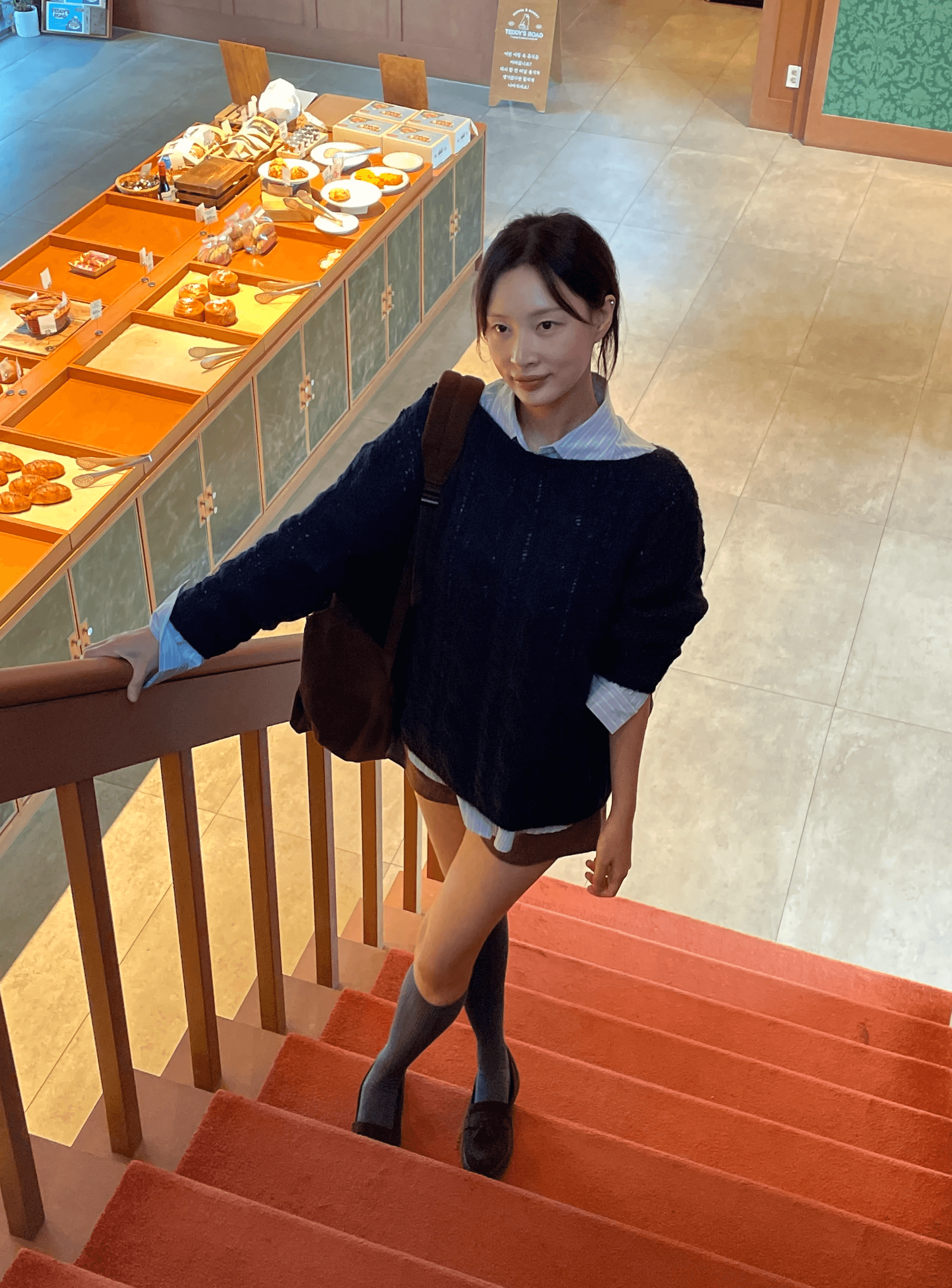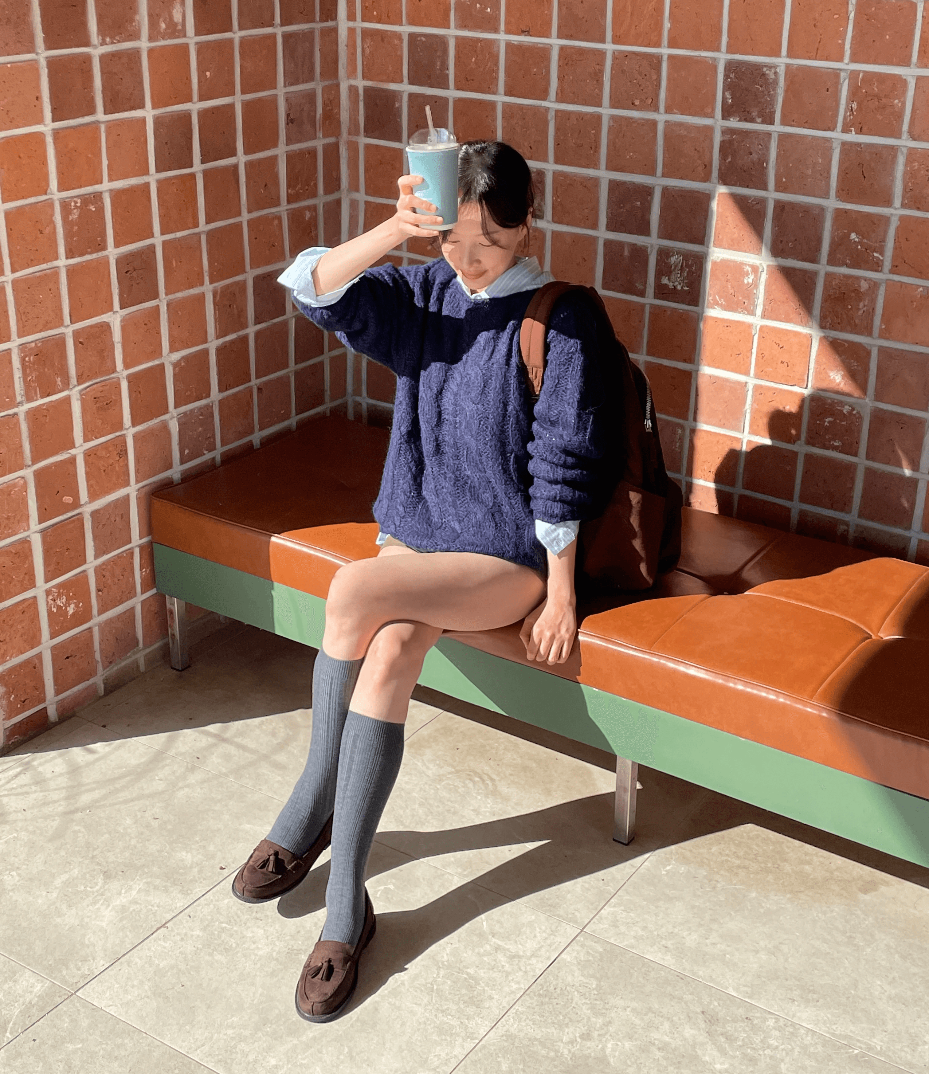 포근한 케이블 짜임과 헤이러한 소재감, 클래식한 실루엣이 돋보이는 시나몬 케이블 니트 스타일링이에요. 셔츠와 레이어드하여 클래식한 무드를 연출하거나 단독으로 착용하여 사랑스러운 무드를 다양하게 연출할 수 있어요.